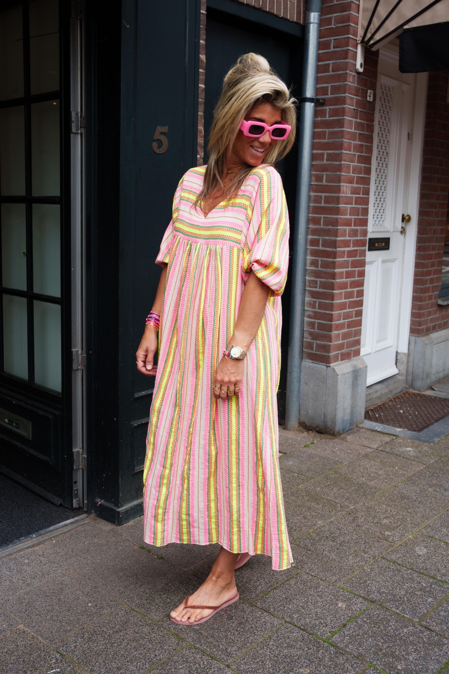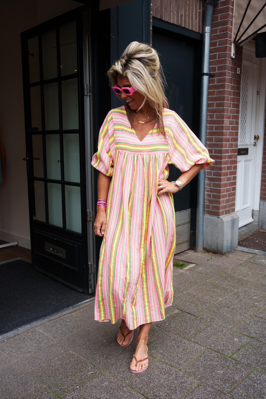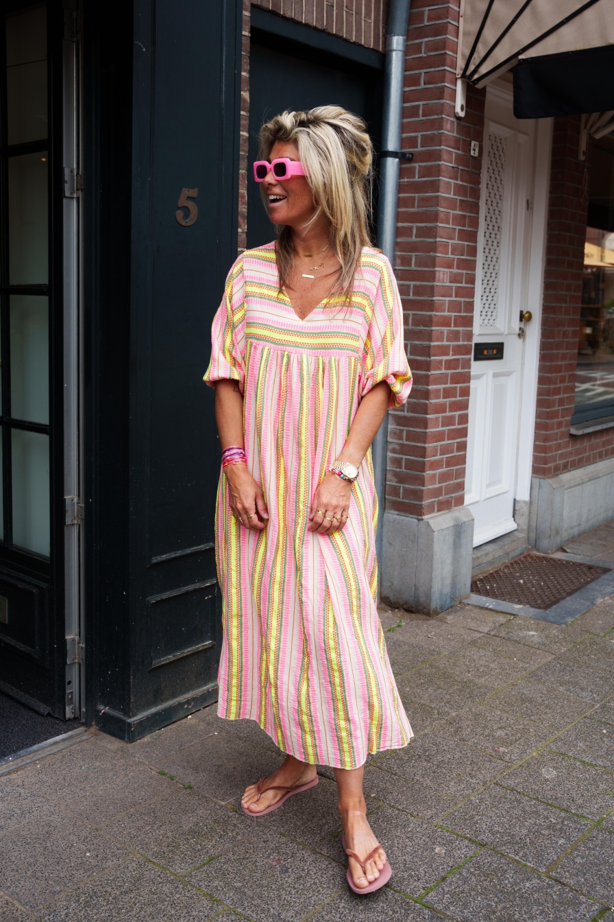 "Dress Estrella, dé zomerfavoriet! Gemaakt van 98% katoen voor een luchtig en comfortabel gevoel op warme dagen. Met zijn schattige pofmouwtjes en tijdloze design is deze jurk een must-have voor je zomergarderobe. Dit Onesize model draag je tot en met maat XL/44!