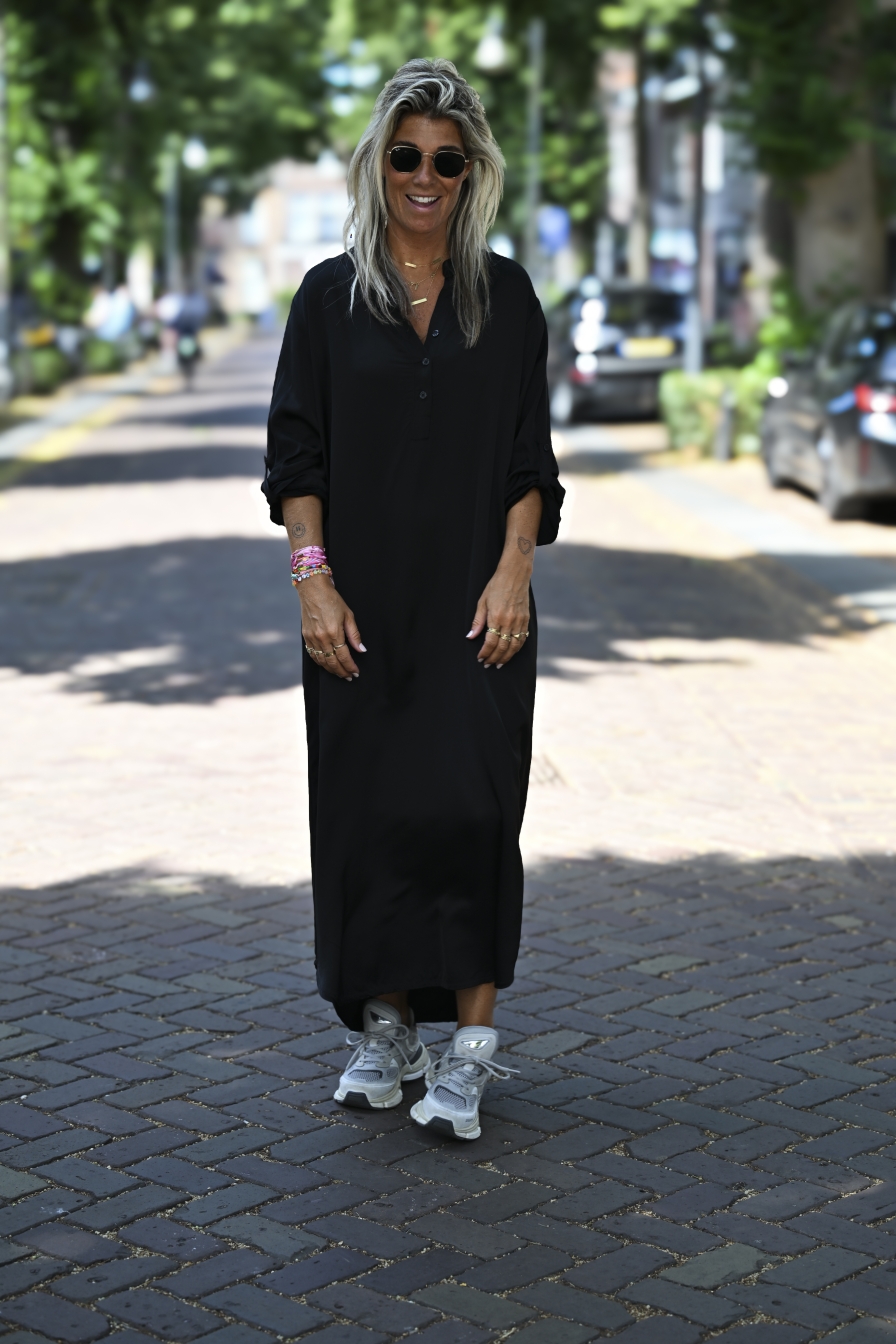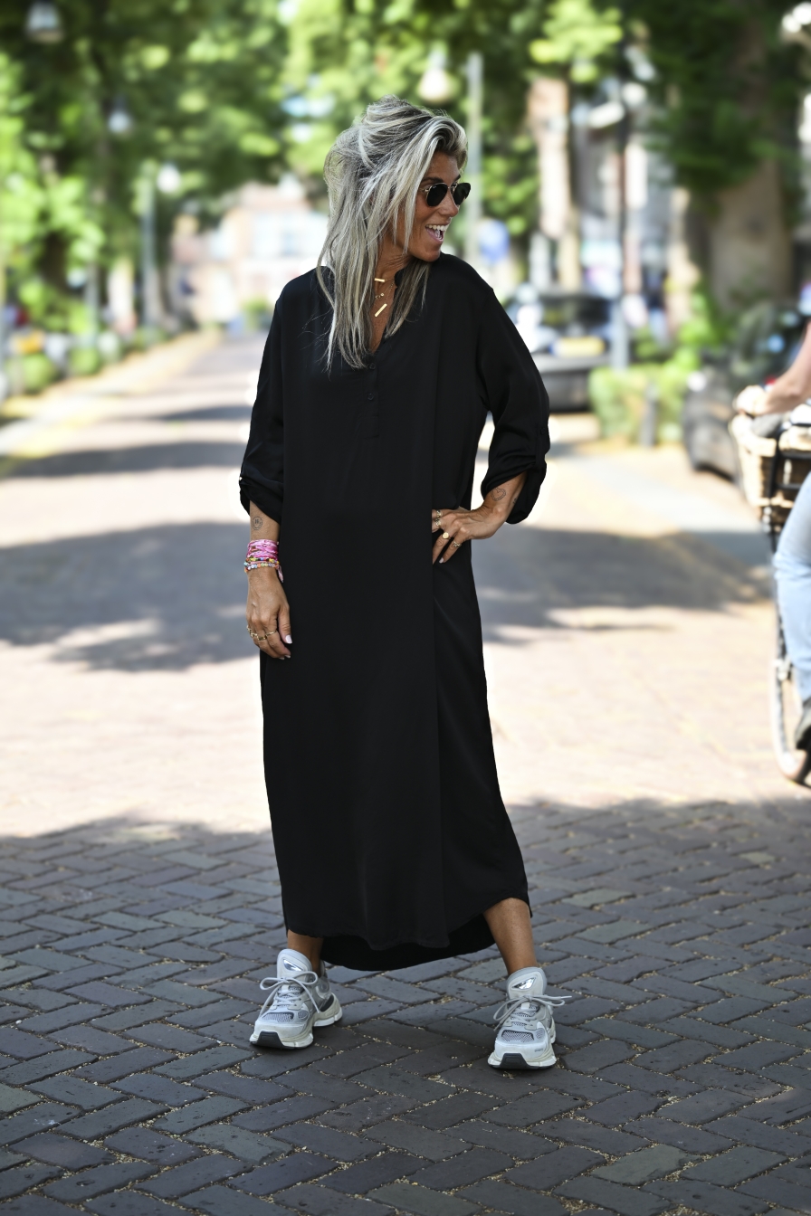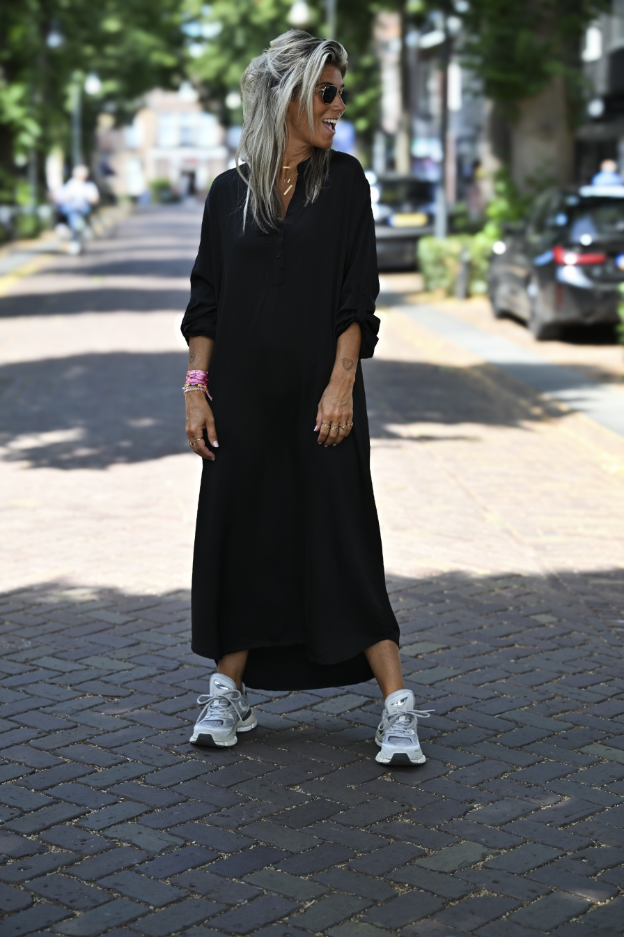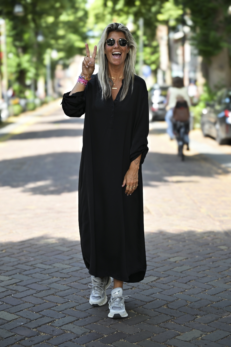 Dress Fieke is al vijf jaar een vertrouwde topper in onze summer collection, en dat is niet voor niets. De combinatie van viscose en rayonzijde zorgt voor een zijdezachte feel en een soepelvallend silhouet. De opgerolde mouwen geven de jurk een sportieve touch. Dit one-size model draag je comfortabel tot en met maat M/L, ik ben 1.76 lang.