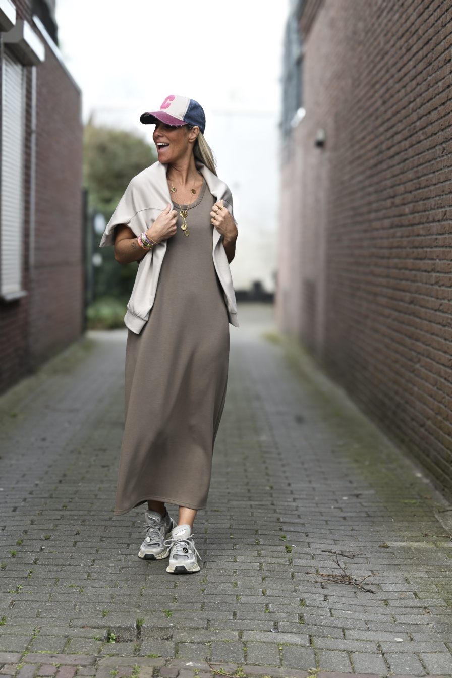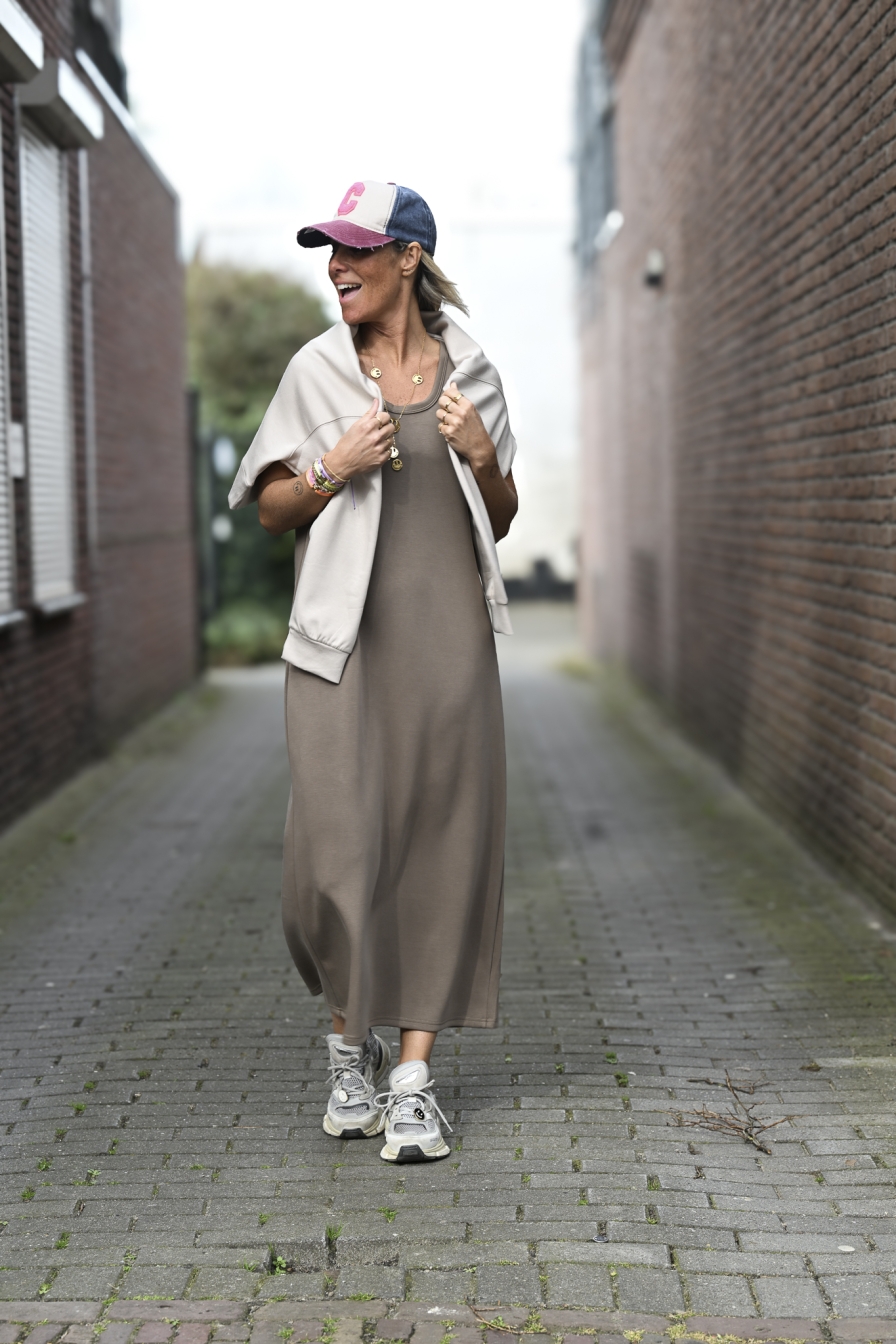 Dress Kimmy is gemaakt van een heerlijk zachte stof met stretch (50% rayon, 44% poly en 6% elastaan). Dit onesize model valt heerlijk comfortabel en is door de stretch draagbaar tot en met maat L/XL. Ik ben 1,76 m op de foto, zodat je aan de hand daarvan een beetje kunt inschatten hoe de lengte bij jou zal vallen.