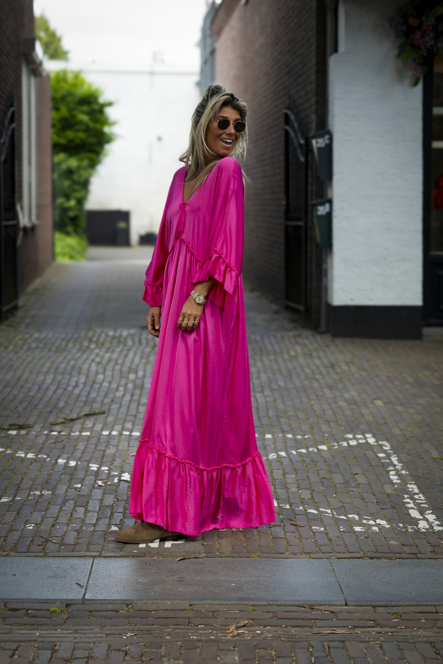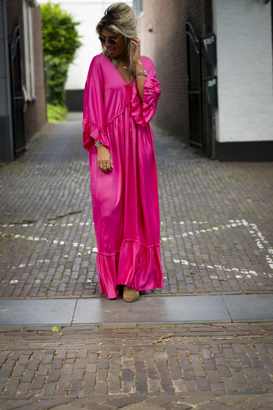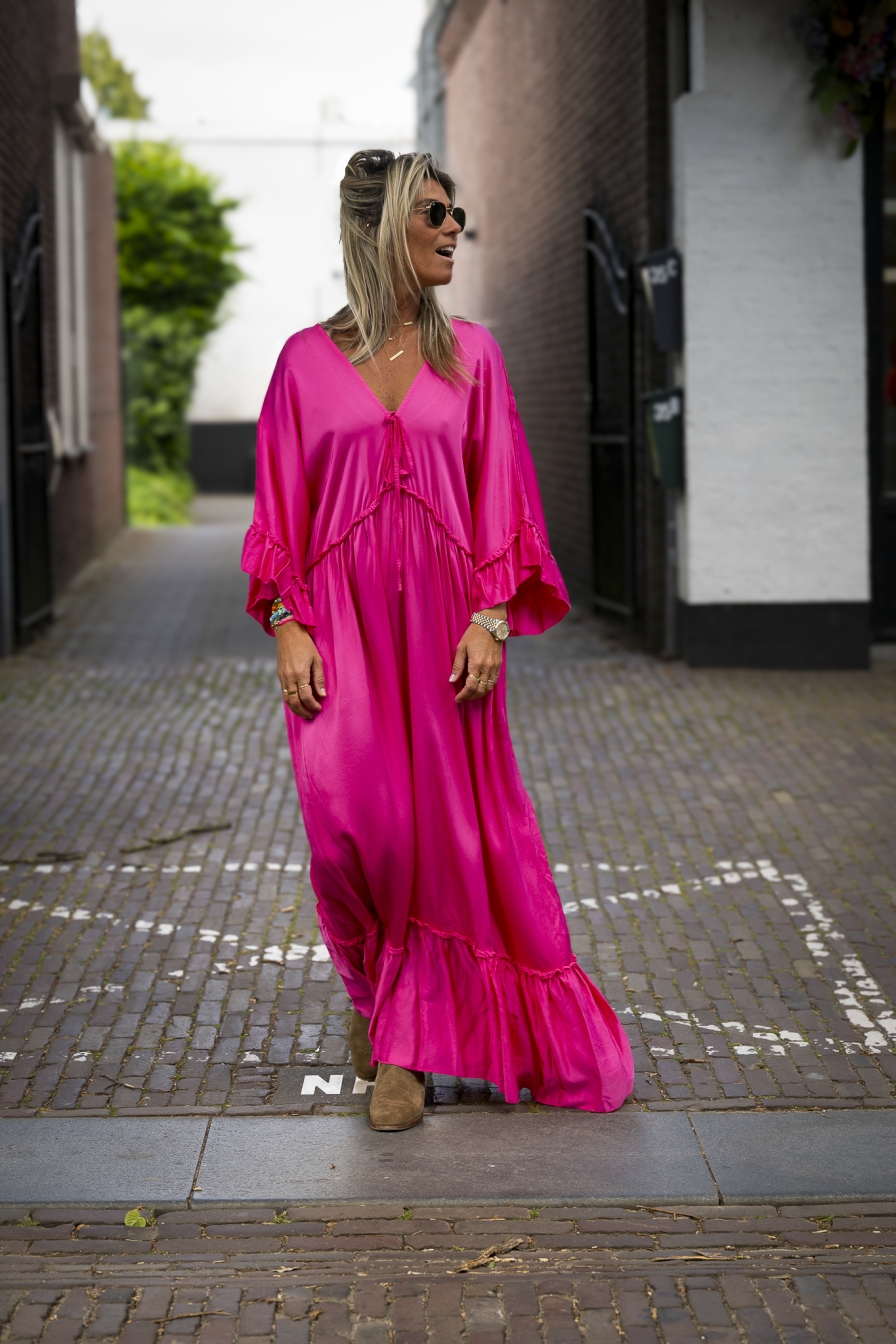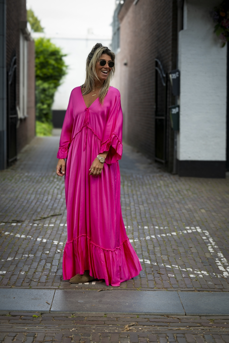 Dress Leanoor voelt zijdezacht aan en is gemaakt van een luxe mix van viscose en rayonzijde. De opvallende V-hals aan zowel de voor- als achterkant geeft een elegante touch, waarbij je de achterkant kunt strikken met een fijn koordje voor de perfecte fit. De losvallende, flatterende mouwen zorgen voor die heerlijke boho vibe. Dit one-size model draag je comfortabel tot en met maat L/XL , ik ben 1.76 lang.