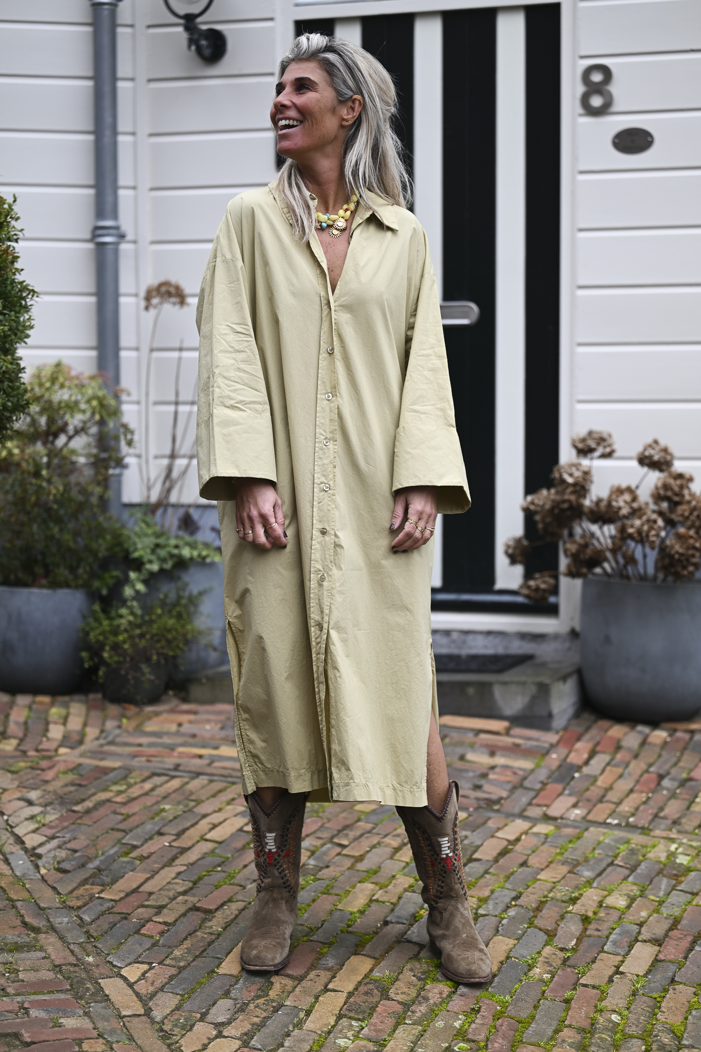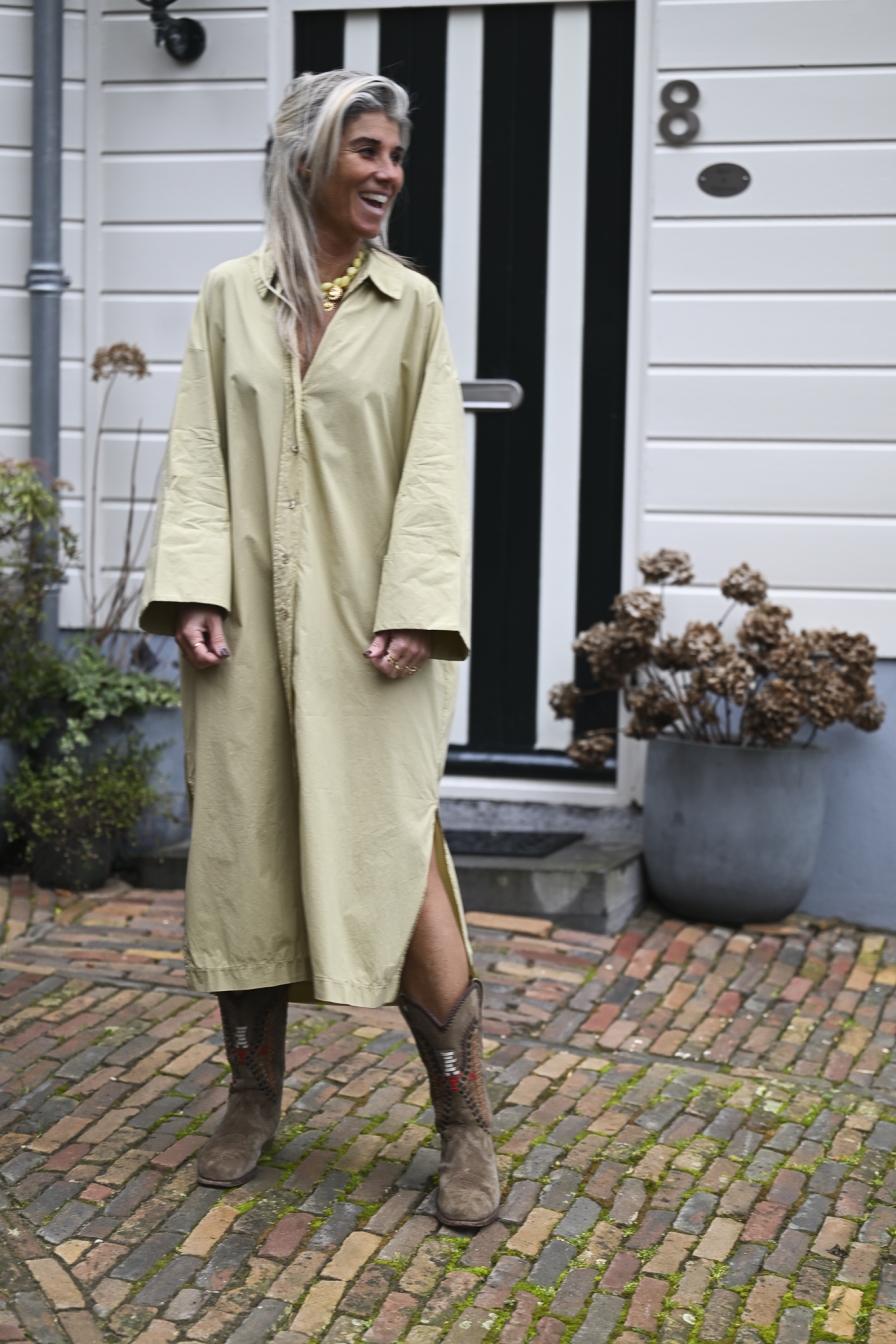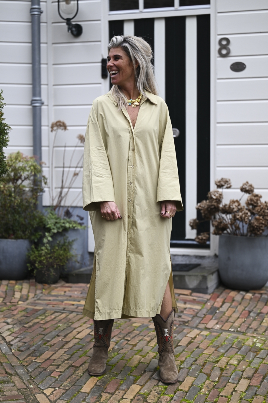 Deze doorknoopjurk met wijde mouwen is gemaakt van 100% katoen. Hij heeft twee splitjes voor extra bewegingsvrijheid en steekzakken voor een nonchalante look. Dit onesize loose fit model draag je tot en met maat XL/42.