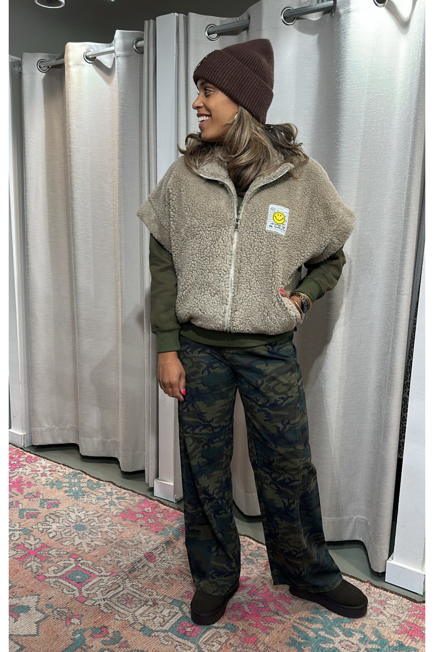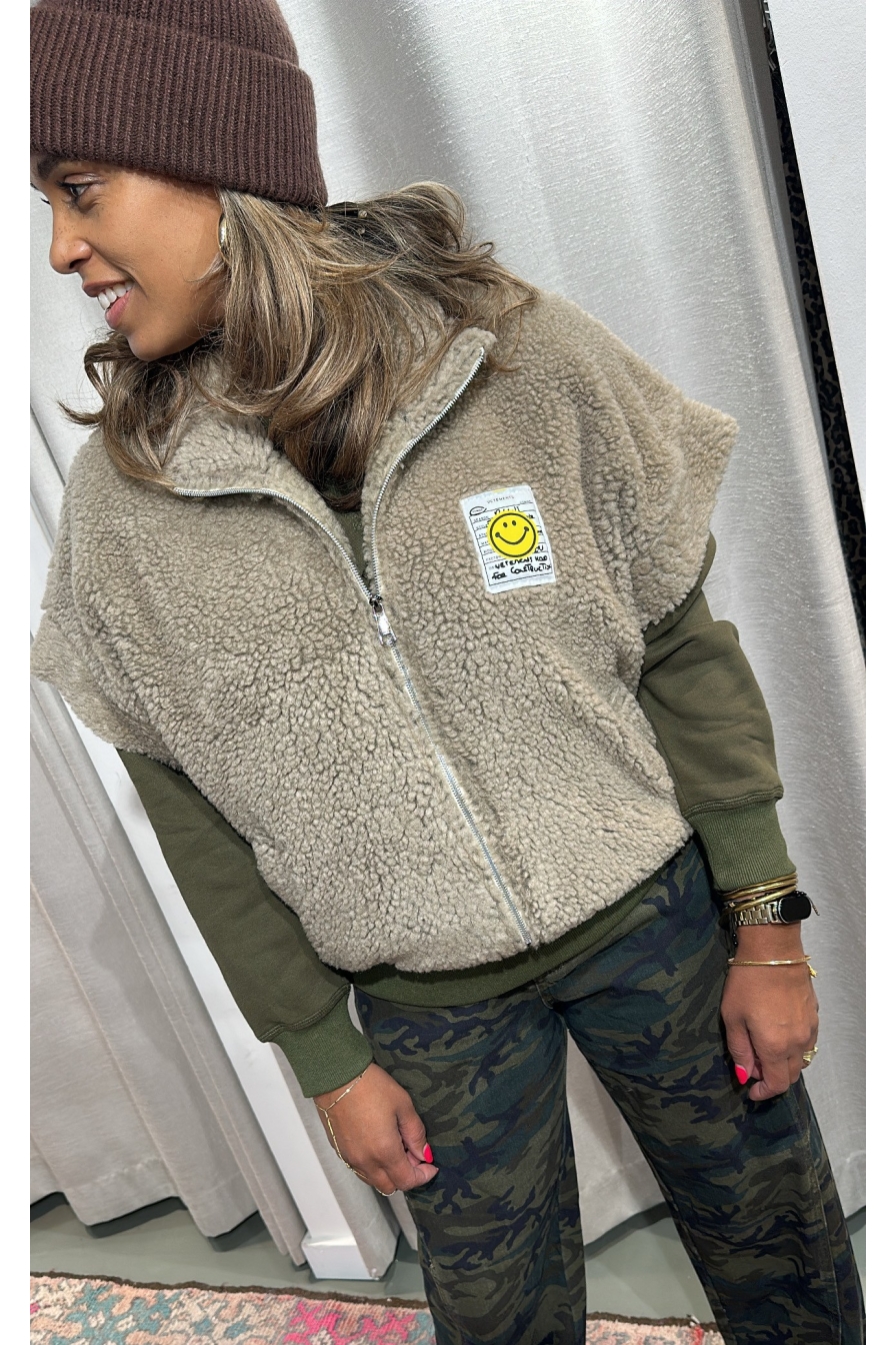 Kom maar door met deze heerlijke fluffy body met Smiley patch! Onesize model met stevige rits en handige zakken, draagbaar tot maat...