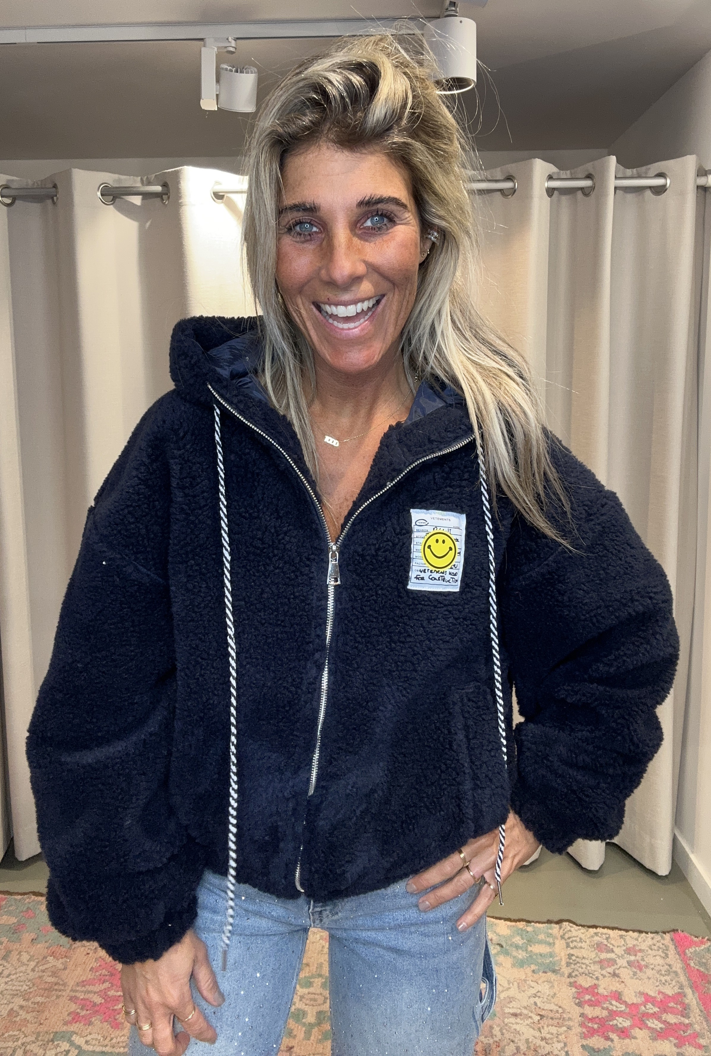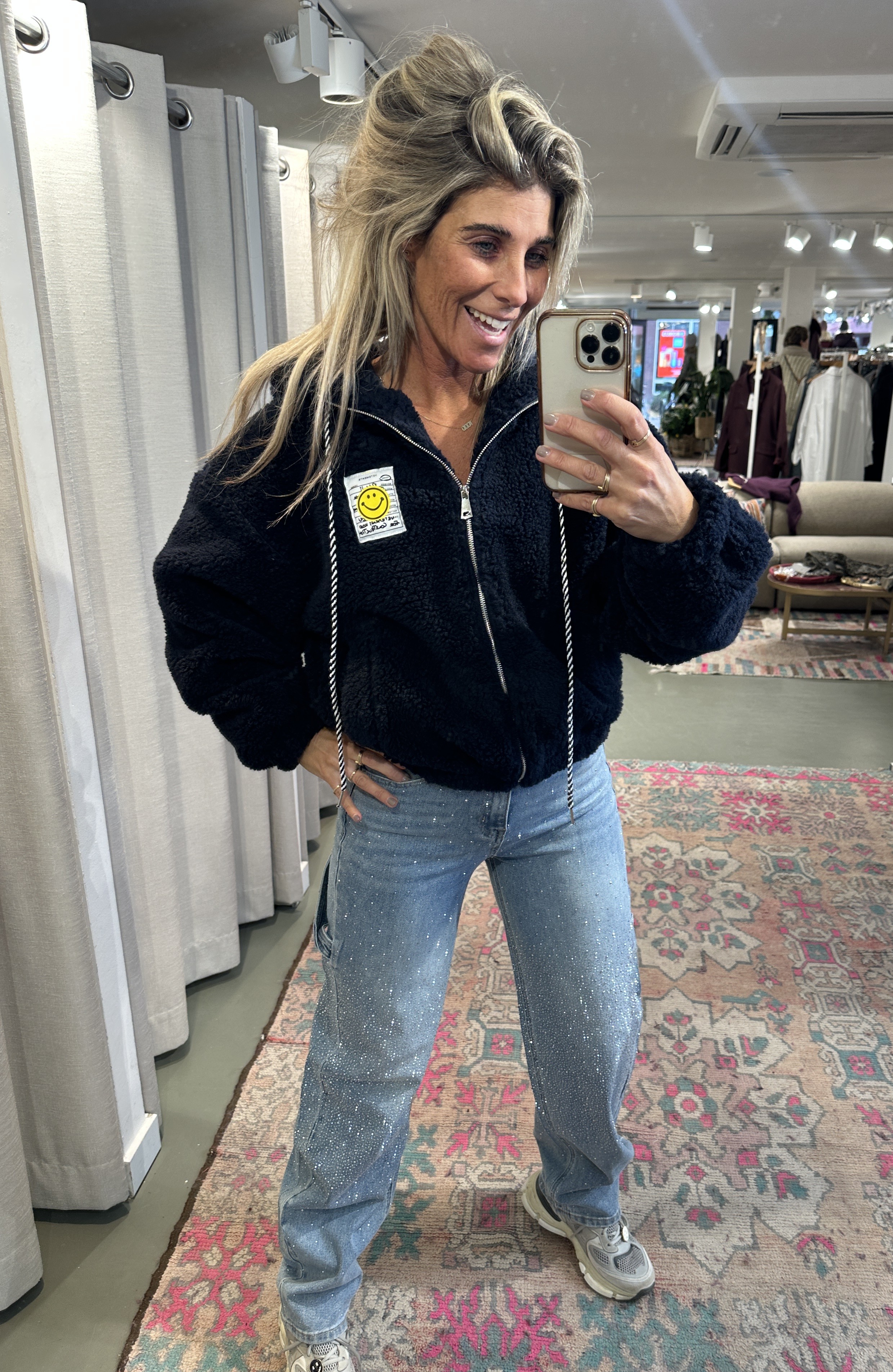 Kom maar door met dit heerlijke fluffy Jacket met Smiley patch! Onesize model met stevige rits en handige zakken, draagbaar tot maat L/XL