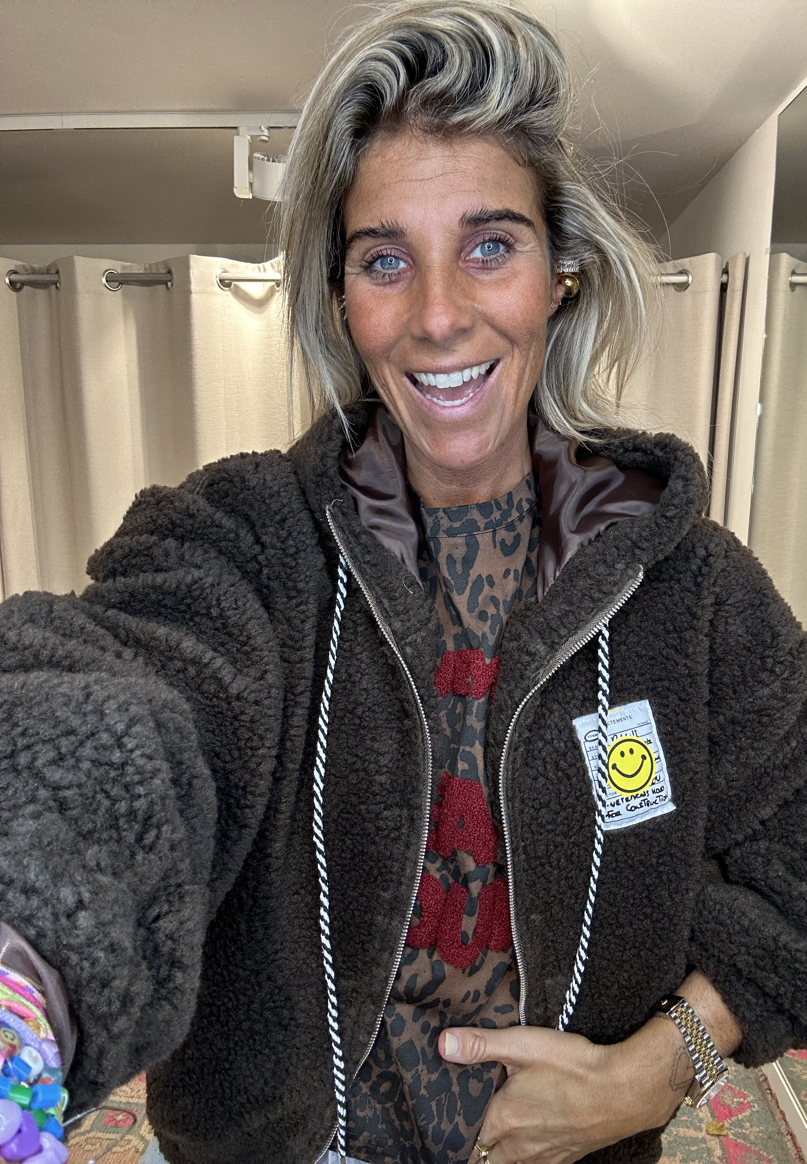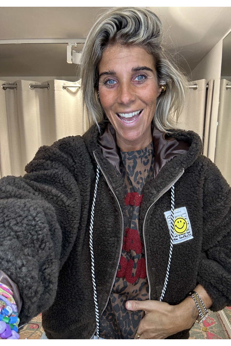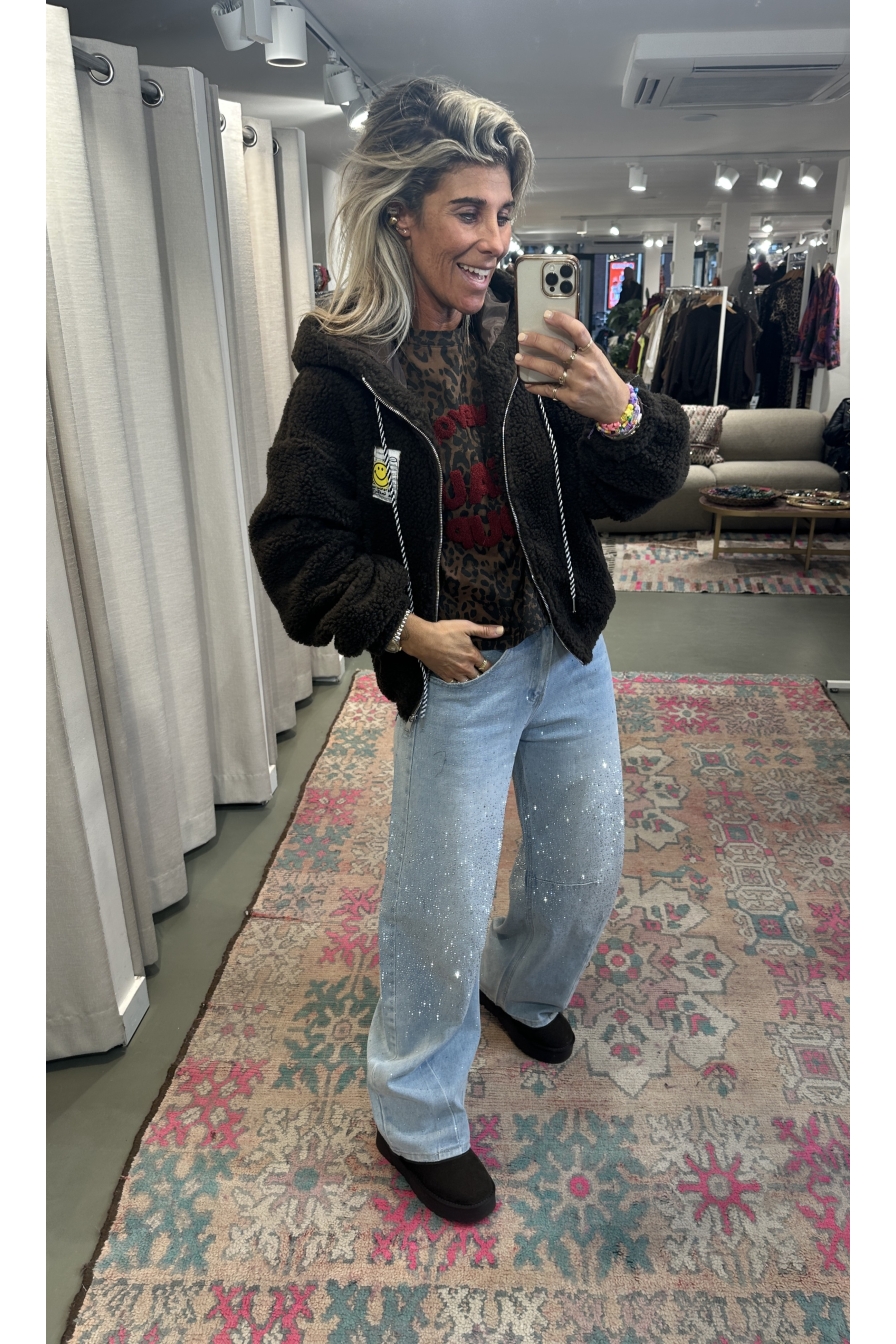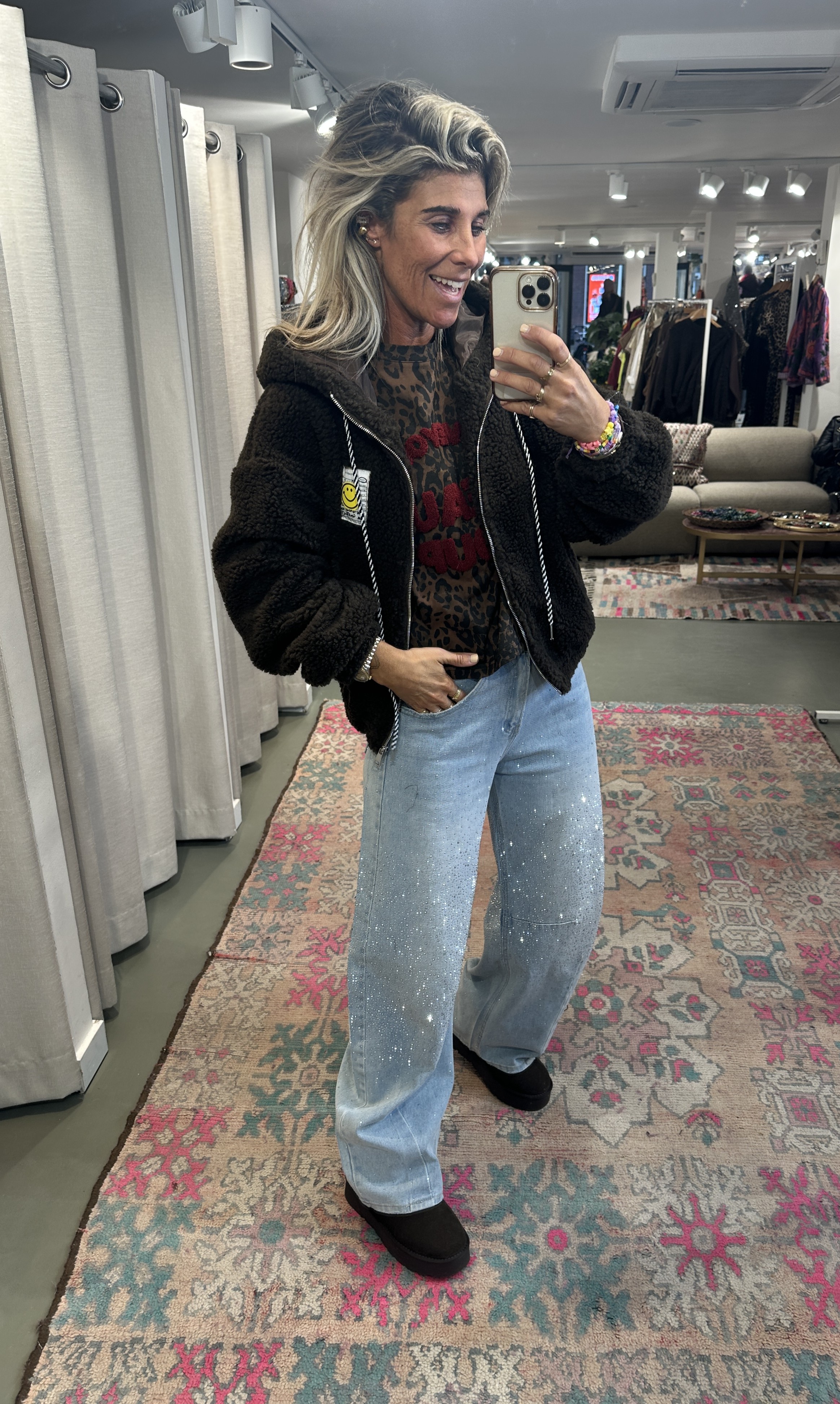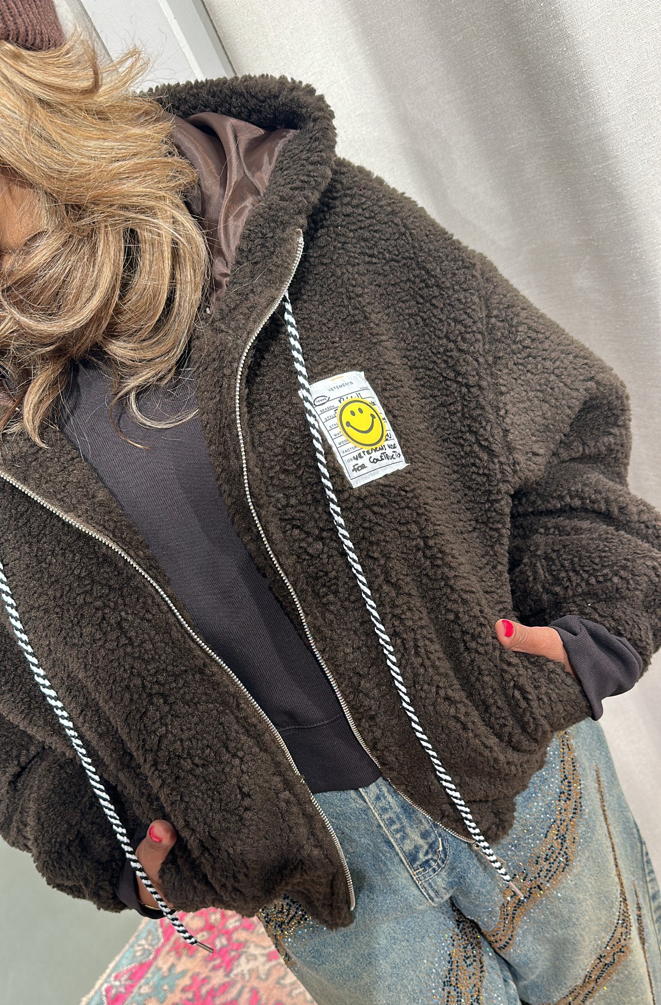 Kom maar door met dit heerlijke fluffy Jacket met Smiley patch! Onesize model met stevige rits en handige zakken, draagbaar tot maat...