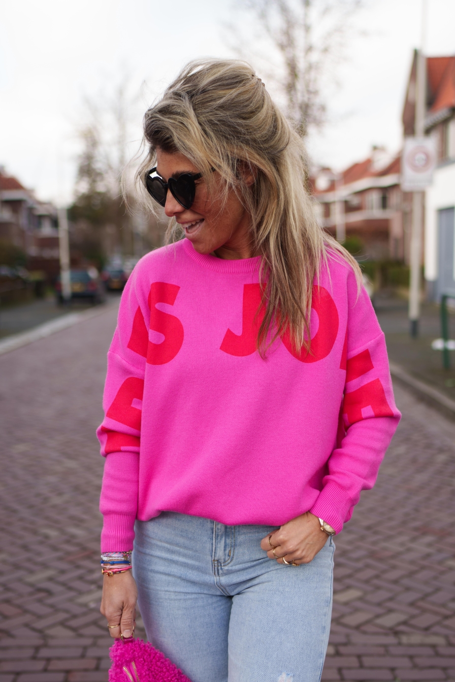 Fuchsia trui met "Tres Jolie" in rood op de armen en borst! Een super, stijlvolle combinatie van kleuren voor een opvallende look. 60%Viscose 30%Poly 10%Elastane