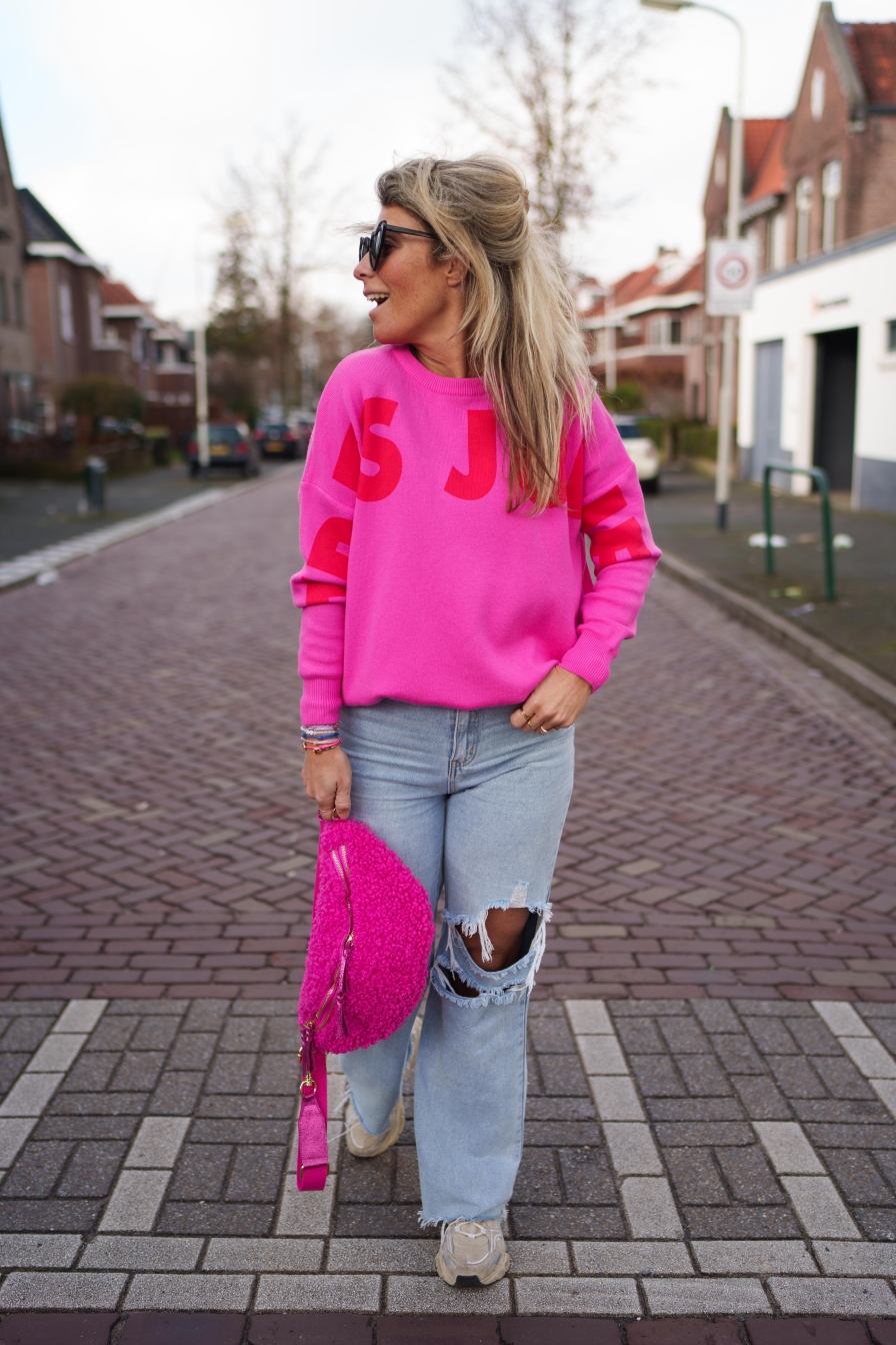 Fuchsia trui met "Tres Jolie" in rood op de armen en borst! Een super, stijlvolle combinatie van kleuren voor een opvallende look....
