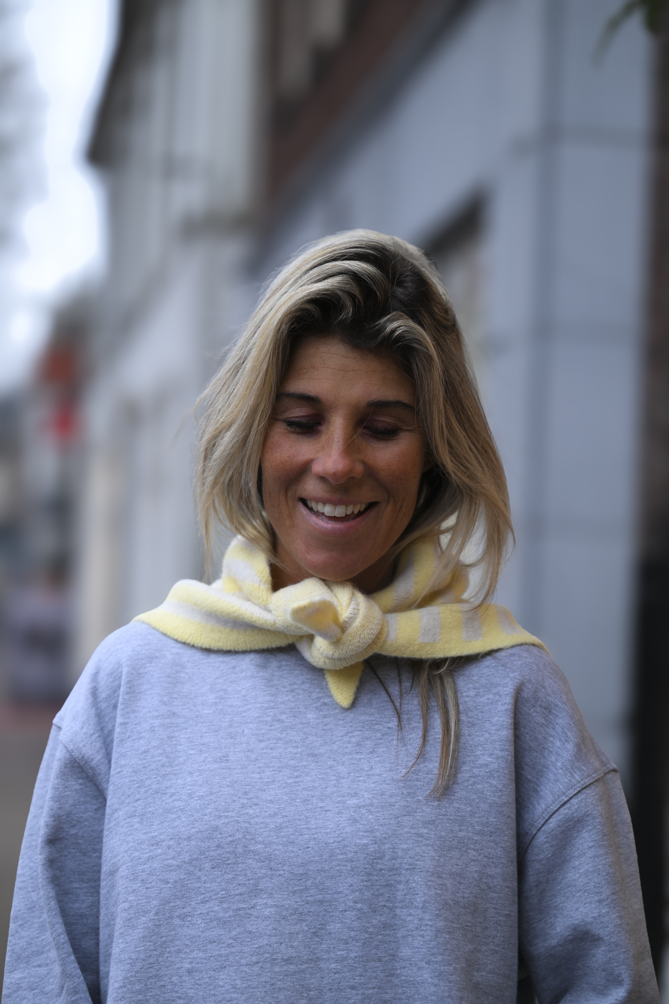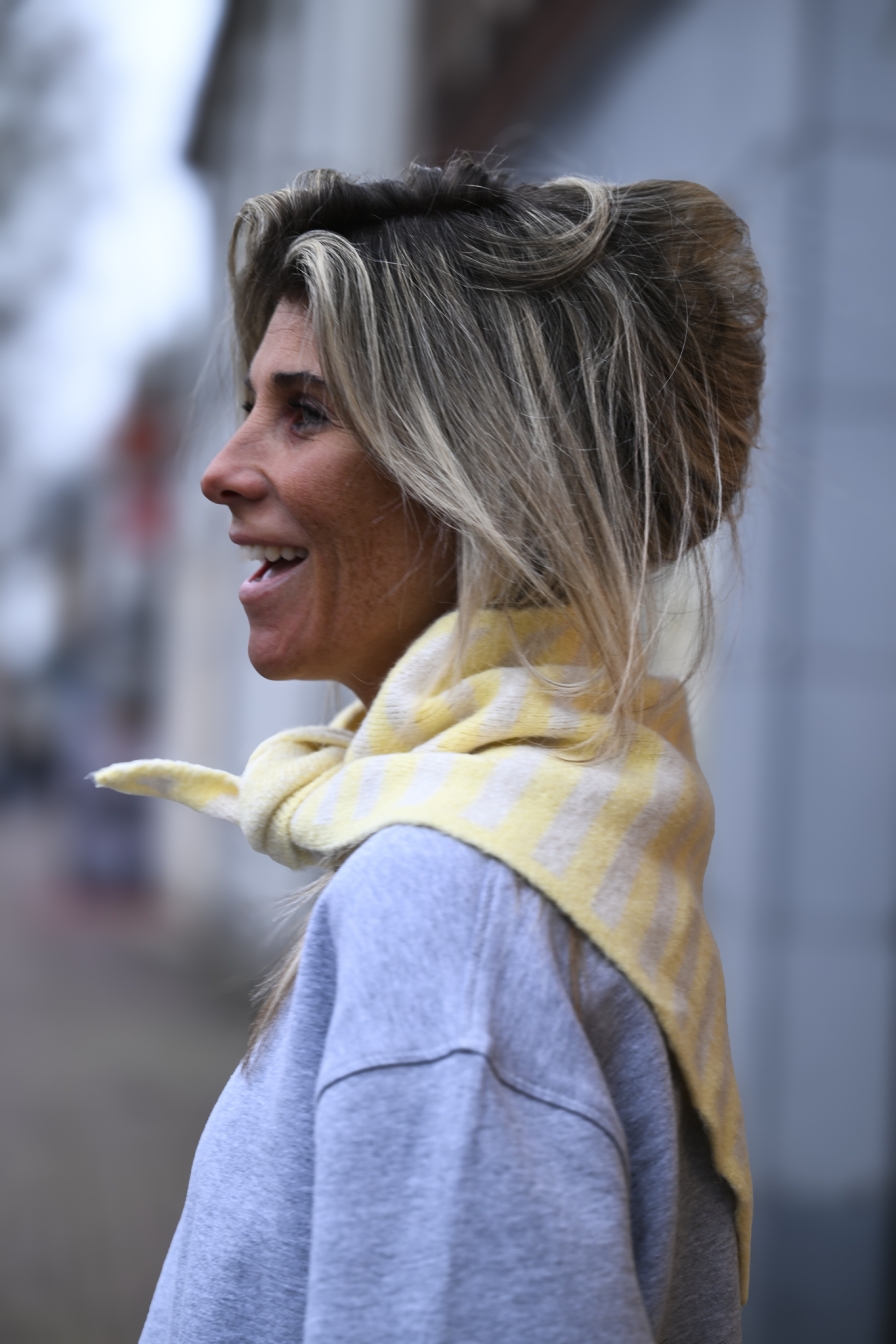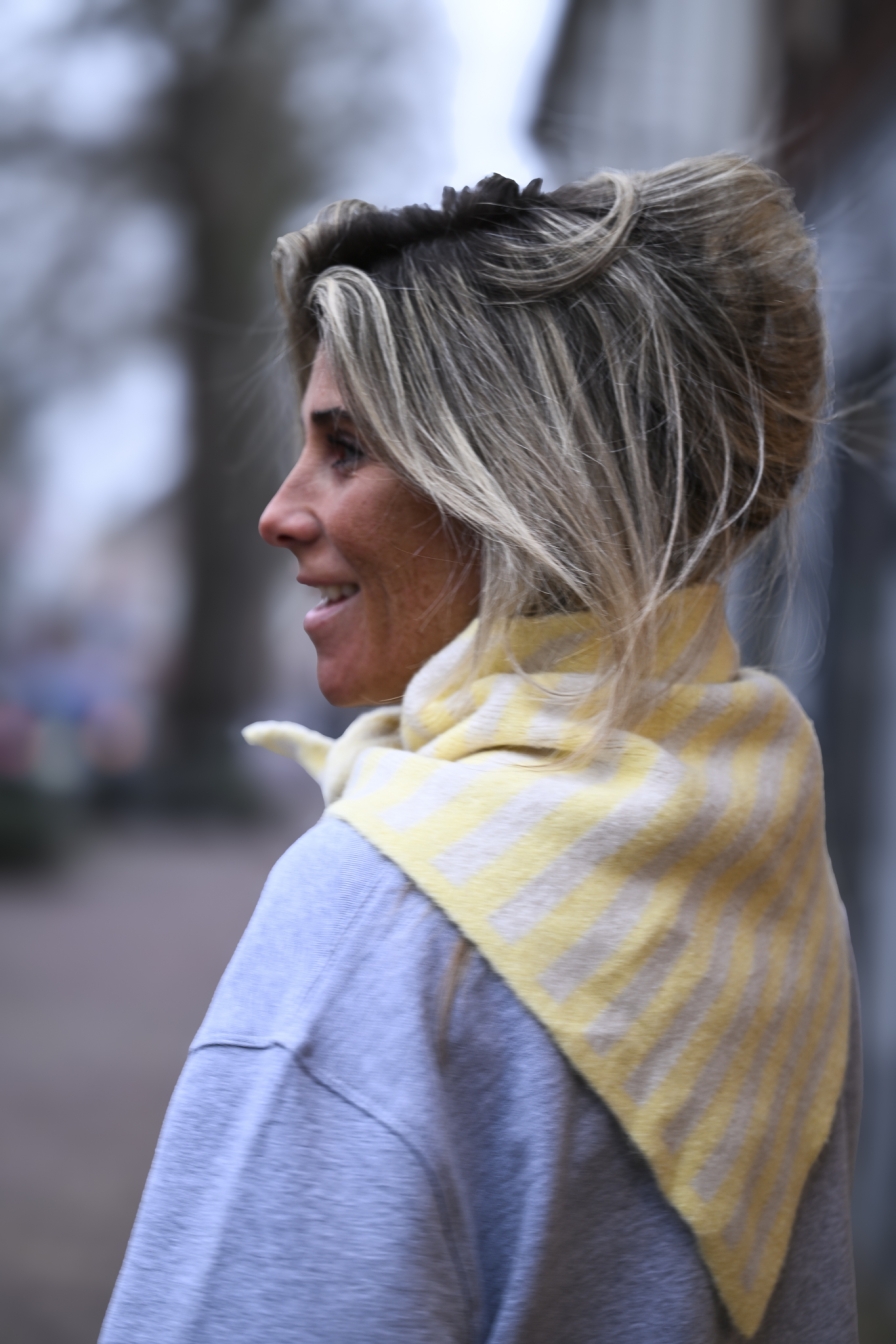 Next level vibes! Driehoekige sjaal in beige vs geel, zacht, warm en onesize – helemaal van nu.