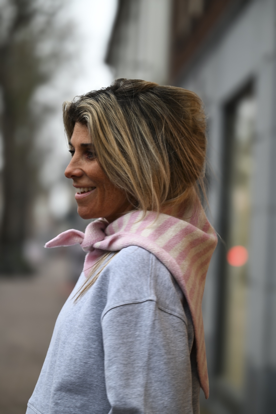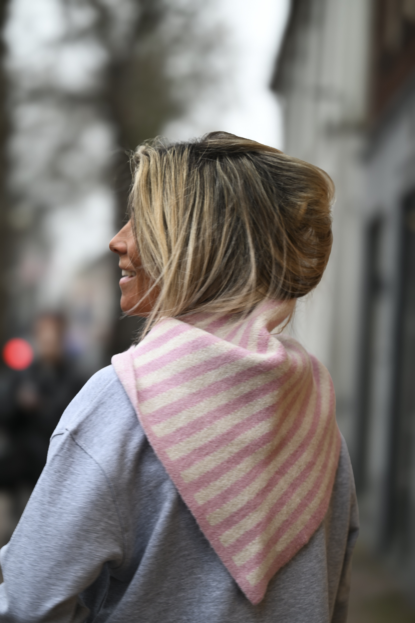 Next level vibes! Driehoekige sjaal in beige vs roze zacht, warm en onesize – helemaal van nu.