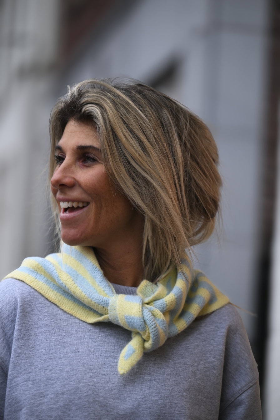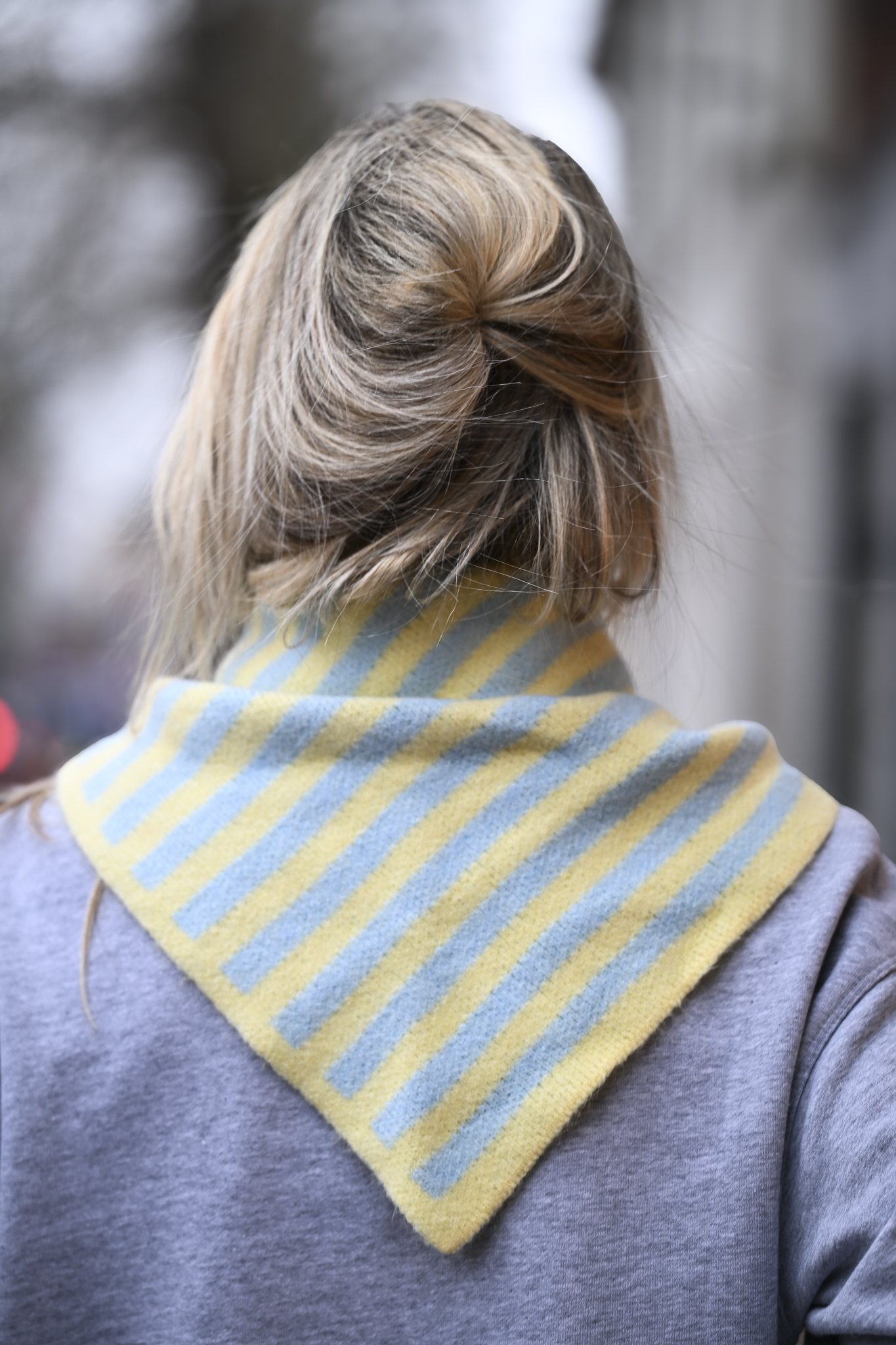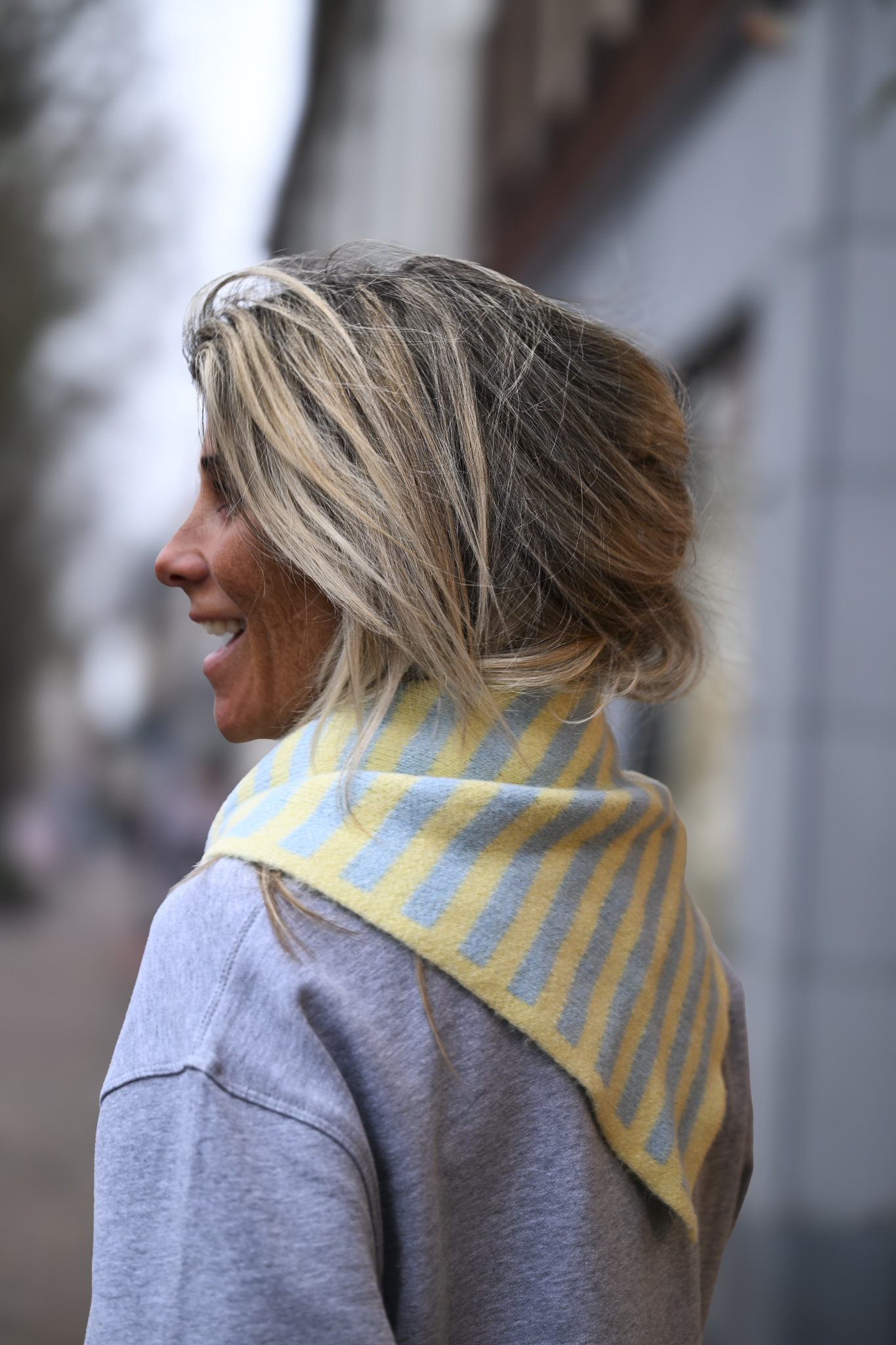 Next level vibes! Driehoekige sjaal in lichtblauw vs geel, zacht, warm en onesize – helemaal van nu.