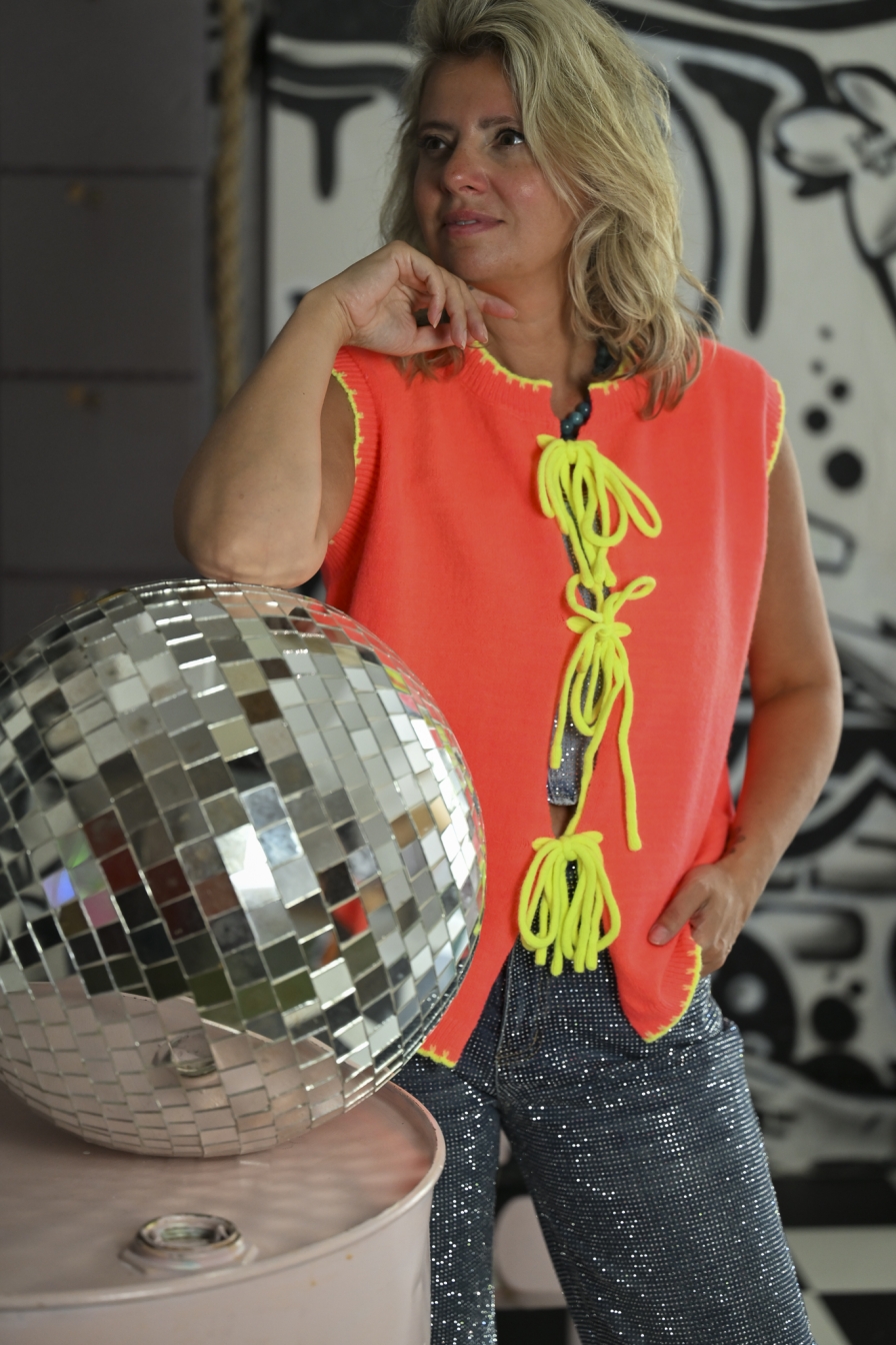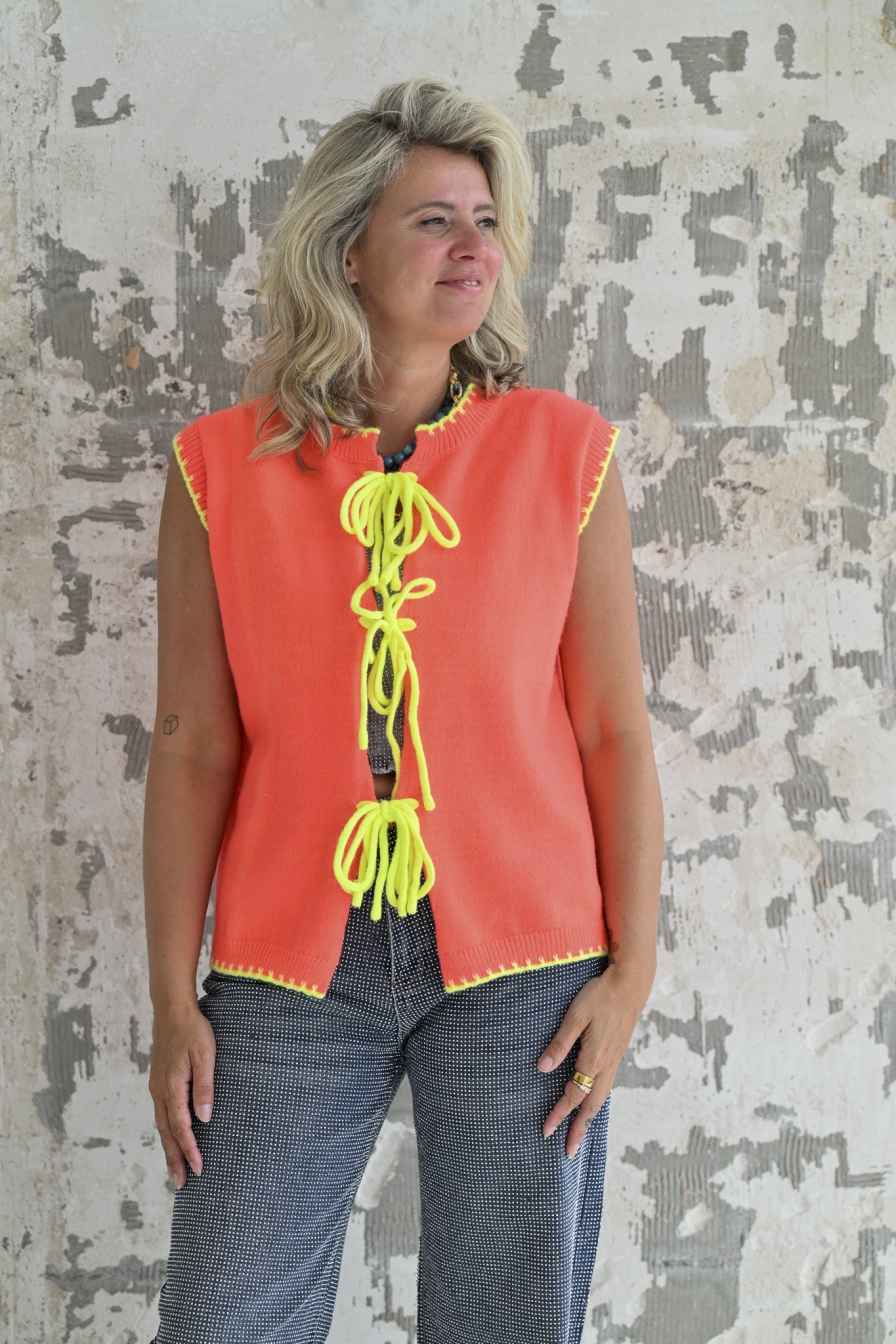 Gilet Geo is een opvallend gilet, afgewerkt en sluitbaar met drie gele strikken. Dit one-size model draag je tot en met maat L/XL en bevat 15% wol.