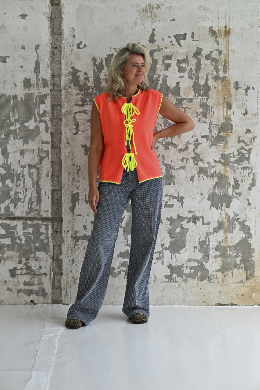 Gilet Geo is een opvallend gilet, afgewerkt en sluitbaar met drie gele strikken. Dit one-size model draag je tot en met maat L/XL en...