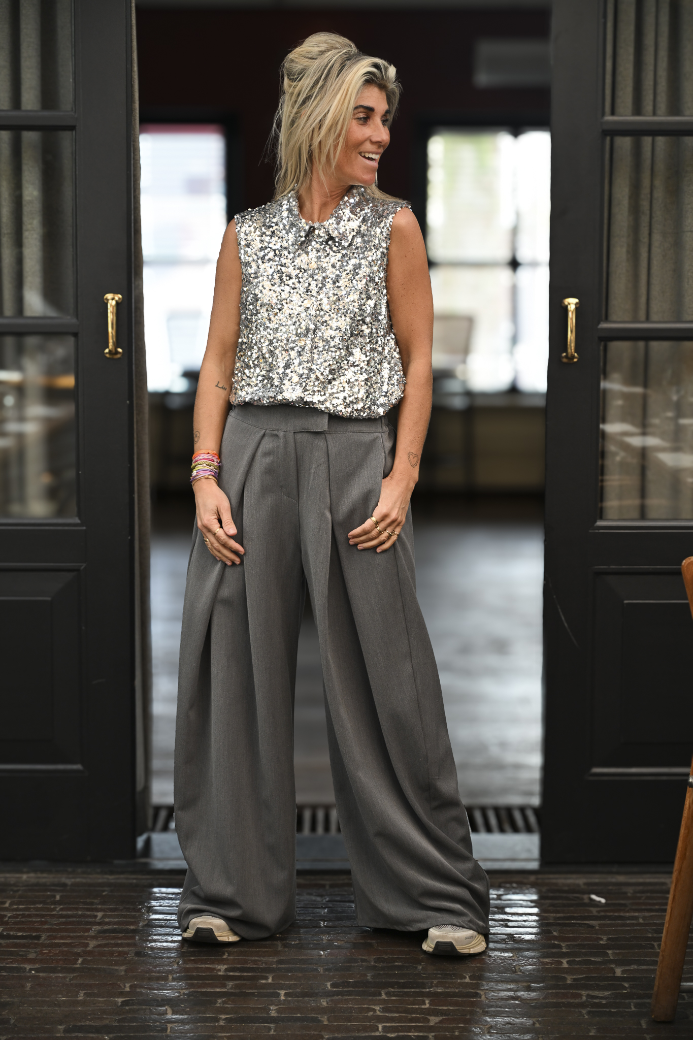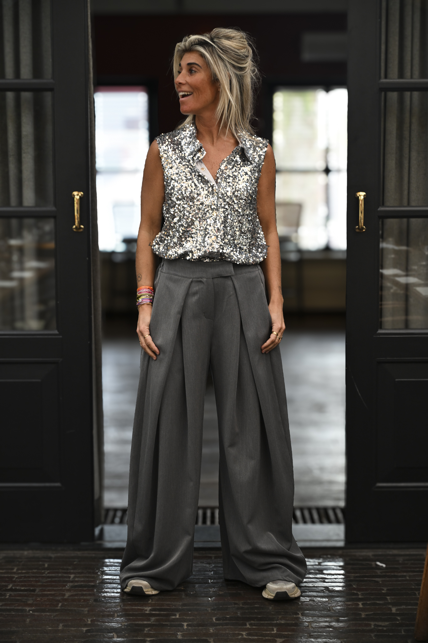 What can I say! Glitter en glamour, dat is dit mouwloze blousje. Het heeft stevige drukknopen en valt supermooi, mede door het gewicht van de pailletten. Ik draag maat S/M op de foto en ben 1,76 m lang.