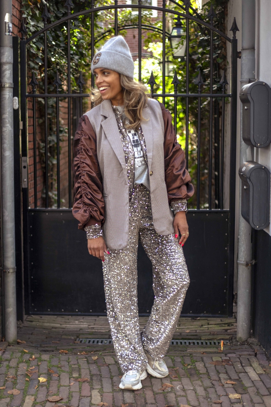 Deze velvet pantalon met glinsterende pailletten is een echt statement piece! De stof is gevoerd waardoor je de goed afgewerkte pailletten niet voelt. Broek heeft een stevige elastische band voor extra comfort. De perfecte mix van glamour en draagbaarheid. Het model op de foto is 1.72m en draagt maat M.