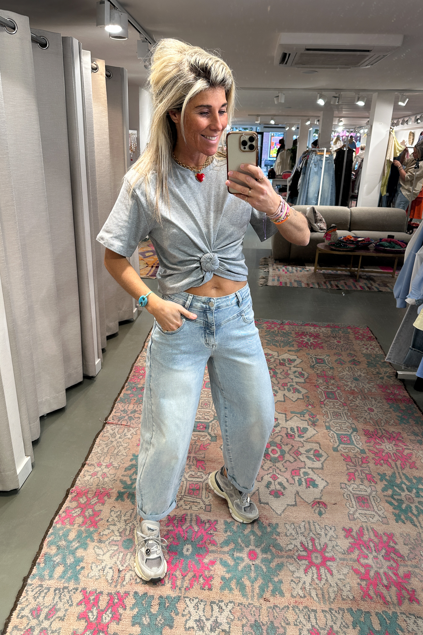 De Hope Top is echt zo’n item dat je outfit meteen een upgrade geeft! Verkrijgbaar in maat S/M en M/L. Op de foto draag ik maat S/M en ben ik 1,76 m lang. De knoop aan de voorkant zit stevig vast en zorgt voor een speelse, licht cropped look. Gemaakt van 100% katoen en heeft een heerlijke pasvorm