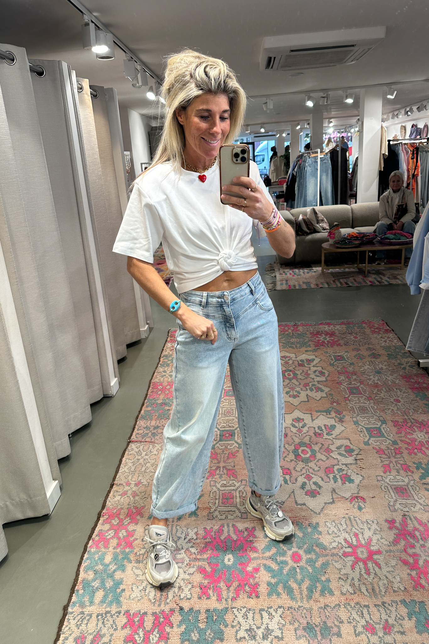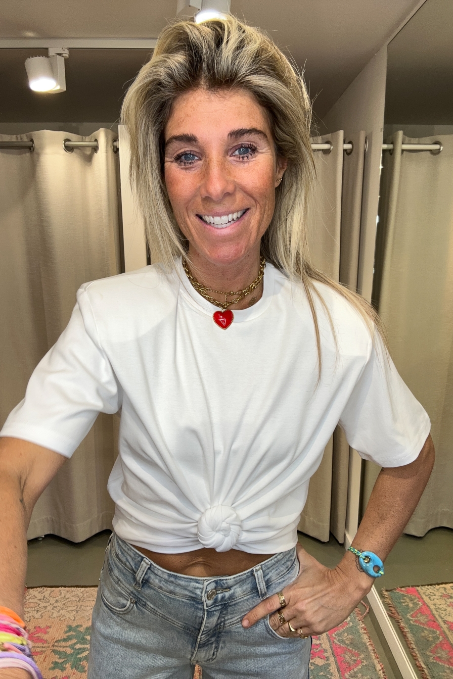 De Hope Top is echt zo’n item dat je outfit meteen een upgrade geeft! Verkrijgbaar in maat S/M en M/L. Op de foto draag ik maat S/M en ben ik 1,76 m lang. De knoop aan de voorkant zit stevig vast en zorgt voor een speelse, licht cropped look. Gemaakt van 100% katoen en heeft een heerlijke pasvorm