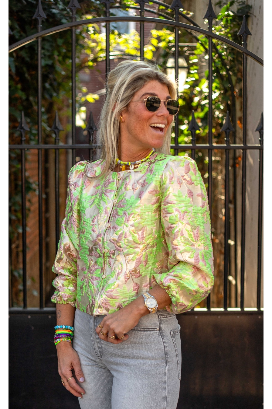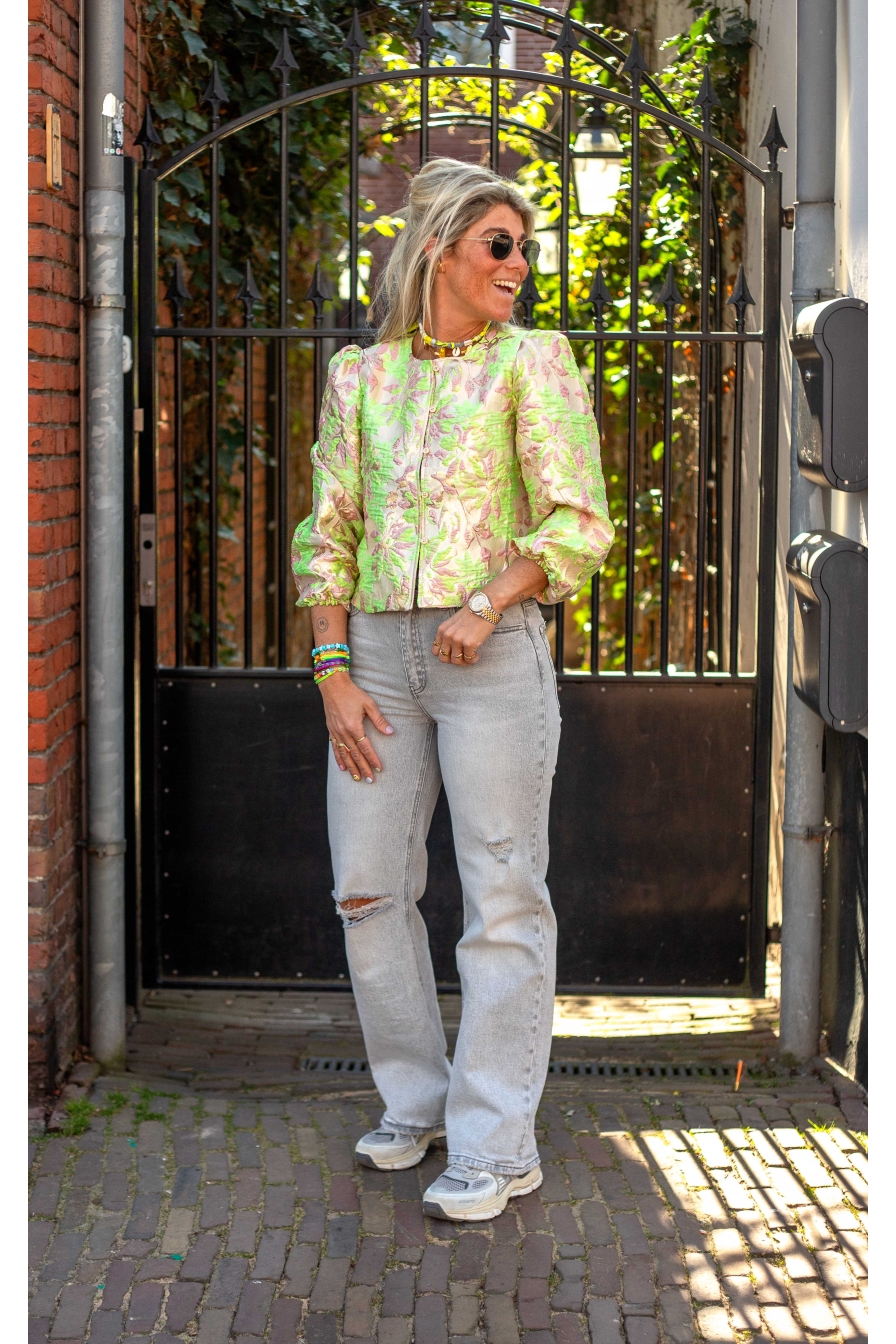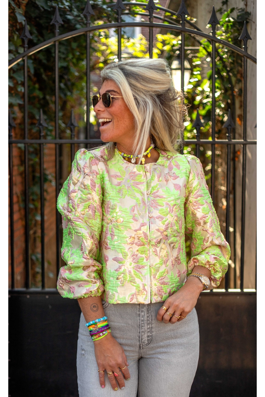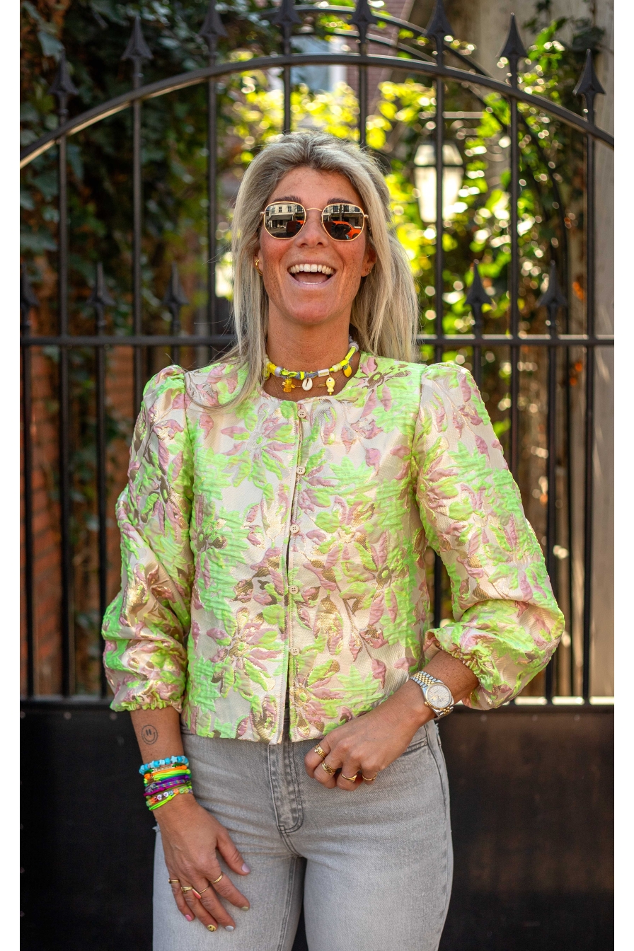 Dit prachtige jasje met elegante pofmouwen en een subtiele gouden lurexdraad geeft je look een luxe touch! Perfect voor elke outfit en ready to shine.