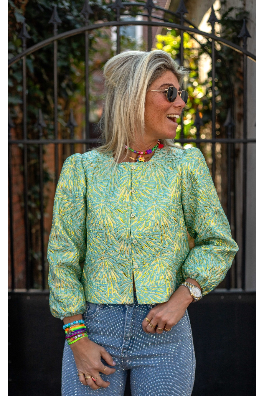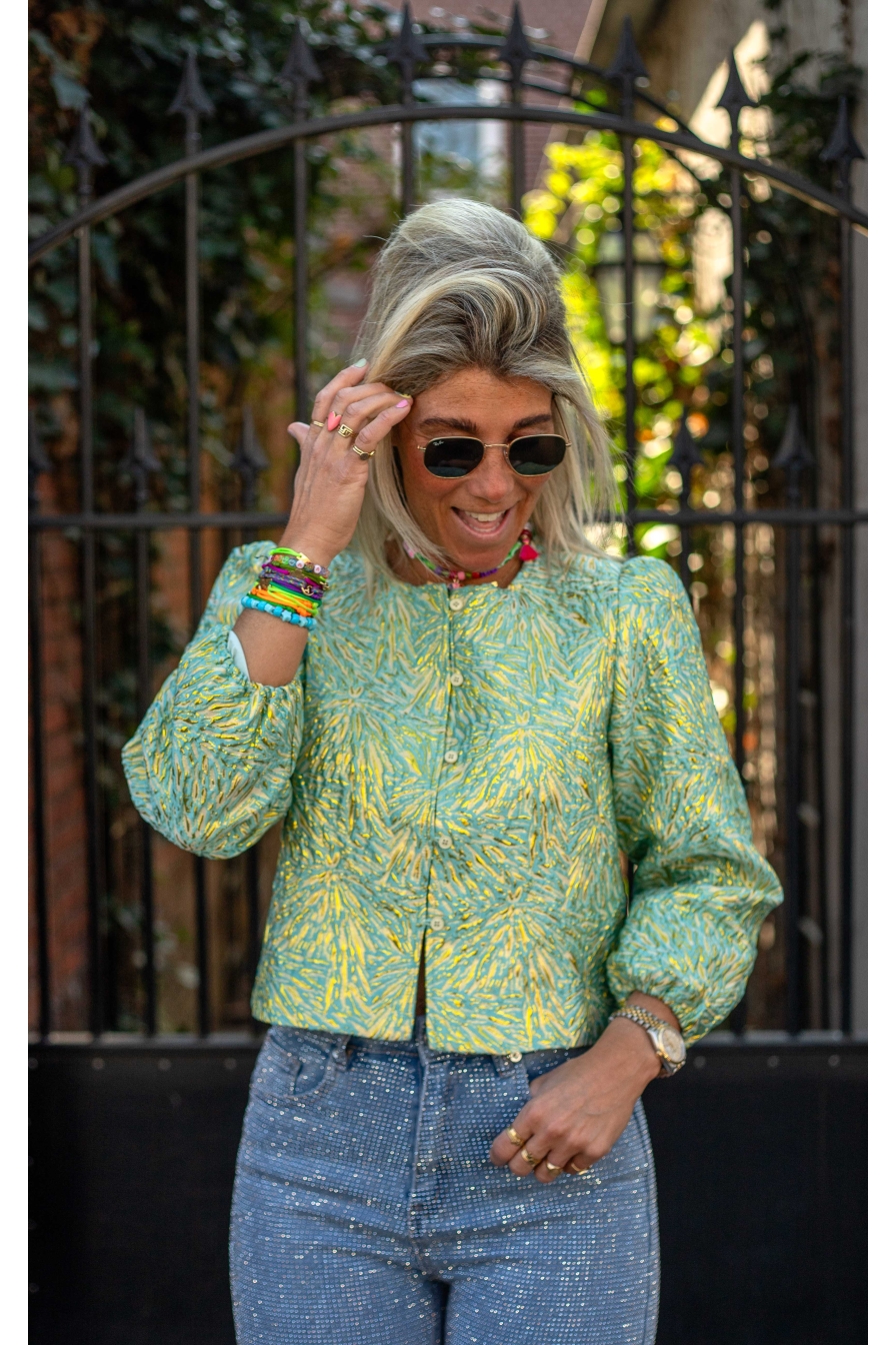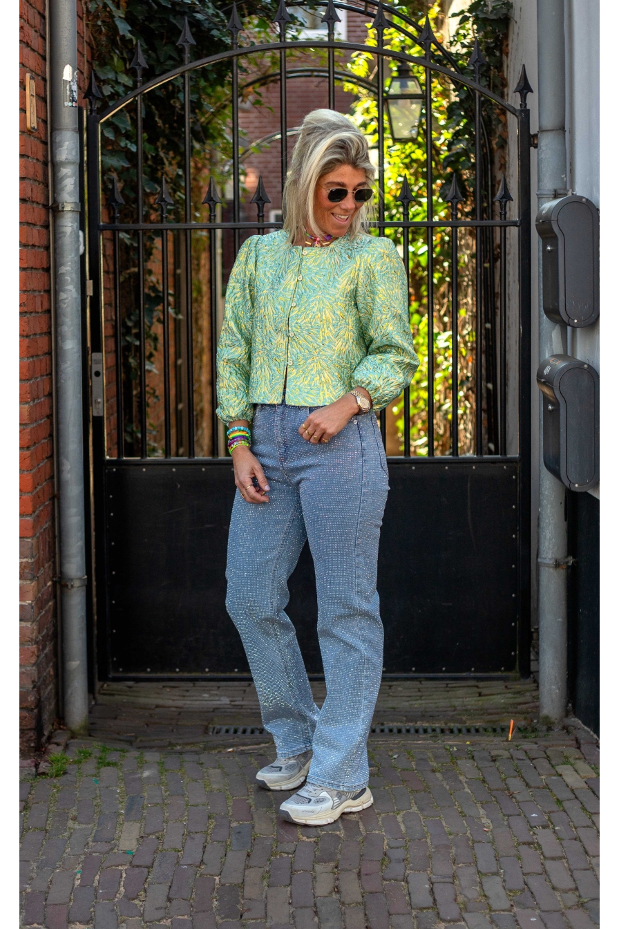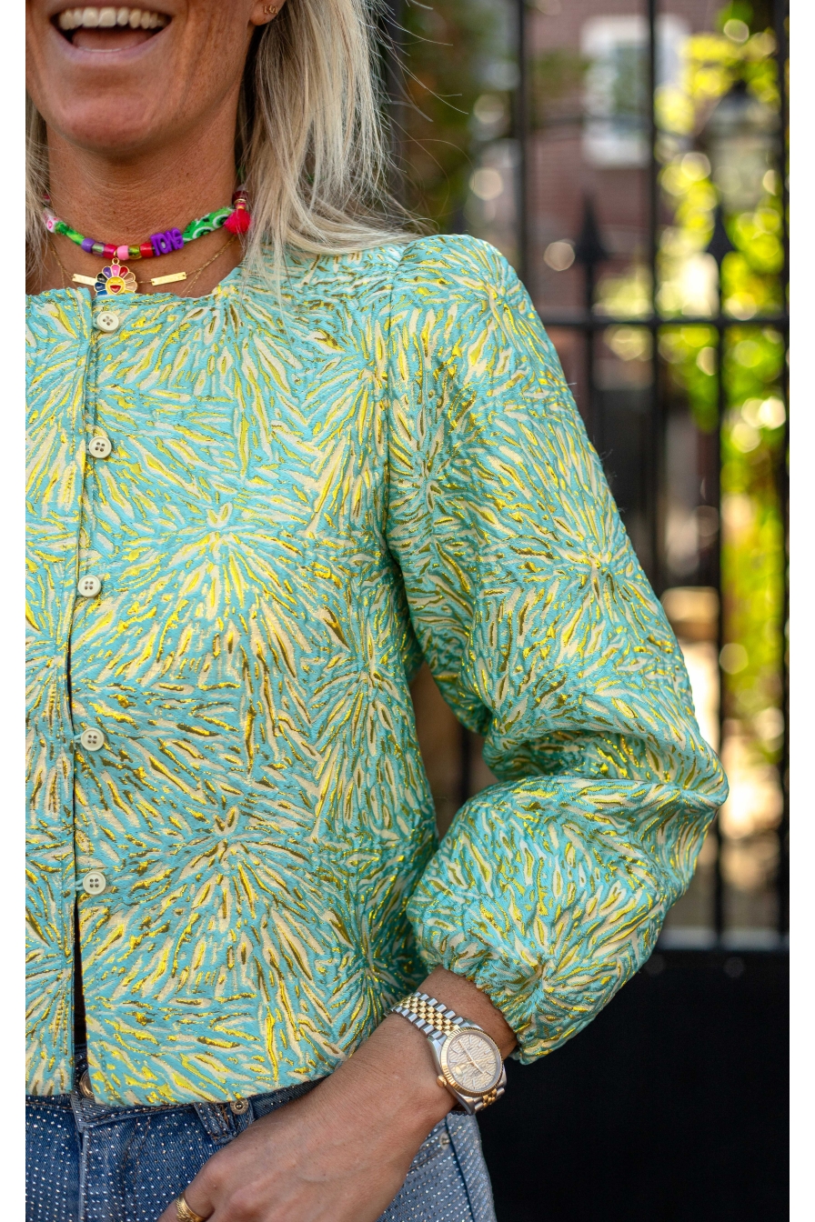 Dit prachtige jasje met elegante pofmouwen en een subtiele gouden lurexdraad geeft je look een luxe touch! Perfect voor elke outfit en ready to shine.
