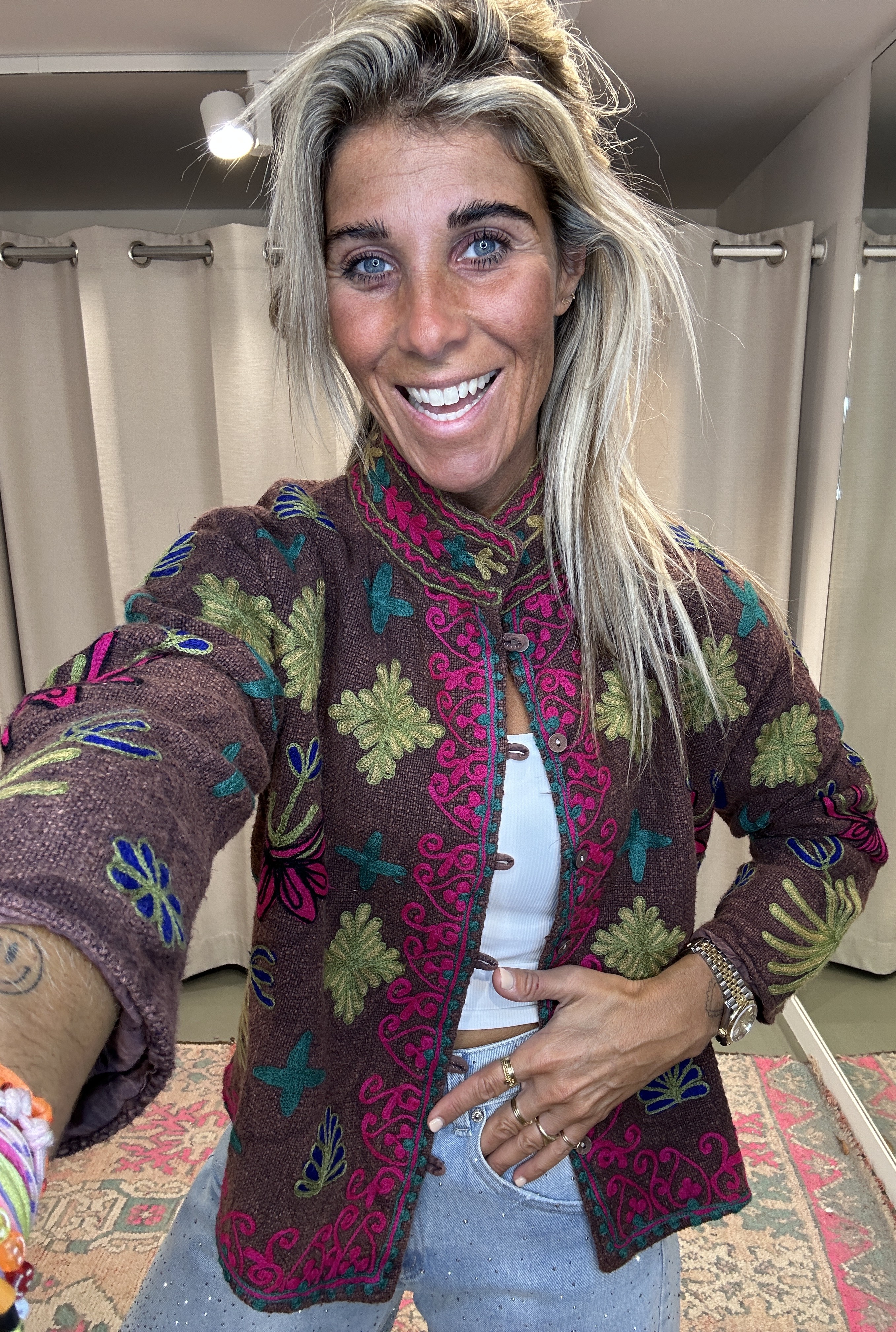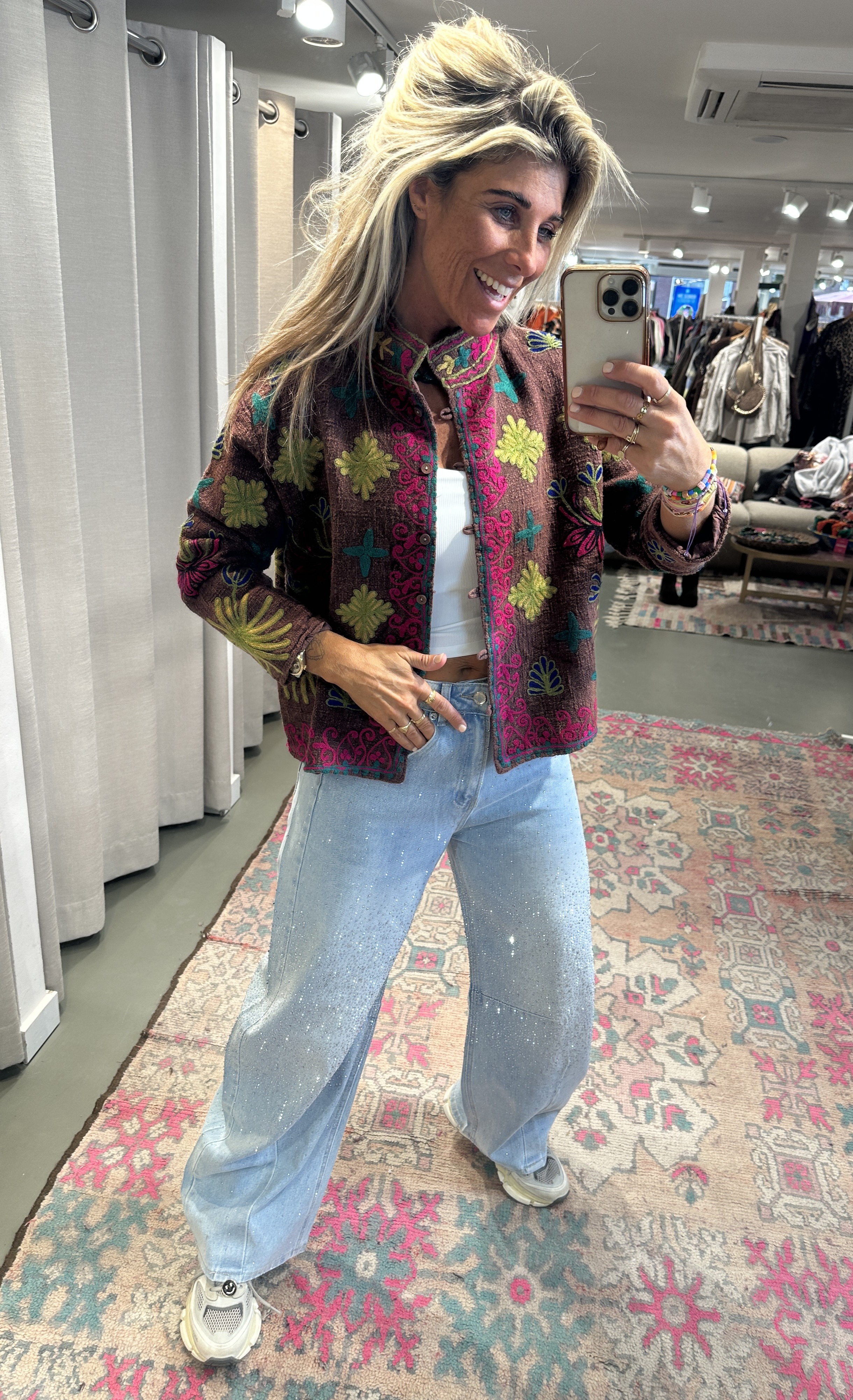 Heerlijk kleurrijk jasje, volledig bewerkt met handmade broderie details – een echte eyecatcher! Dit unieke item is draagbaar tot en met maat L.