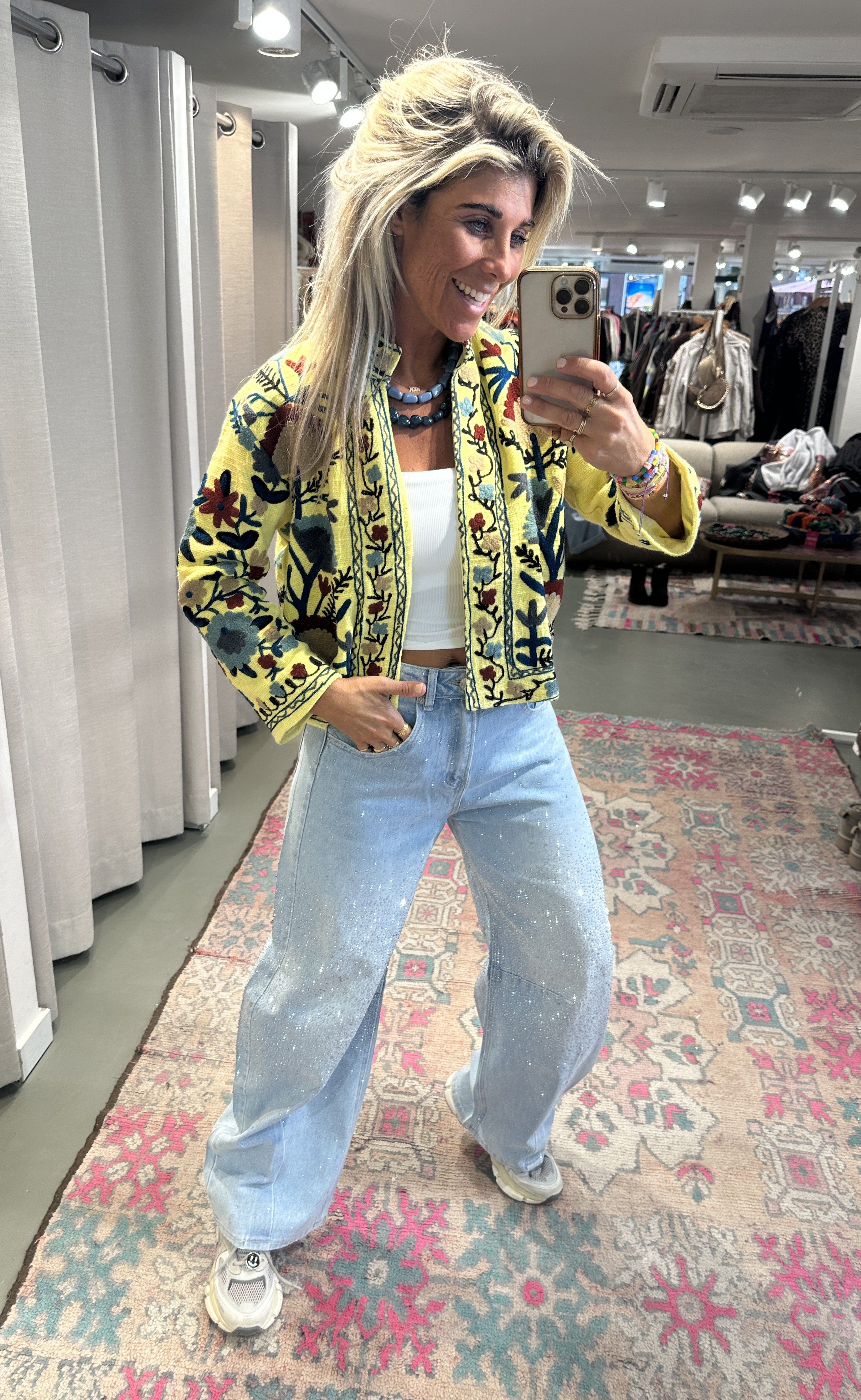 Heerlijk kleurrijk jasje, volledig bewerkt met handmade broderie details – een echte eyecatcher! Dit unieke item is draagbaar tot en met maat L.