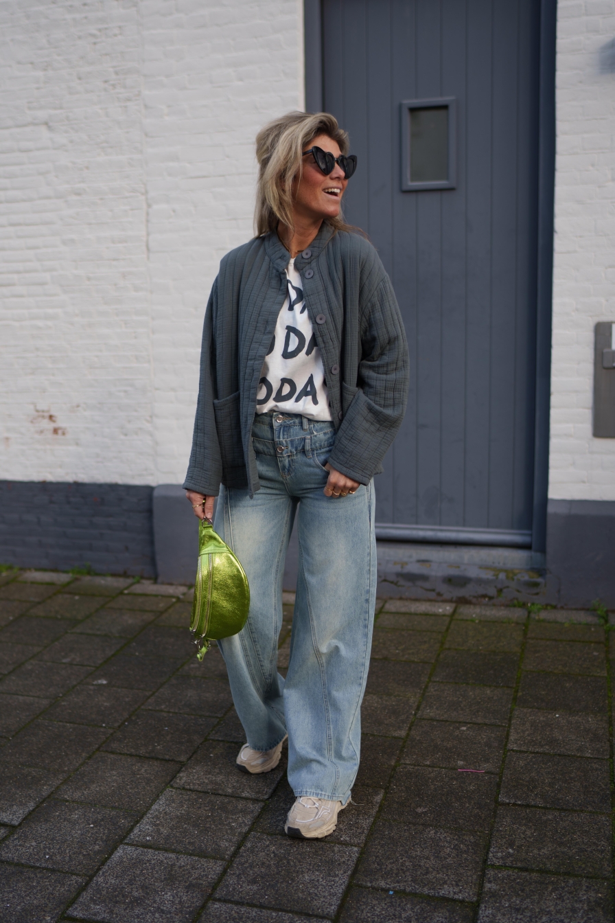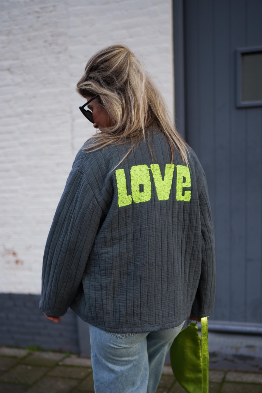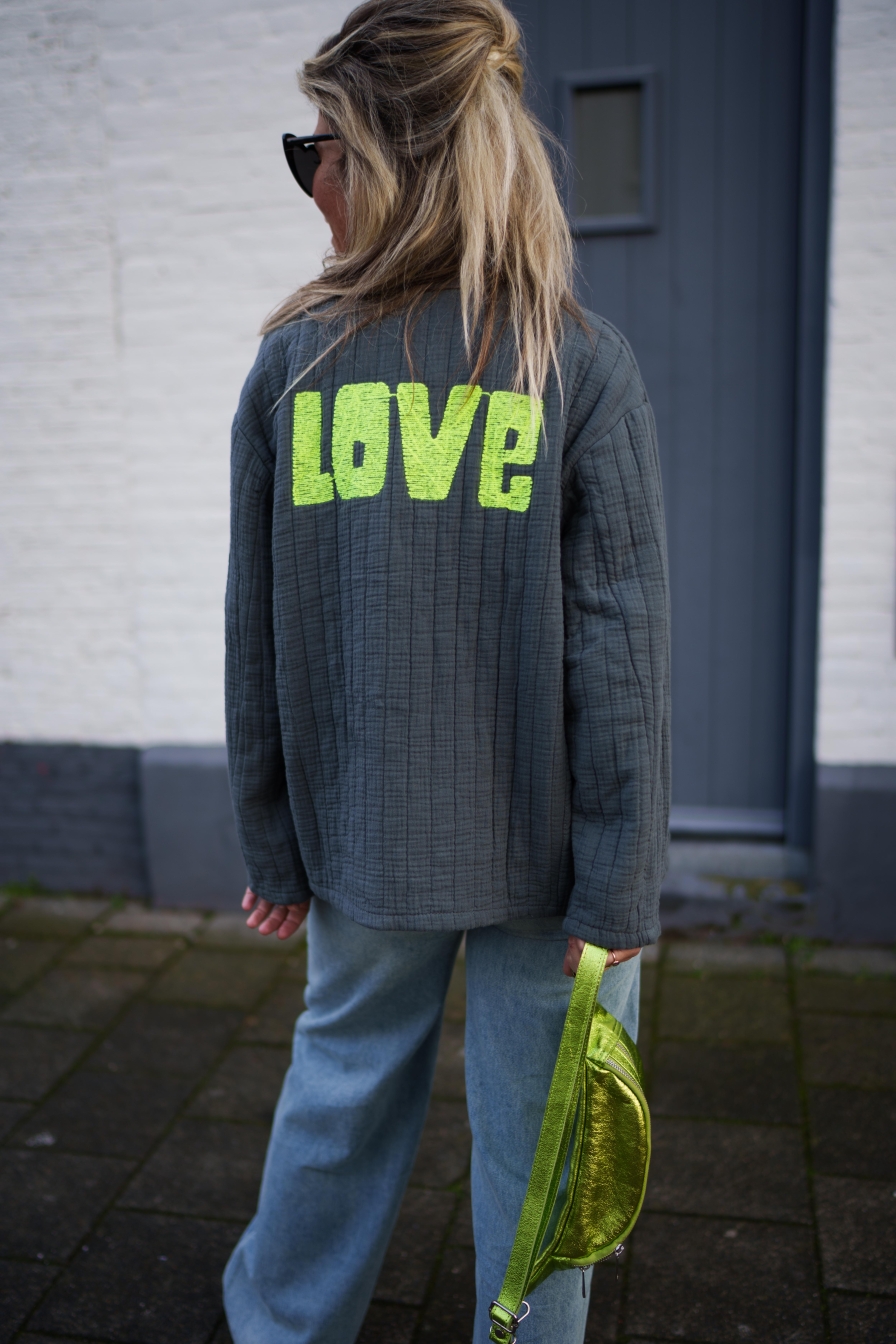 Antraciet gewatteerd vest/jack, compleet met twee handige voorzakken en de tekst "LOVE" in geel op de achterkant gestikt! Een stijlvolle...