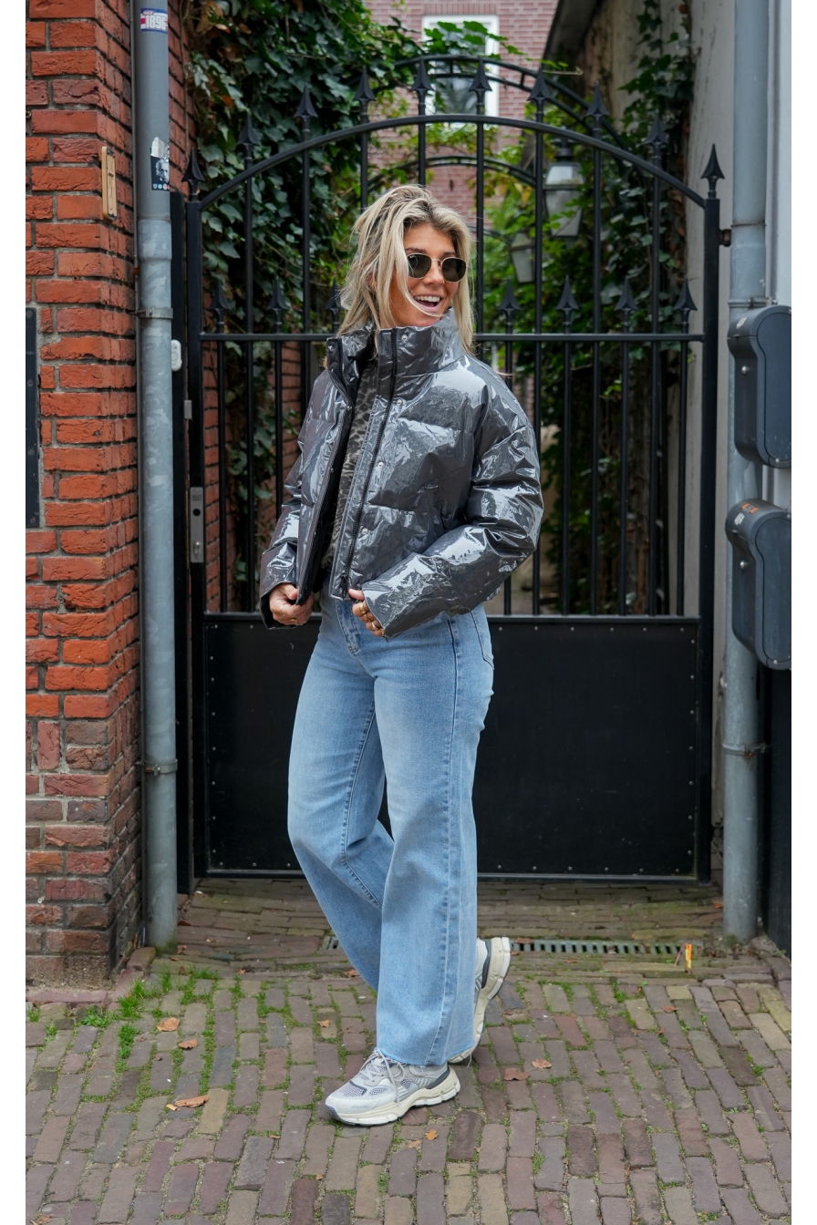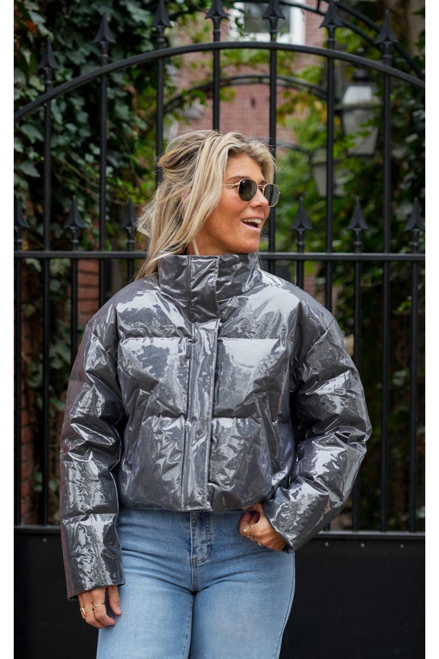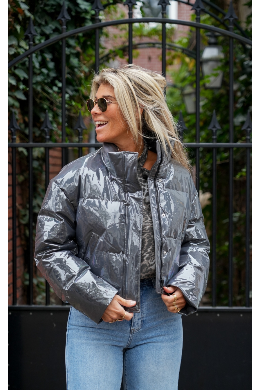 Dit metallic cropped bomberjack is een echte must-have voor wie durft op te vallen! Met zijn korte model en glanzende finish is het de perfecte mix van edgy en trendy. Een statement piece dat elke outfit een flinke dosis cool geeft! Model op de foto draagt maat S/M en is 1.72 m