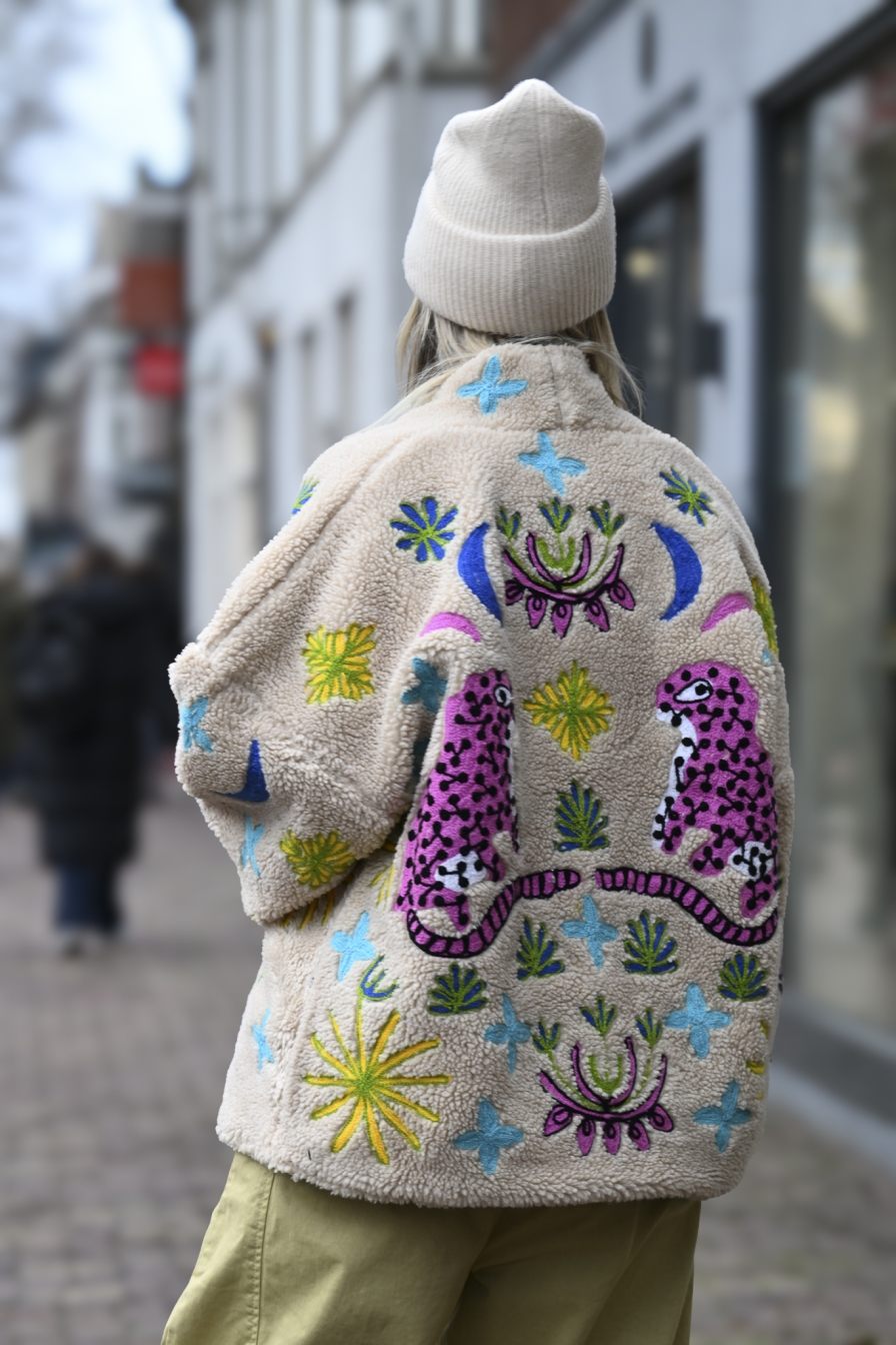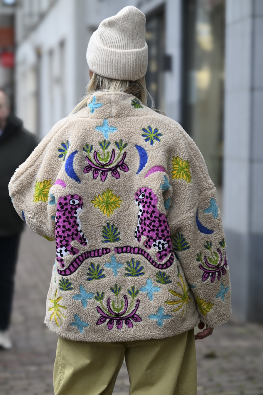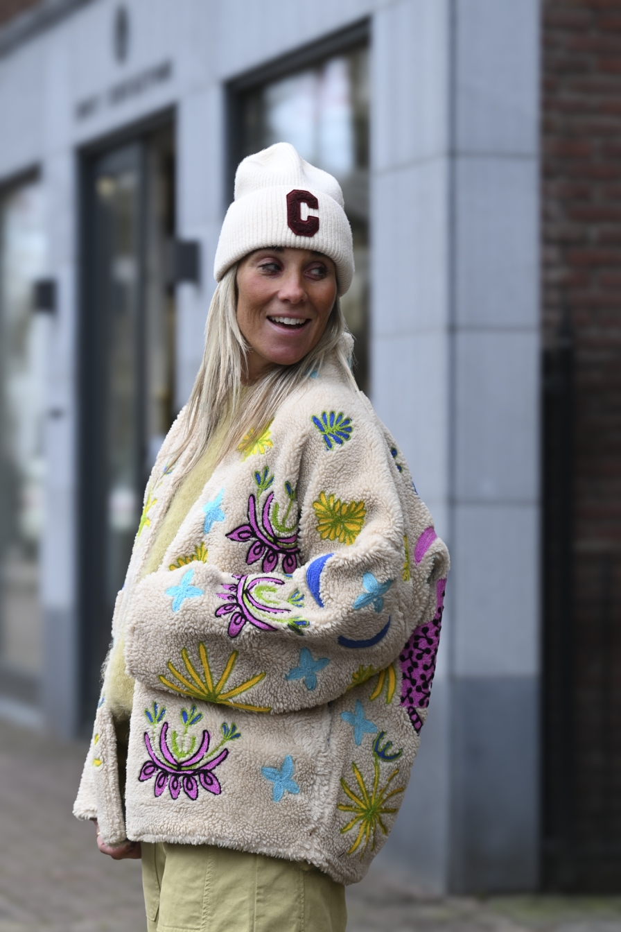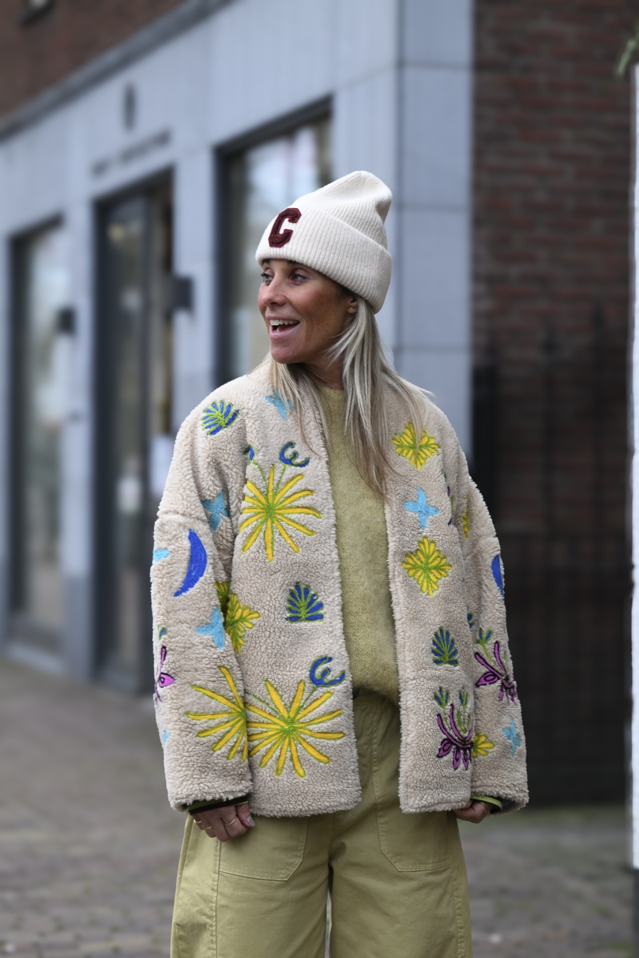 HANDMADE JACKET ALERT! Dit exclusieve jack is met de hand gemaakt, uitgevoerd in beige teddy en afgewerkt met toffe borduursels op de voor- én achterkant. Een echte statement piece die elke outfit meteen next level maakt. One size – draagbaar t/m L/XL.
