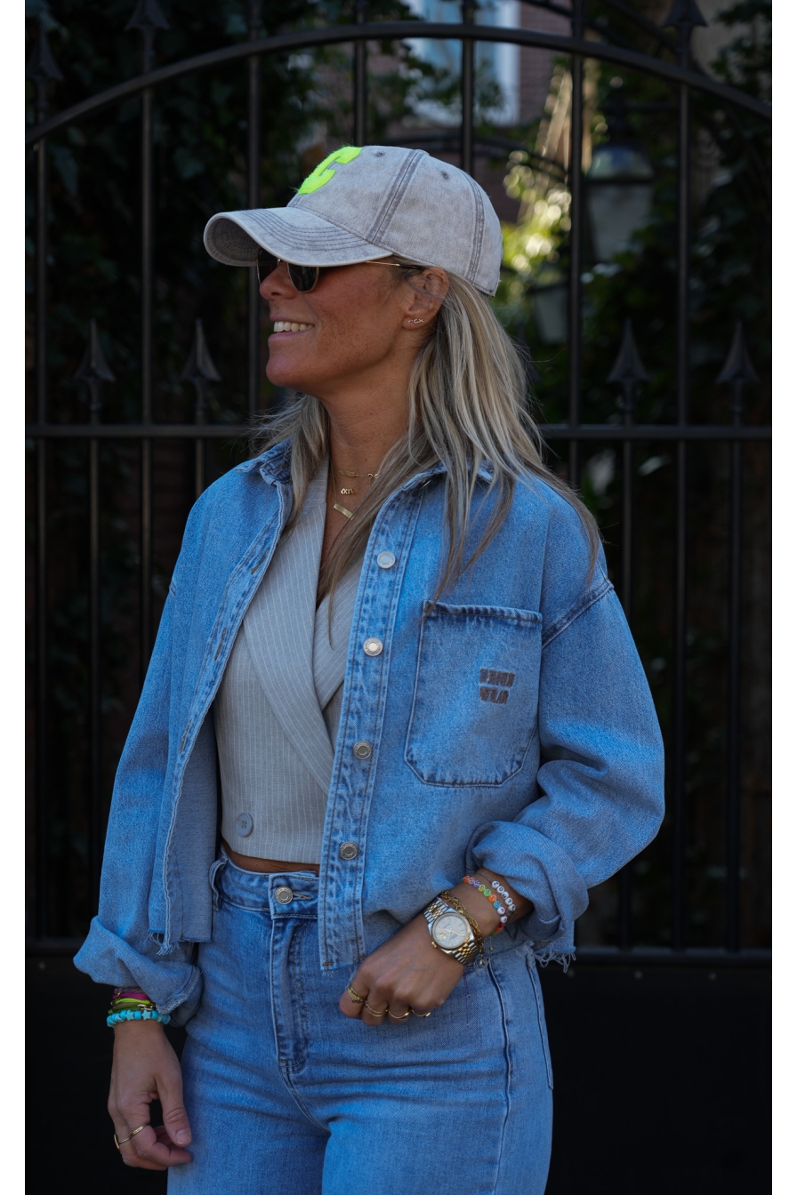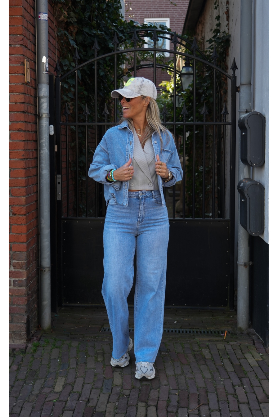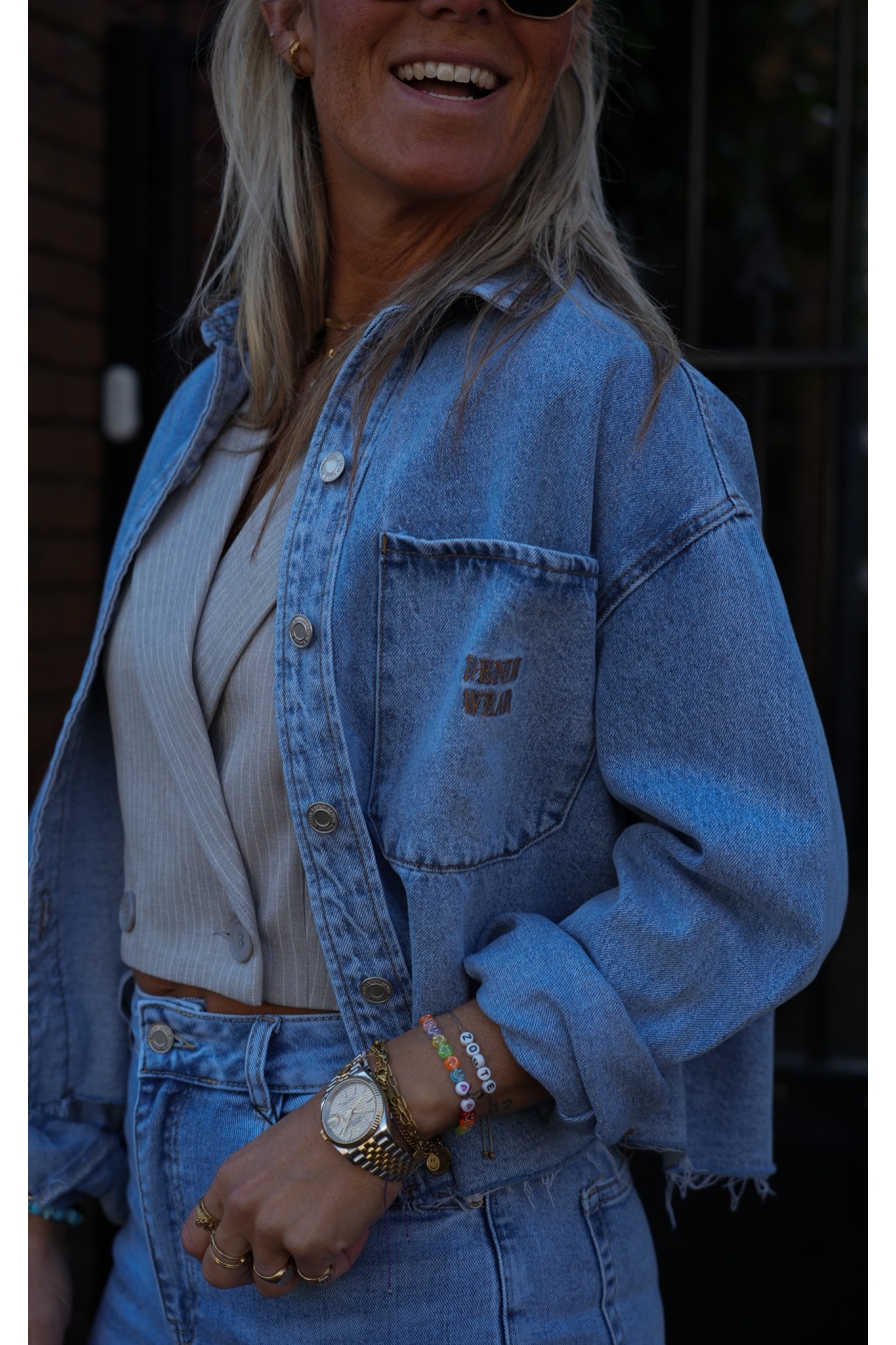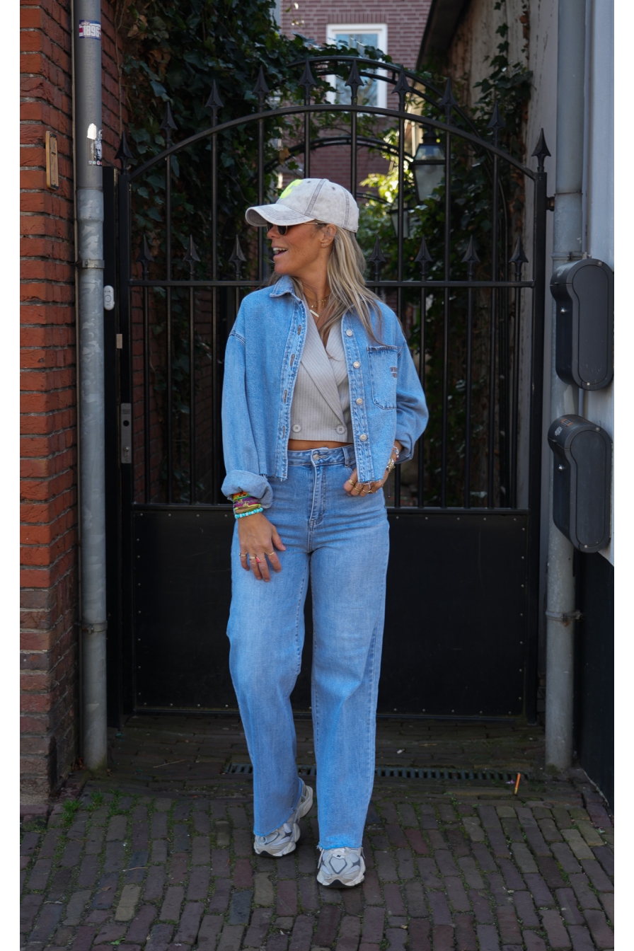 Deze cropped blouse heeft een borstzak met de tekst DENIM WEAR, perfect voor een casual, maar trendy look. Op de foto draag ik maat S en ben 1.76m lang.