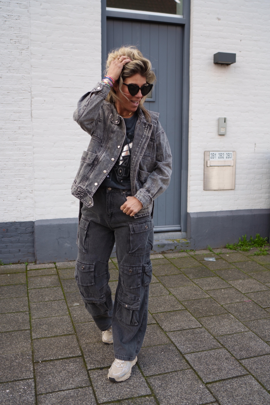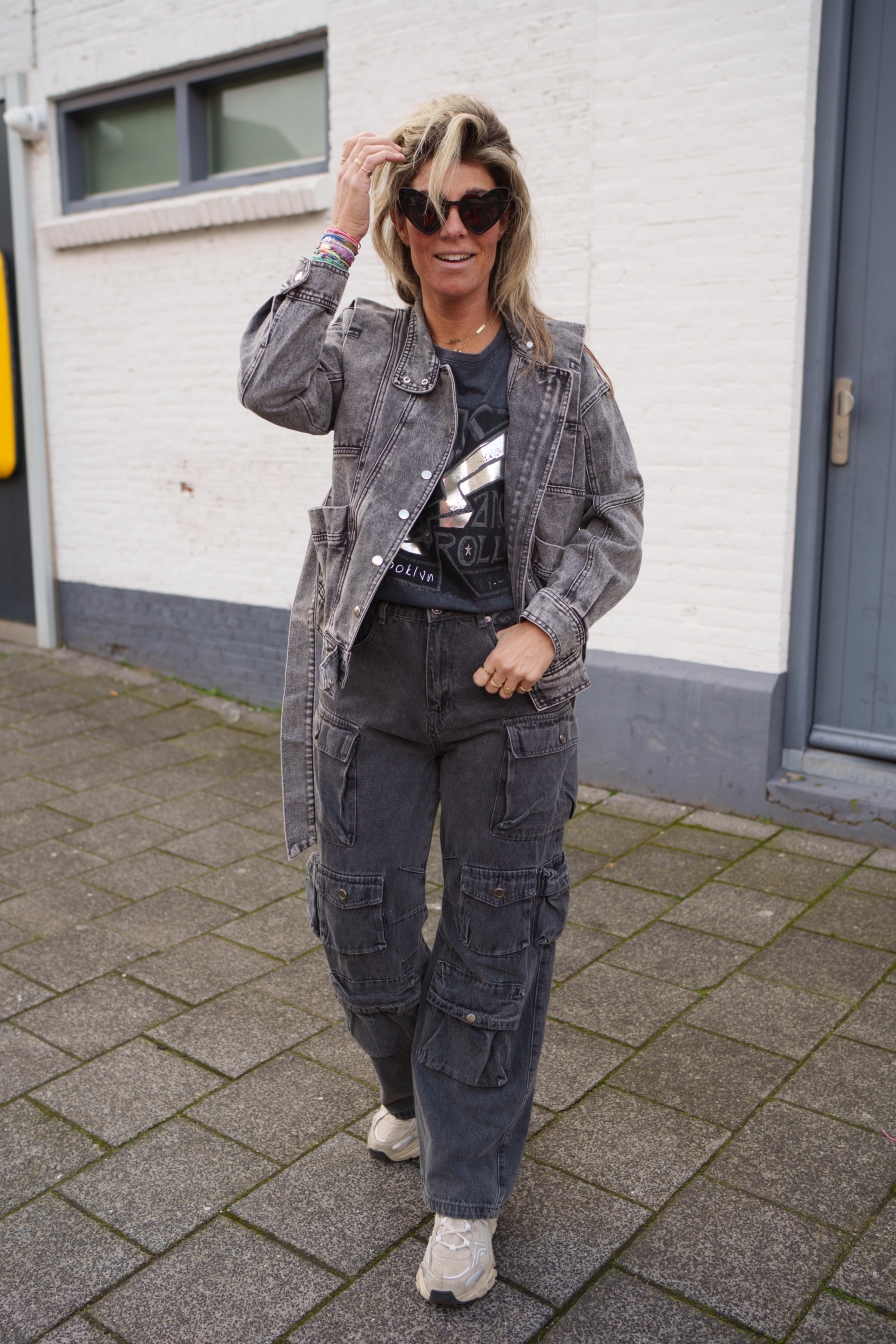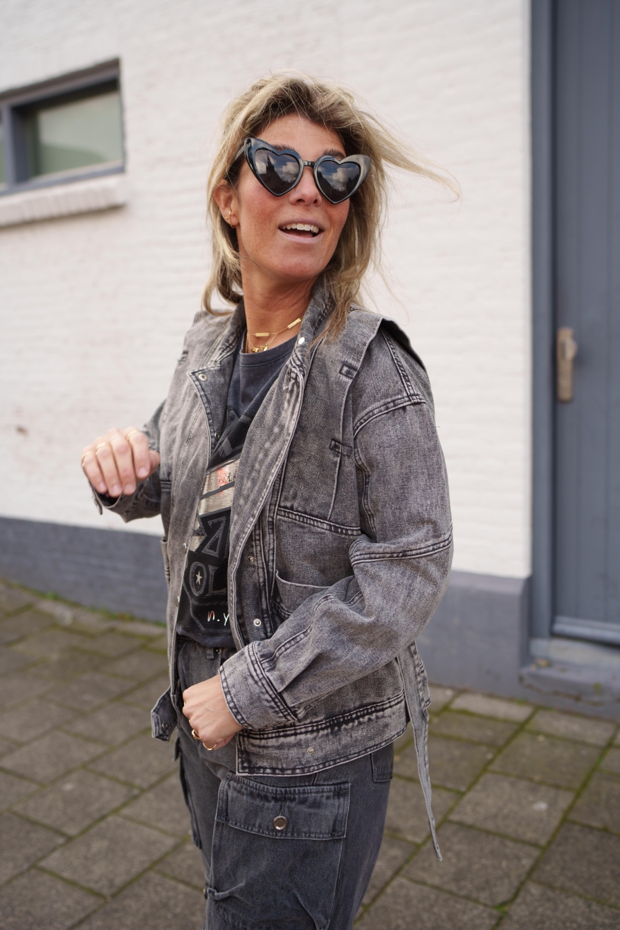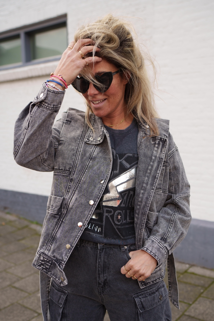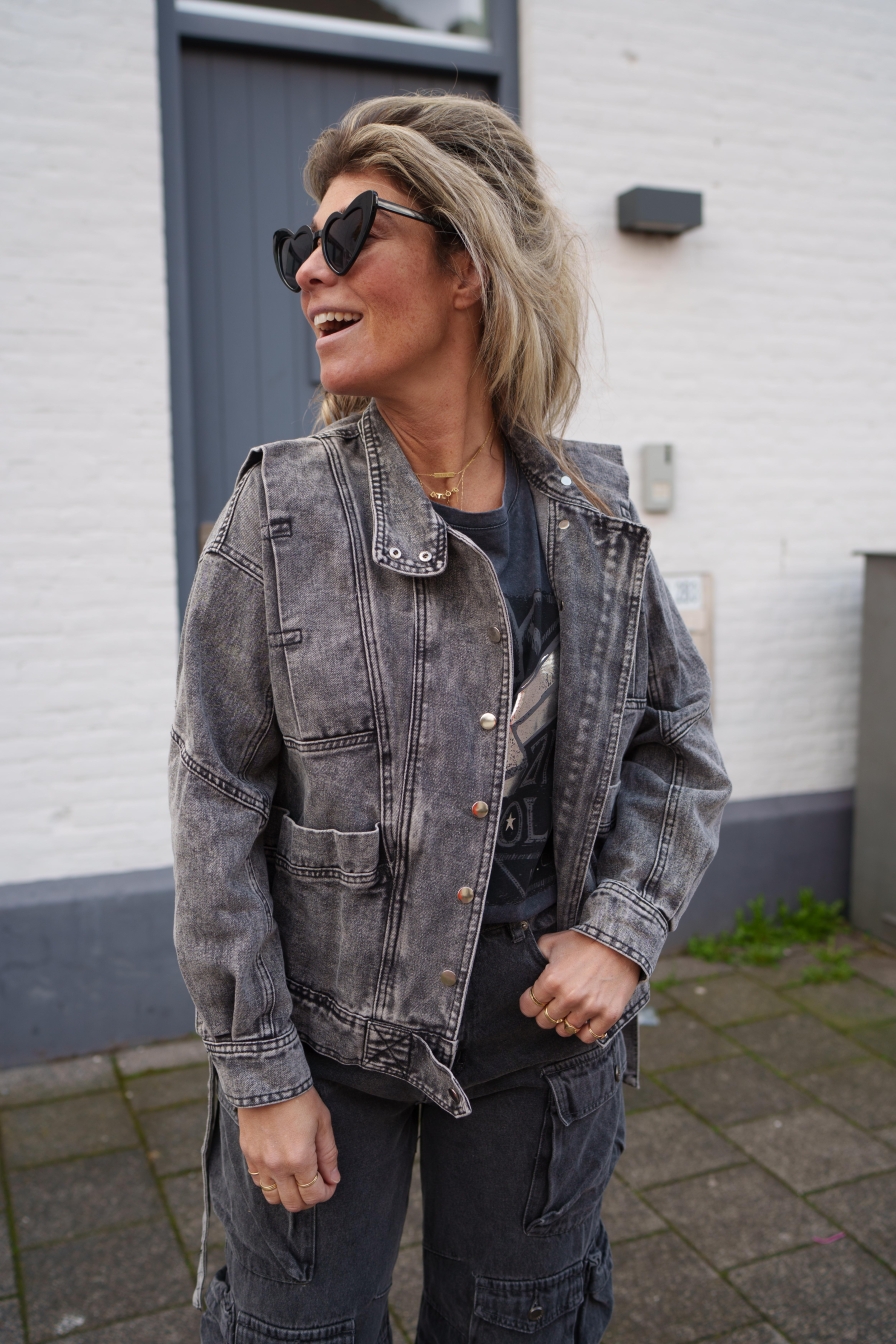 Stoer grijs jeansjack van 100% katoen, voorzien van centuur, drukknopen en 2 zakken. Een statement piece voor een edgy look. Ik ben 1,76 en draag Maat S.