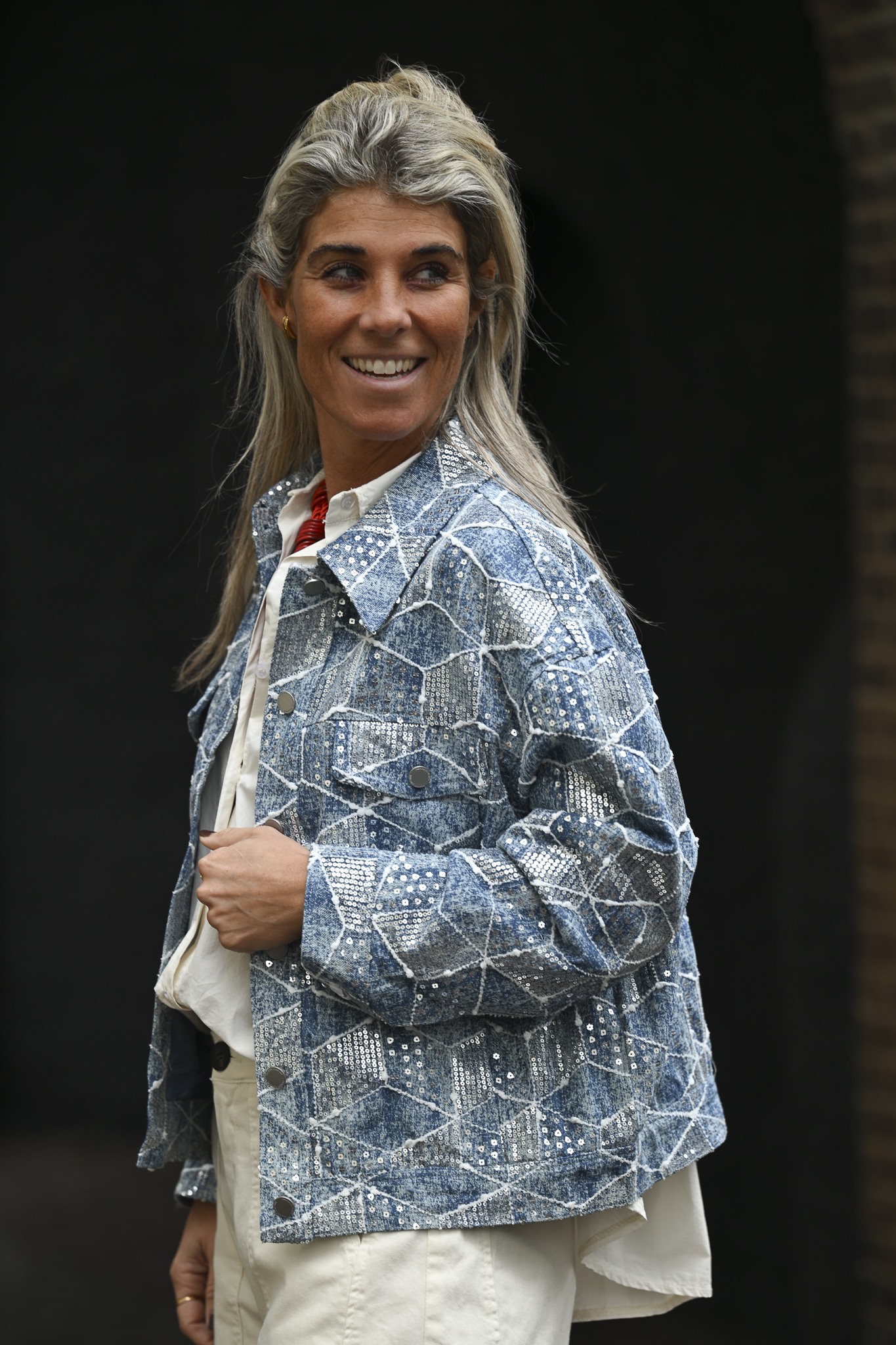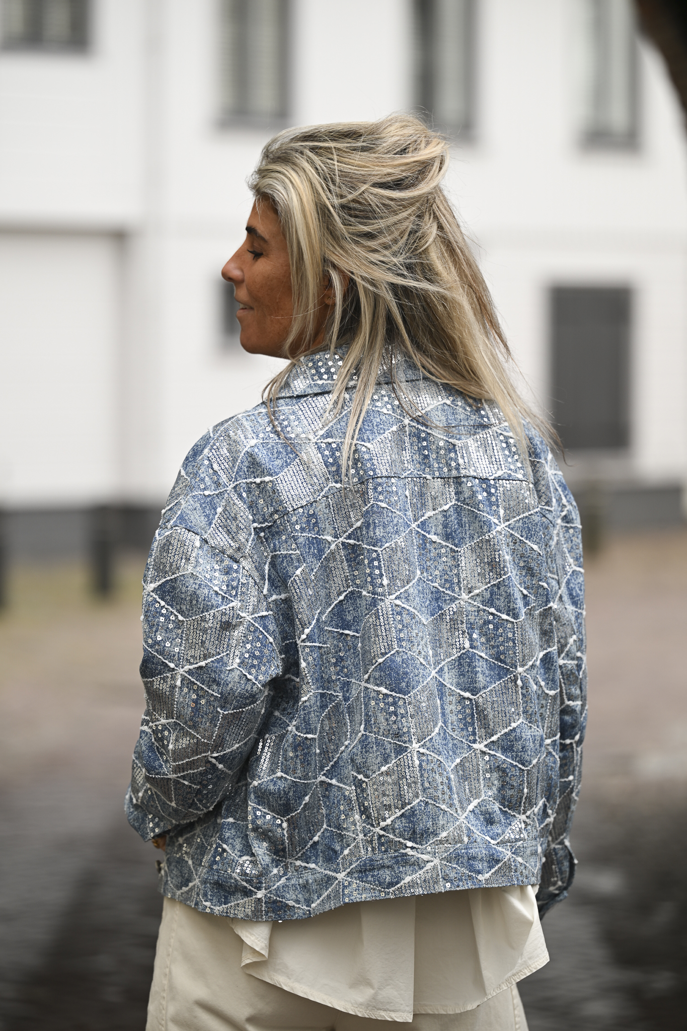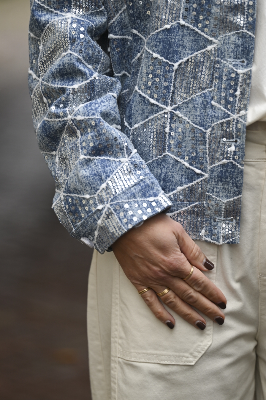 Jeansjack Square, gemaakt van 70% katoen, is stijlvol afgewerkt met pailletten. Op de foto draag ik maat S/M en ben ik 1,76 m lang.