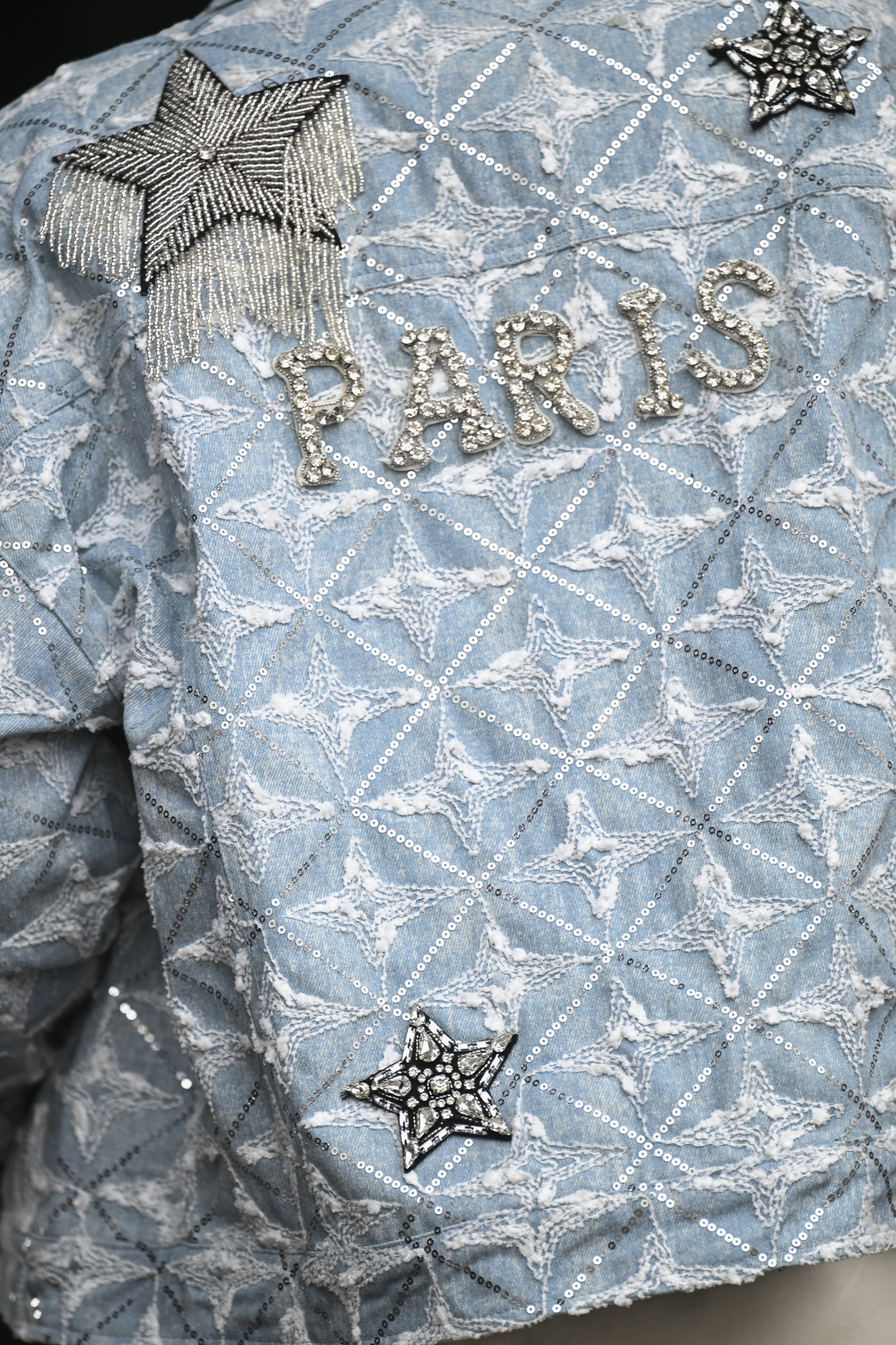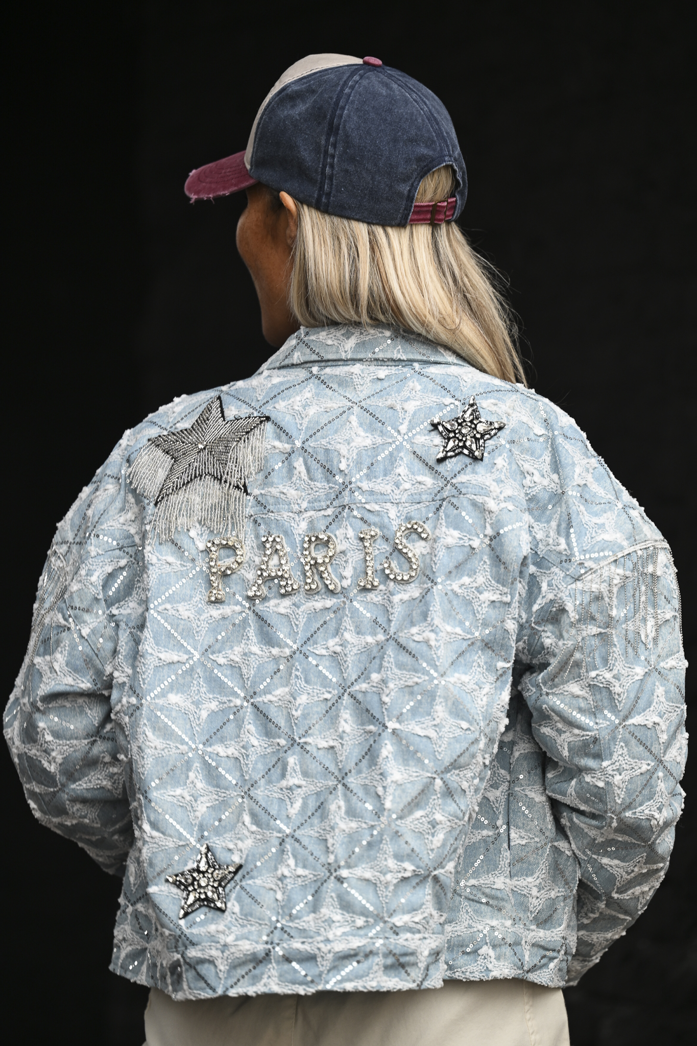 Jeansjack met applicaties; op de achterkant staat PARIS en sterren in bling! Goed afgewerkt met stevige drukknopen. Op de foto draag ik maat S/M en ben ik 1,76 m lang.