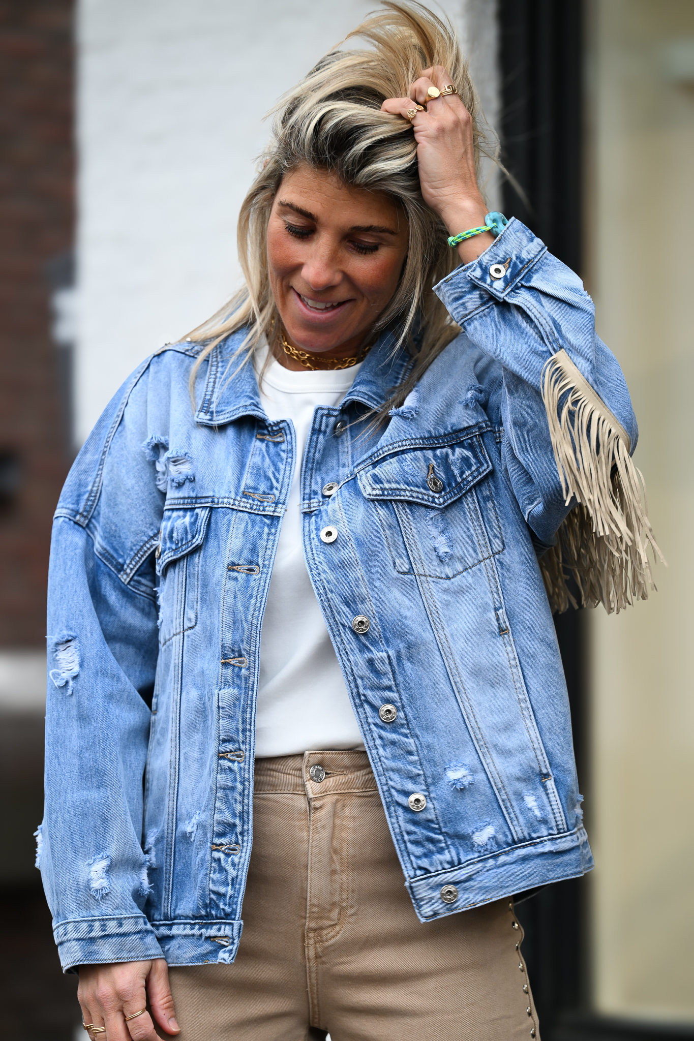 Eyecatcher Nr.1! Dit licht oversized ONESIZE jeansjack valt meteen op met franjes van mouw tot mouw. Check zeker ook het bewerkte schouderstuk – zo gaaf en uniek!