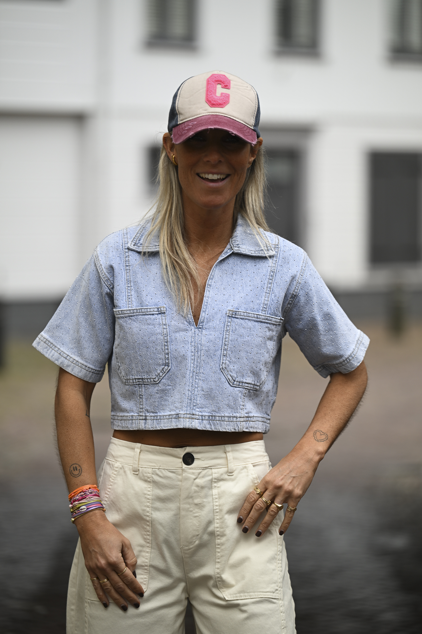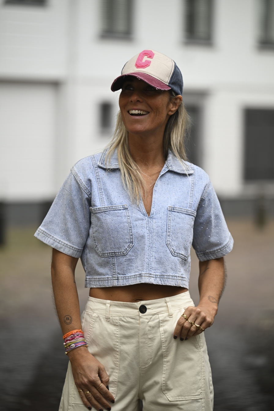 Deze sparkling cropped jeans top heeft een V-hals en een loose fit. Op de foto draag ik maat S/M en ben ik 1,76 m lang.