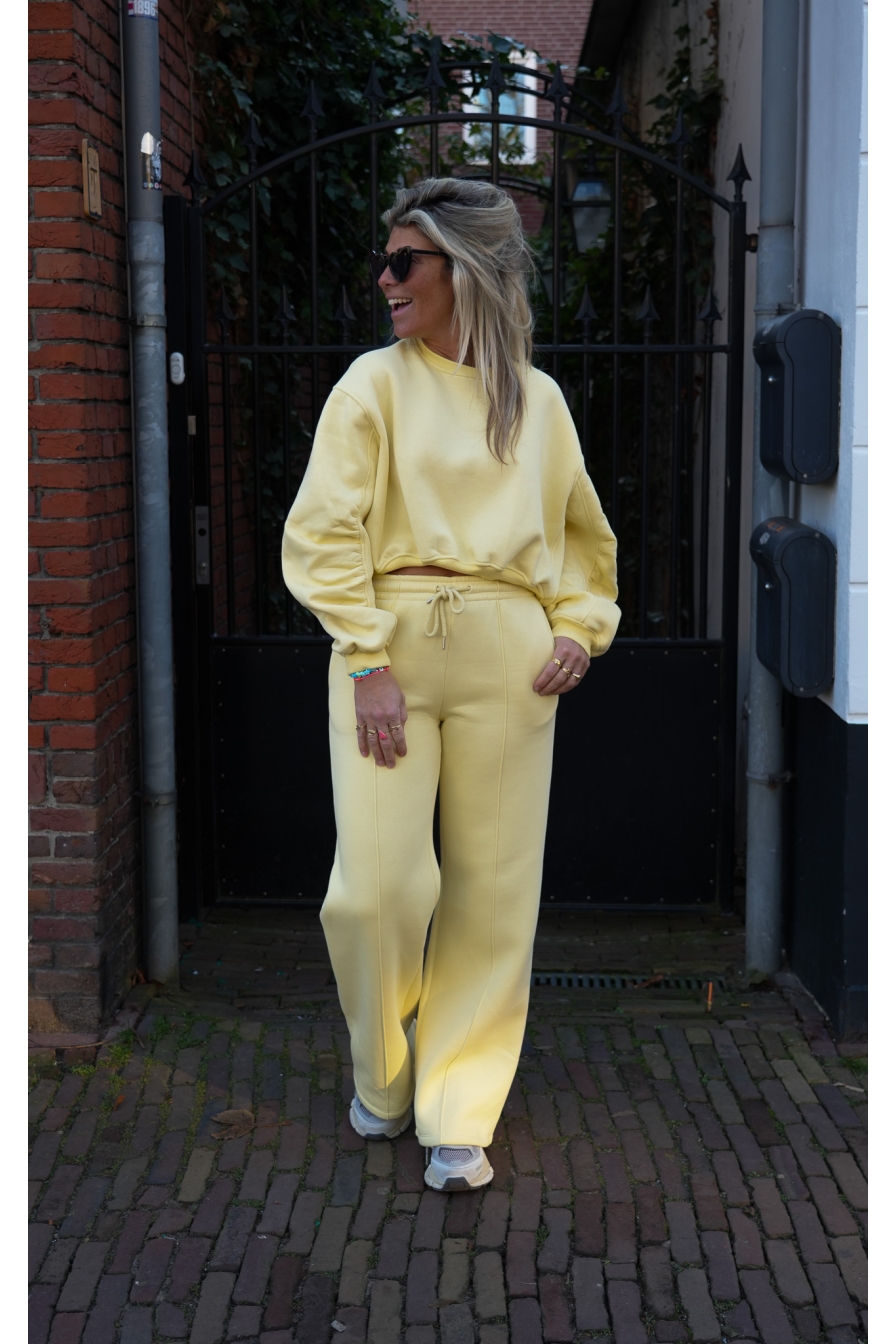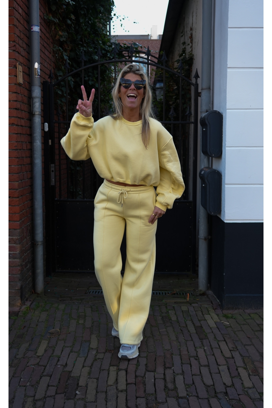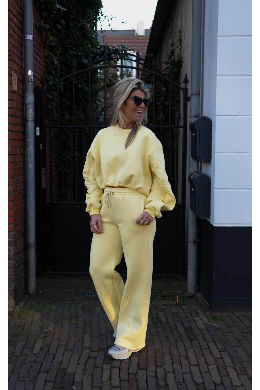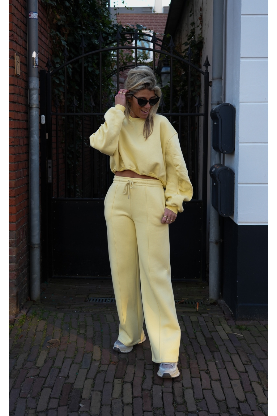 Set Vyana in zachtgeel is een echte eyecatcher! Gemaakt van 92% katoen, met een hoog aansluitende wide leg broek en een matchy cropped sweater.