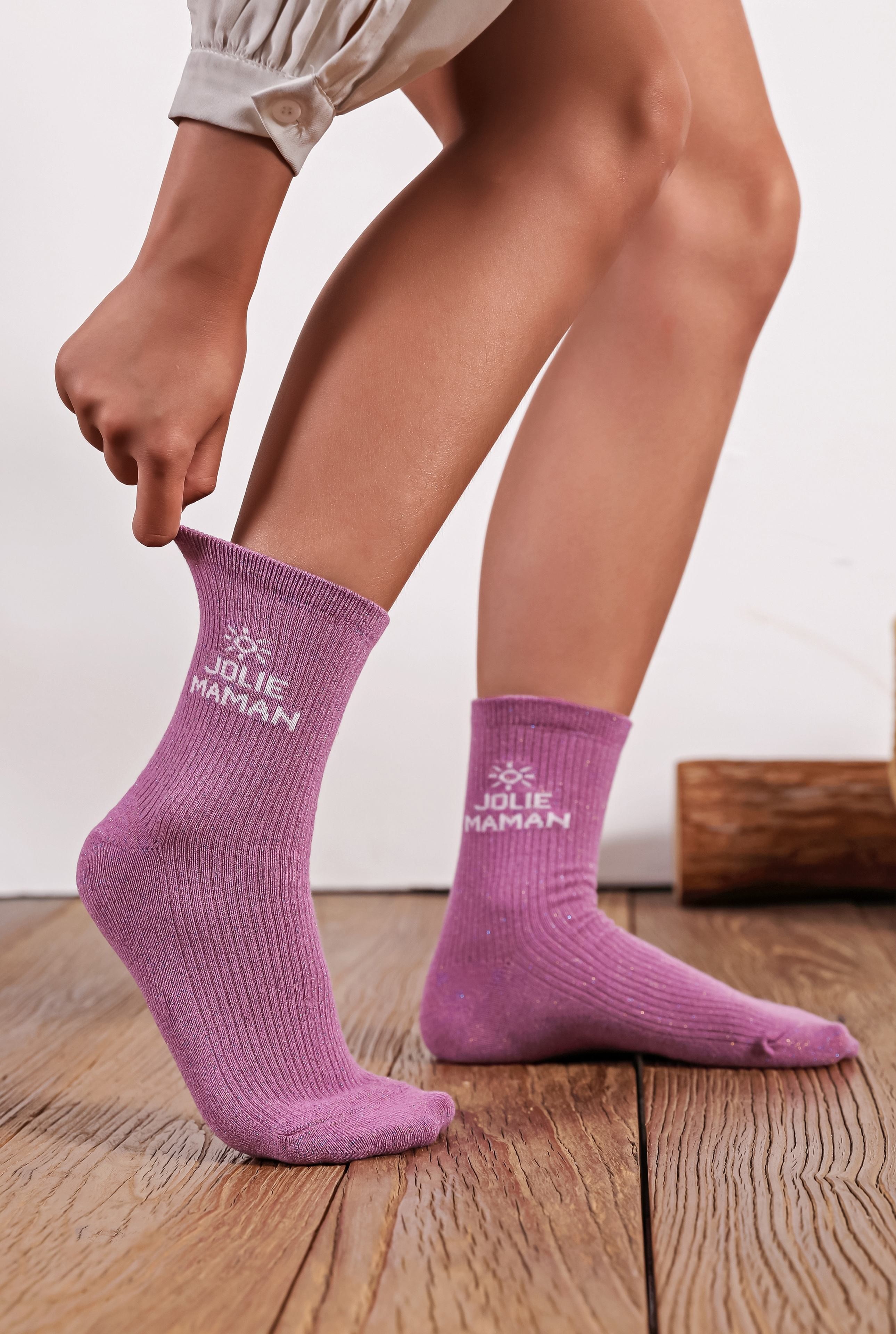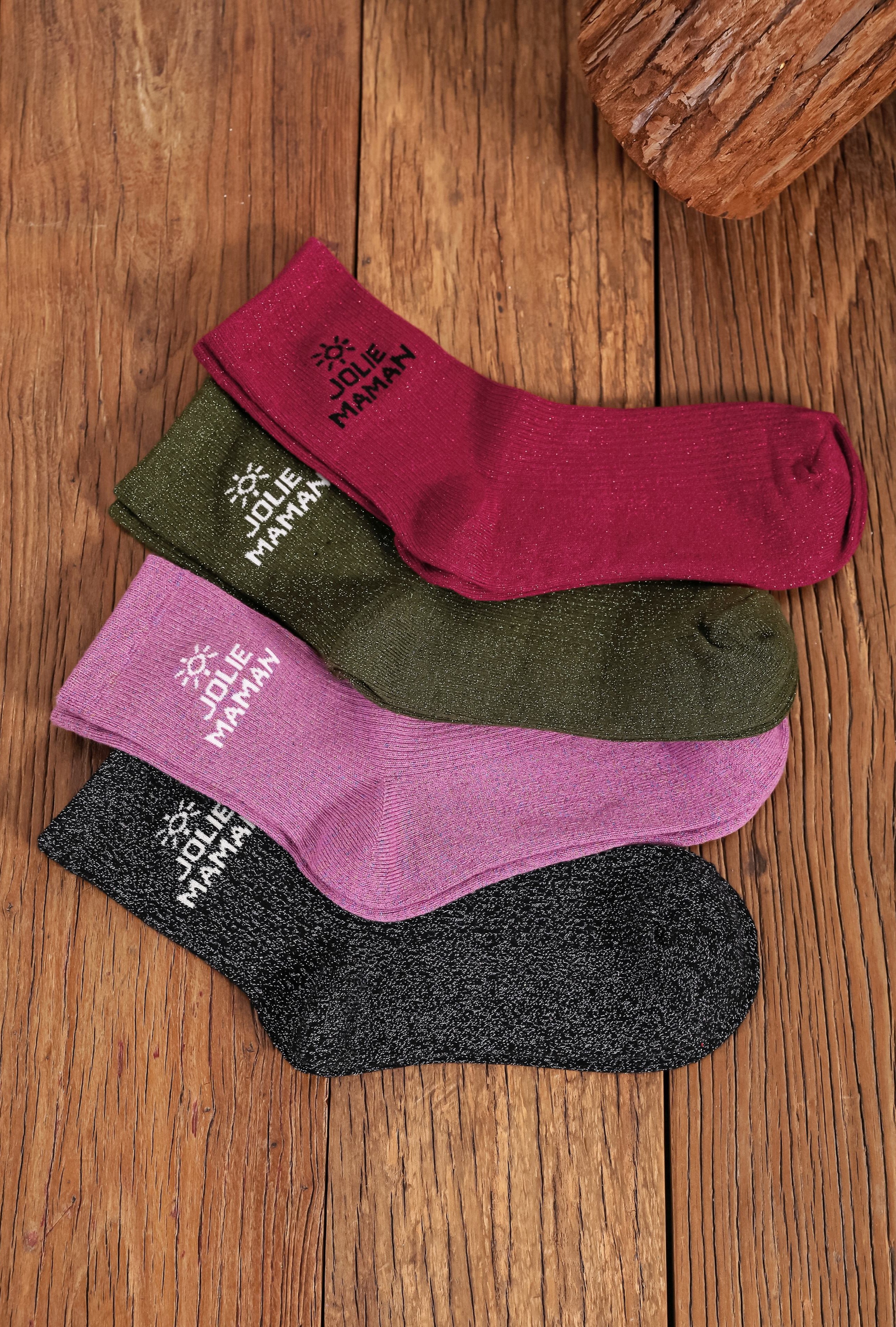Mixpakket van 4 paar sokken met de tekst Jolie Maman (mooie mama) in de kleuren roze, rood, groen en grijs. Draagbaar van maat 36 t/m...