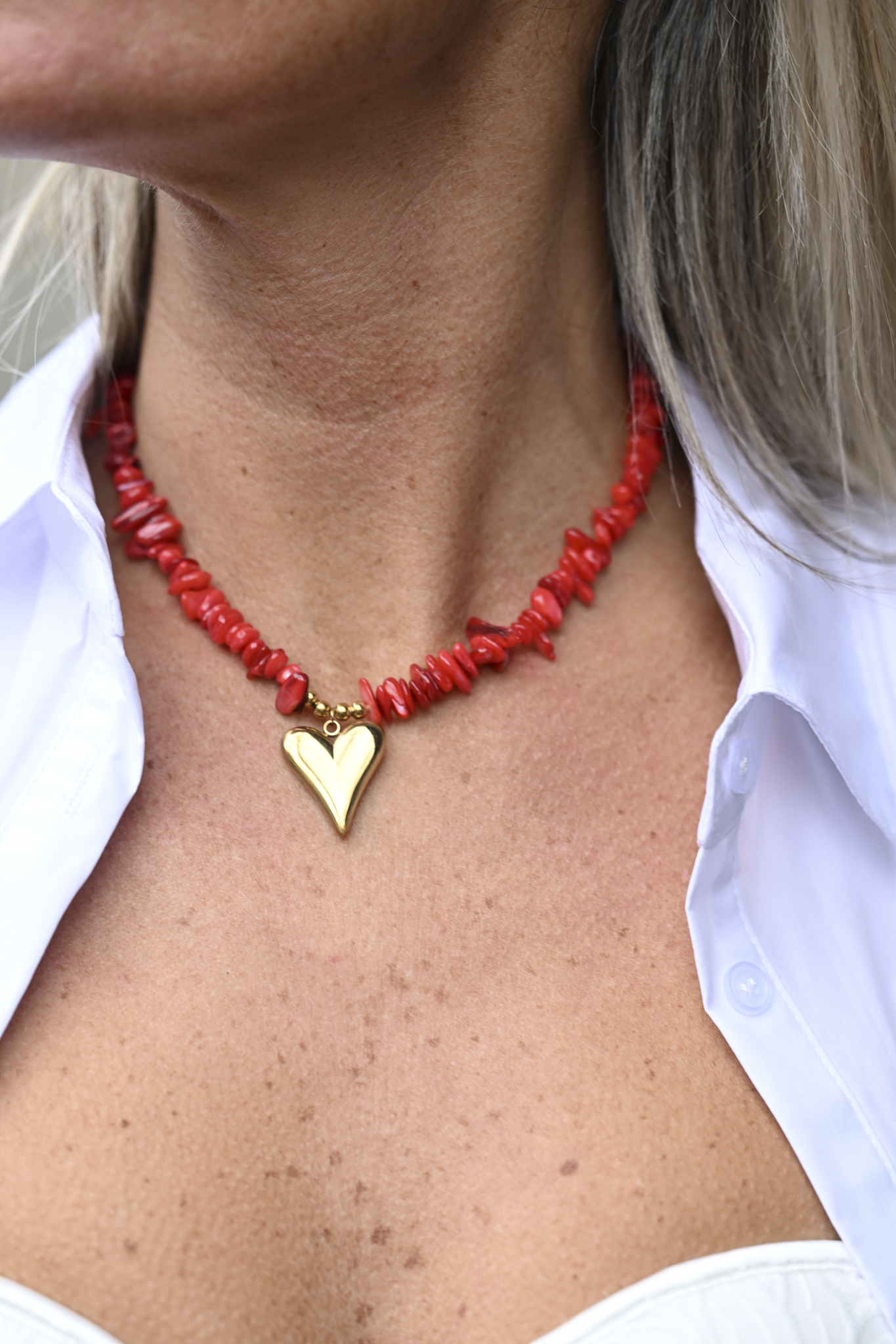 Deze stainless steel ketting is 40 cm lang en afgewerkt met rode, gladde steentjes. De ketting sluit met een karabijnsluiting. Onderaan hangt als nikkelvrije blikvanger een goud hart dat de ketting helemaal af maakt.