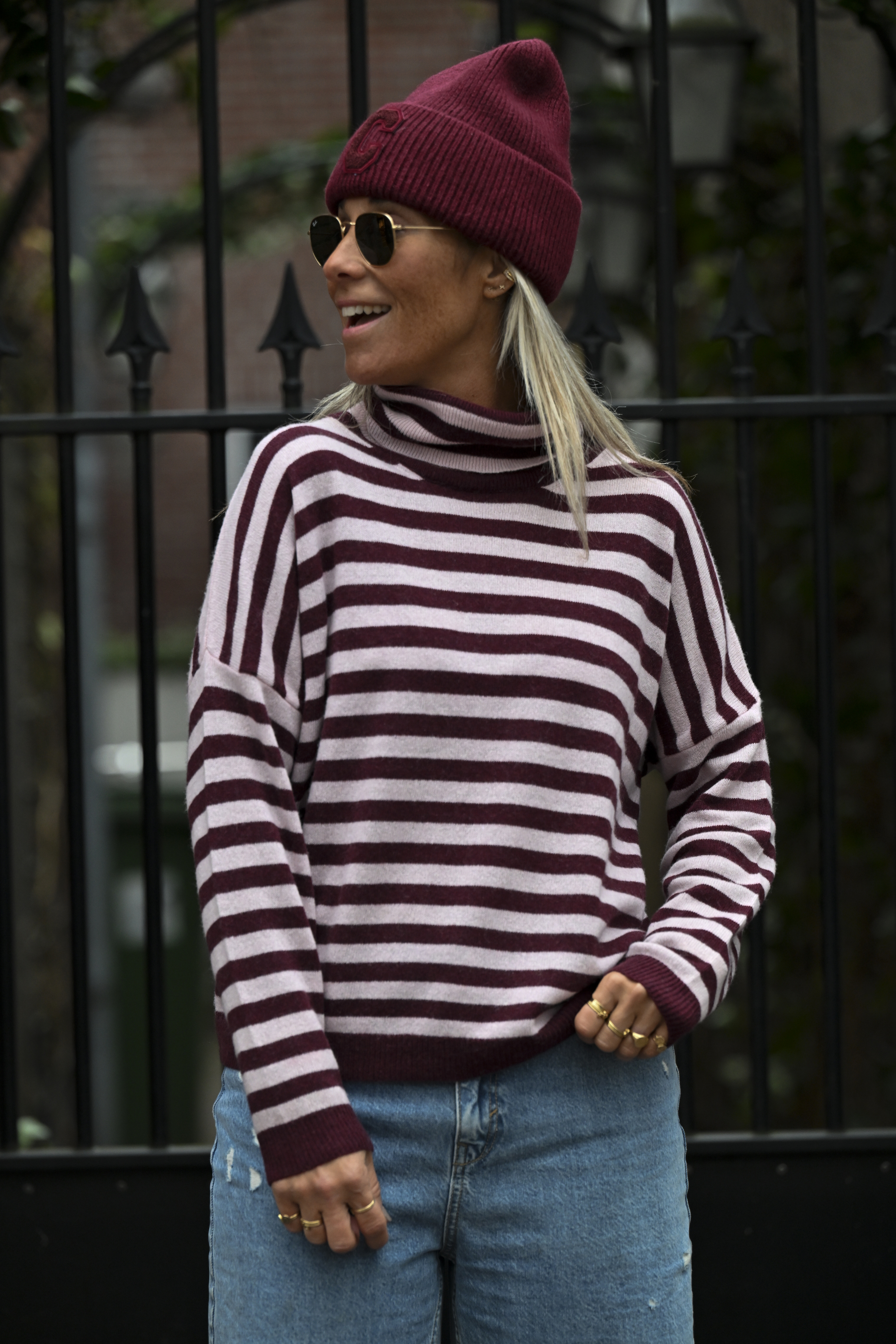 Knitted kol trui, bordeaux & roze, soft en cozy. One size, past t/m L/XL