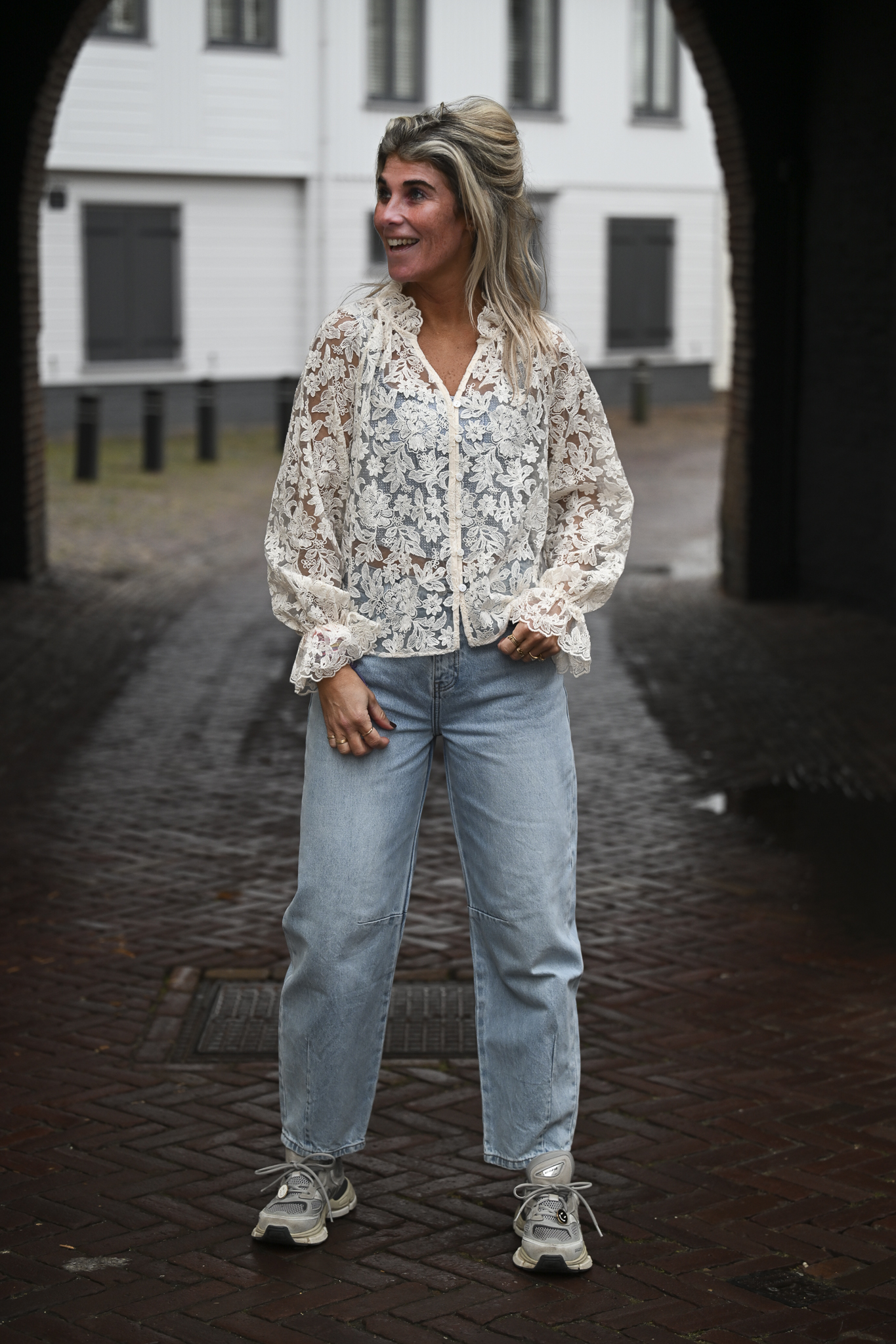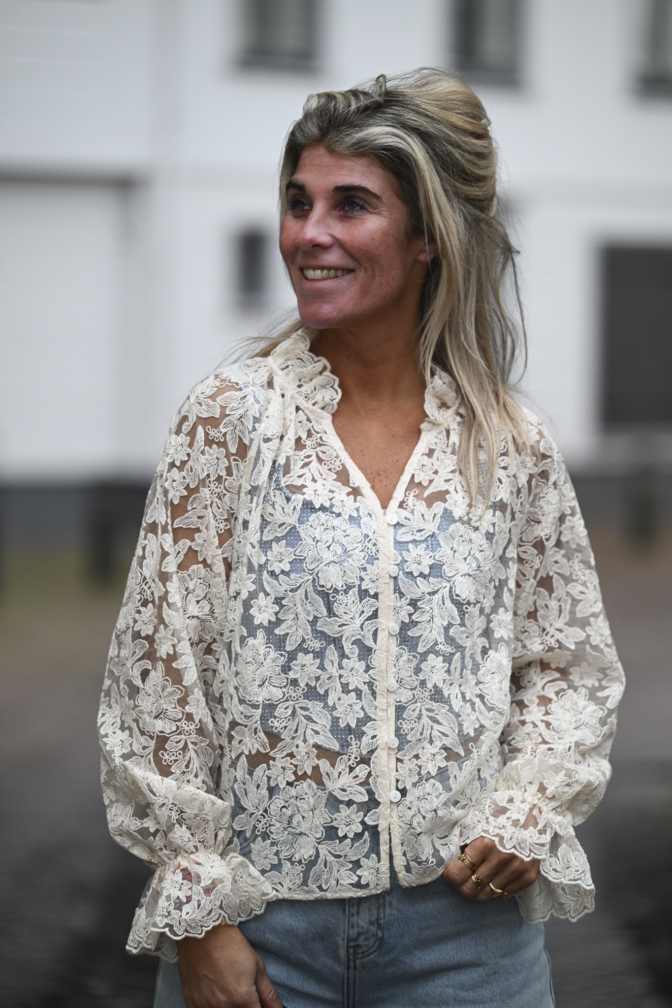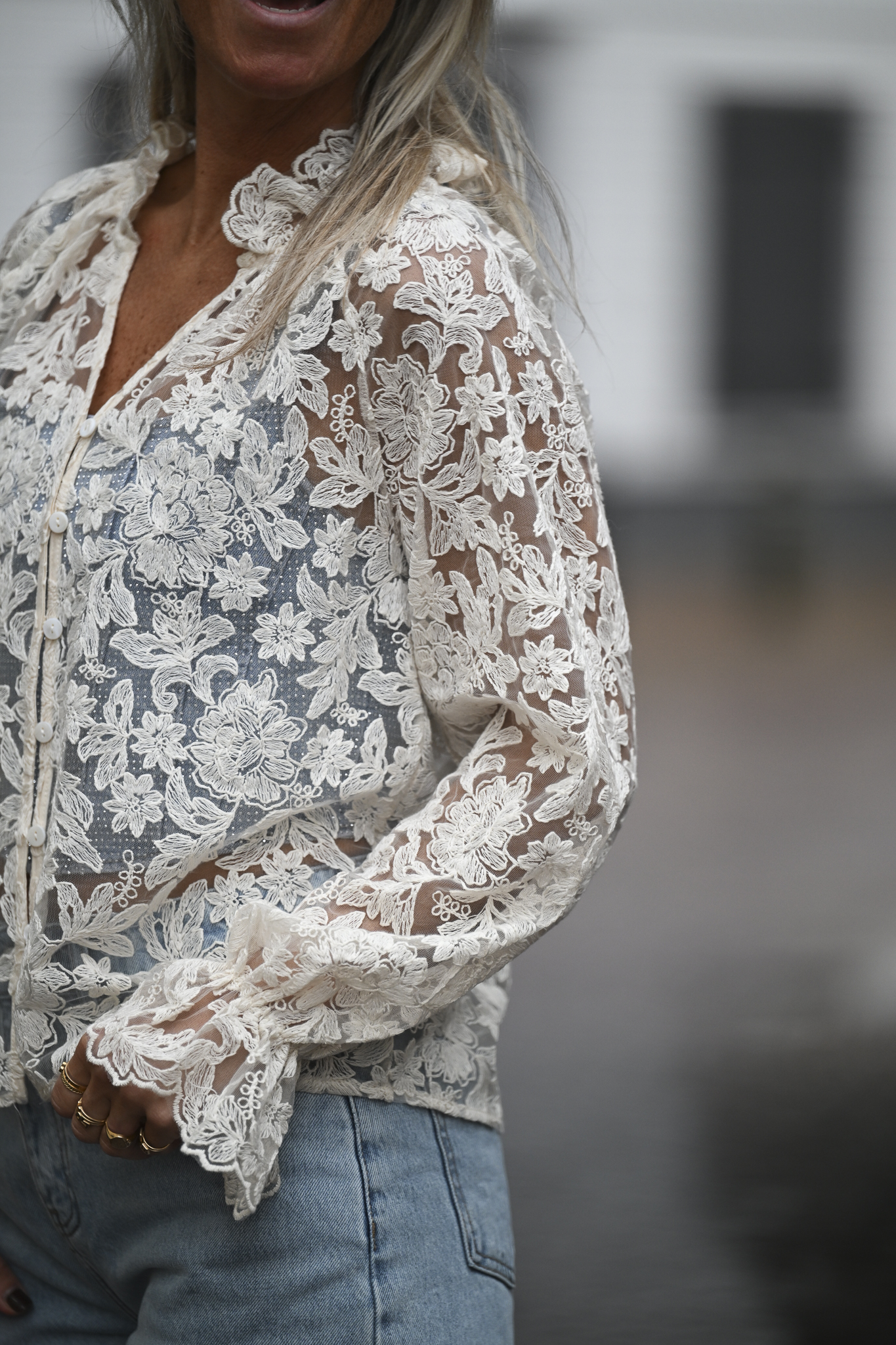 Lace Blouse Maddy heeft pofmouwen met een elastische bandje bij de polsen en een V-hals met daar onder zes knoopjes. Op de foto draag ik maat S/M en ben 1,76 m lang.