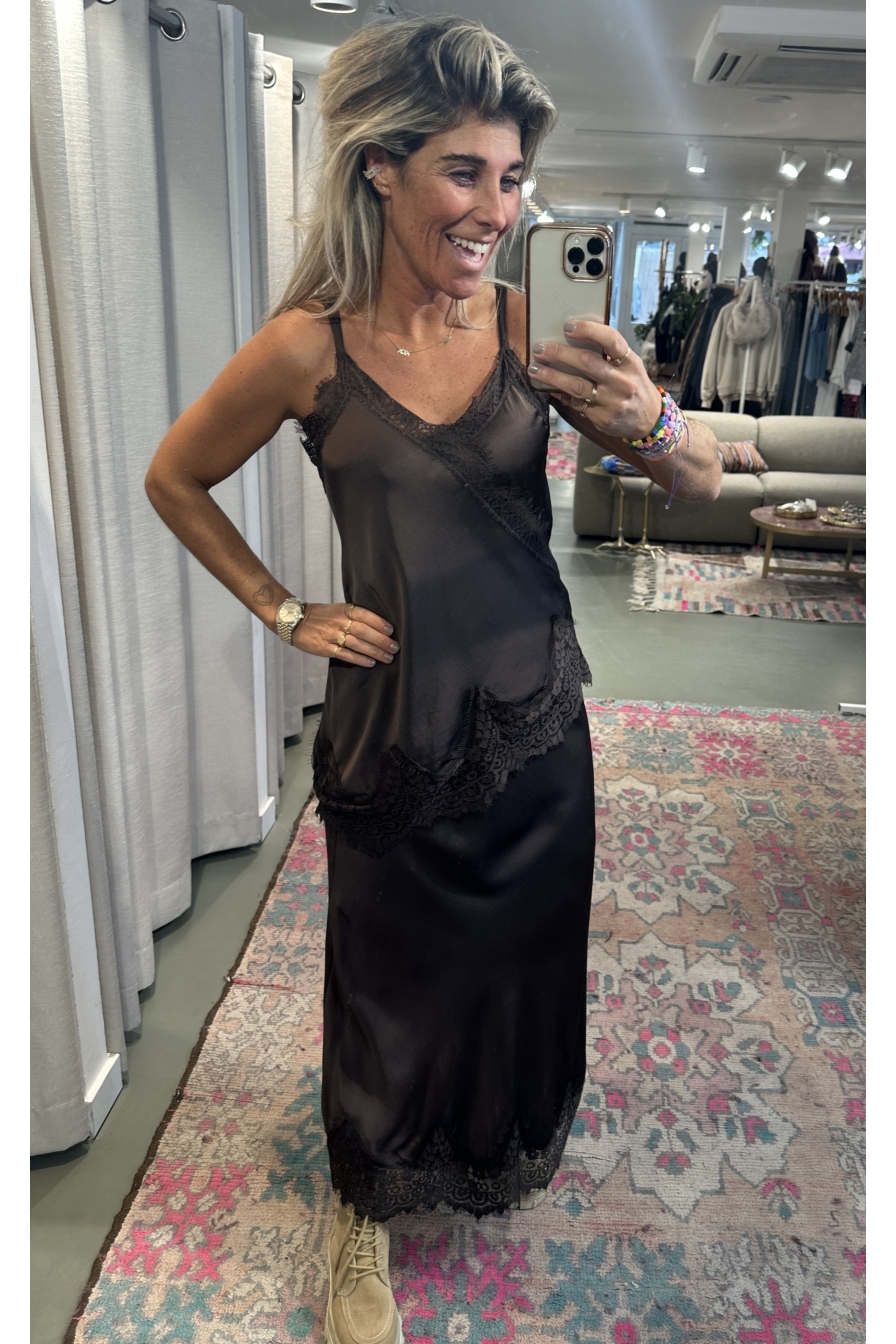 Say no more… deze set wil je! De maxi rok én het bijpassende topje Yara koop je alleen samen als set. De rok is onderaan afgewerkt met een prachtige kanten strook en heeft een elastische band die mooi aansluit. Het topje heeft ook een kanten afwerking en een asymmetrische onderkant die schuin afloopt – supervrouwelijk en net even anders. Beide items zijn gemaakt van een luxe mix van 70% viscose en 30% zijde. Onesize model, draagbaar t/m maat L/XL.