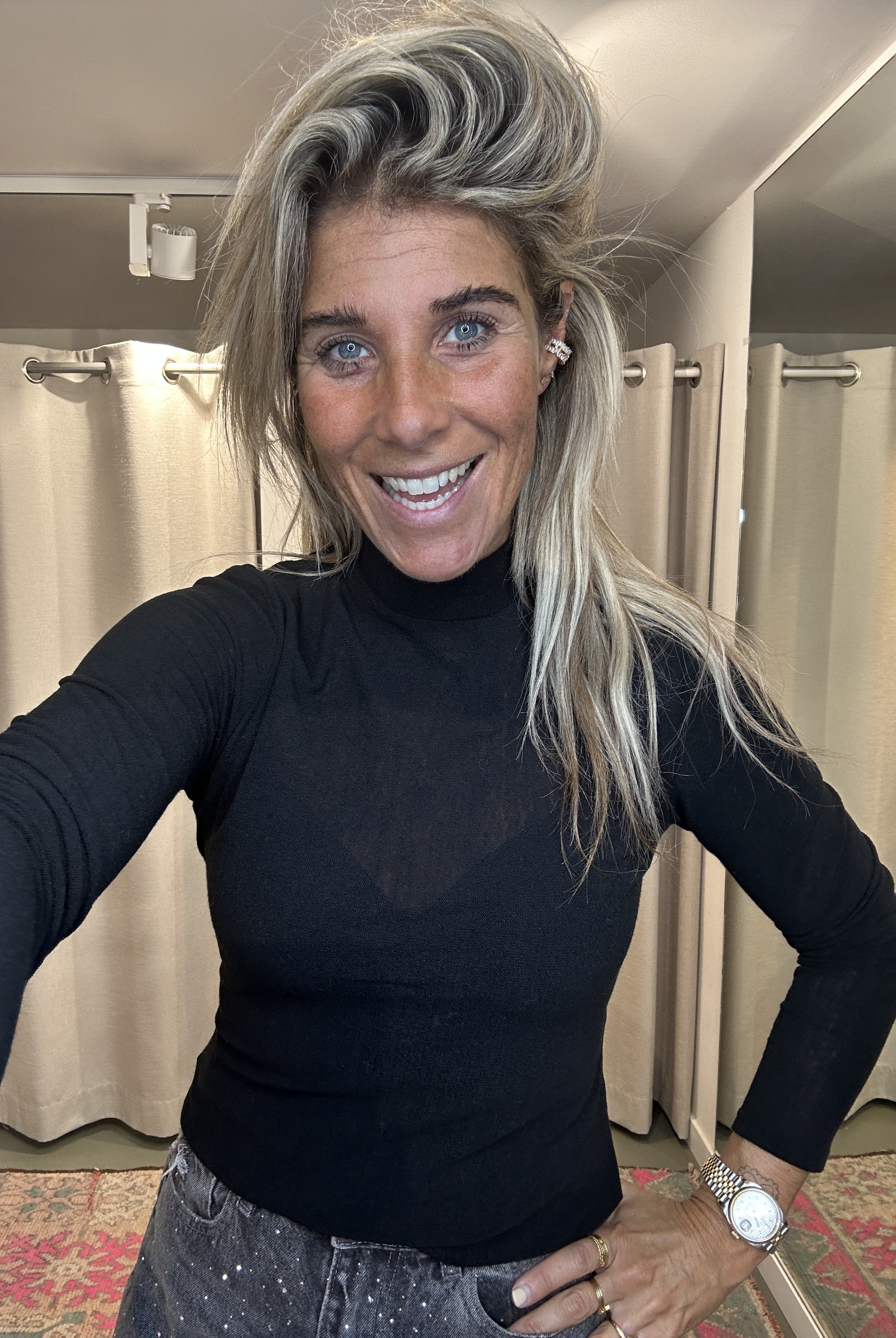 De perfecte basic! Deze mesh top met kleine col draag je moeiteloos onder een colbert of blazer. Licht doorschijnend, zacht en met fijne stretch. Ik draag maat M en ben 1.76m lang.