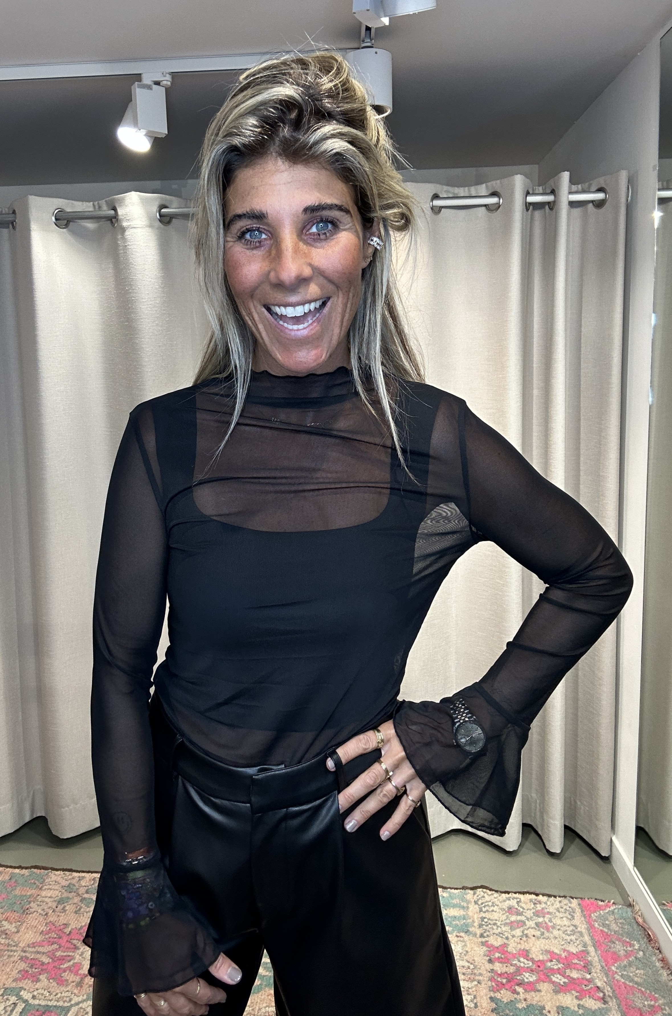 Mesh Top Britt is een topper! Met golvend kraagje en flair mouwuiteindes die ‘m extra speels maken. Ik draag maat S/M op de foto...