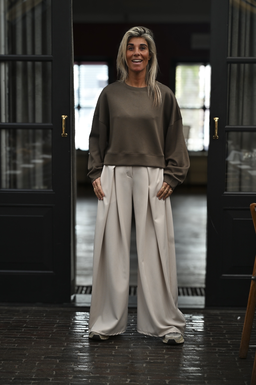 Deze palazzo pantalon valt lekker wijd en zit supercomfy. Dankzij de elastische tailleband past hij van S/M tot XL, en de lange, wijde pijpen geven volop bewegingsvrijheid. Twee steekzakken en de plooien aan de voorkant maken hem helemaal af. Ik ben 1.76 m lang, zo kun je goed inschatten hoe hij bij jou qua lengte valt.