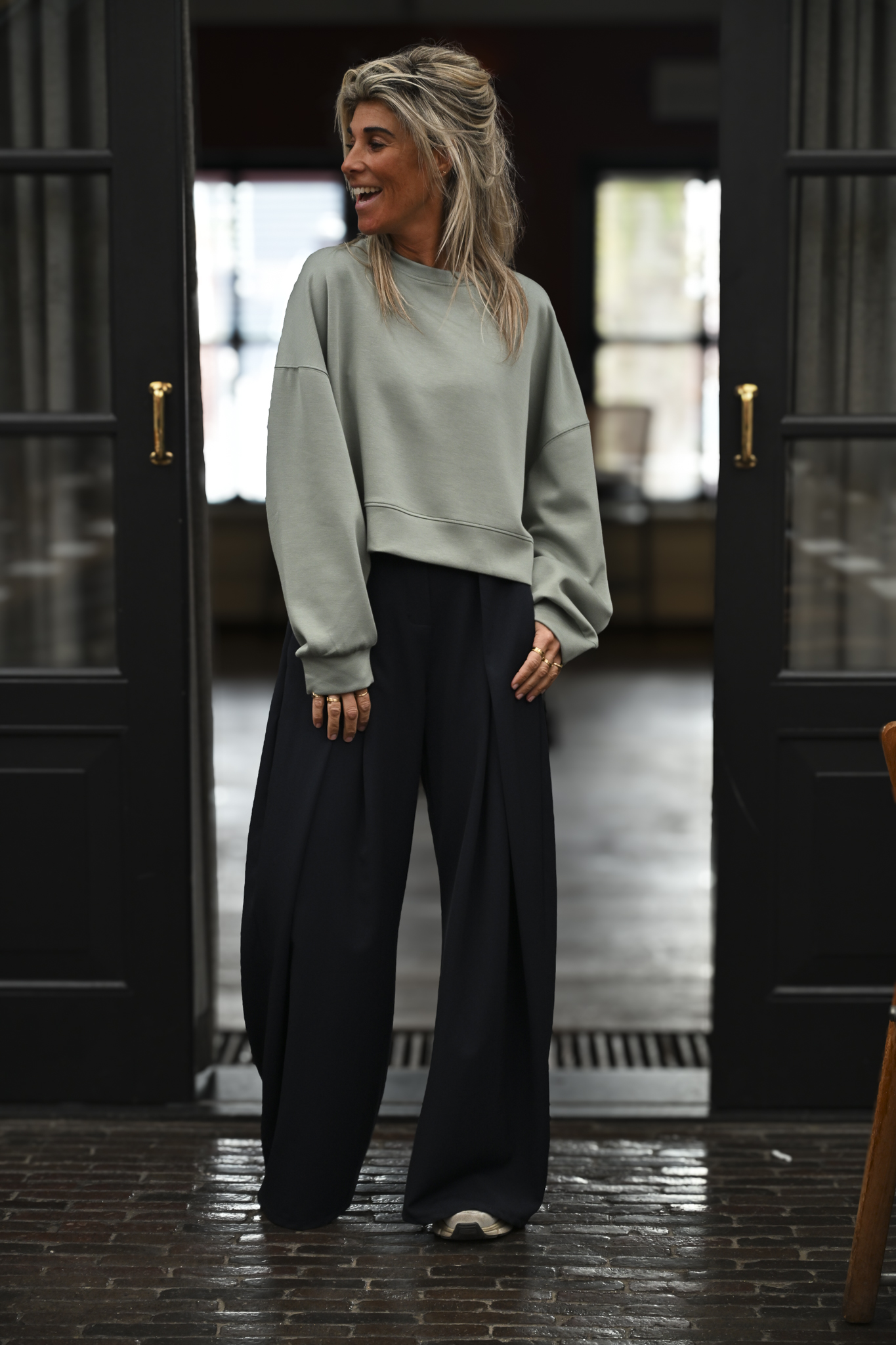Deze palazzo pantalon valt lekker wijd en zit supercomfy. Dankzij de elastische tailleband past hij van S/M tot XL, en de lange, wijde pijpen geven volop bewegingsvrijheid. Twee steekzakken en de plooien aan de voorkant maken hem helemaal af. Ik ben 1.76 m lang, zo kun je goed inschatten hoe hij bij jou qua lengte valt.