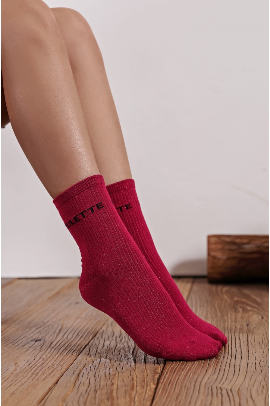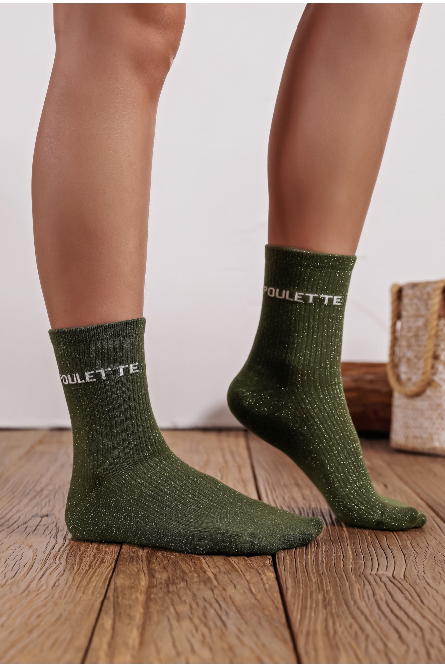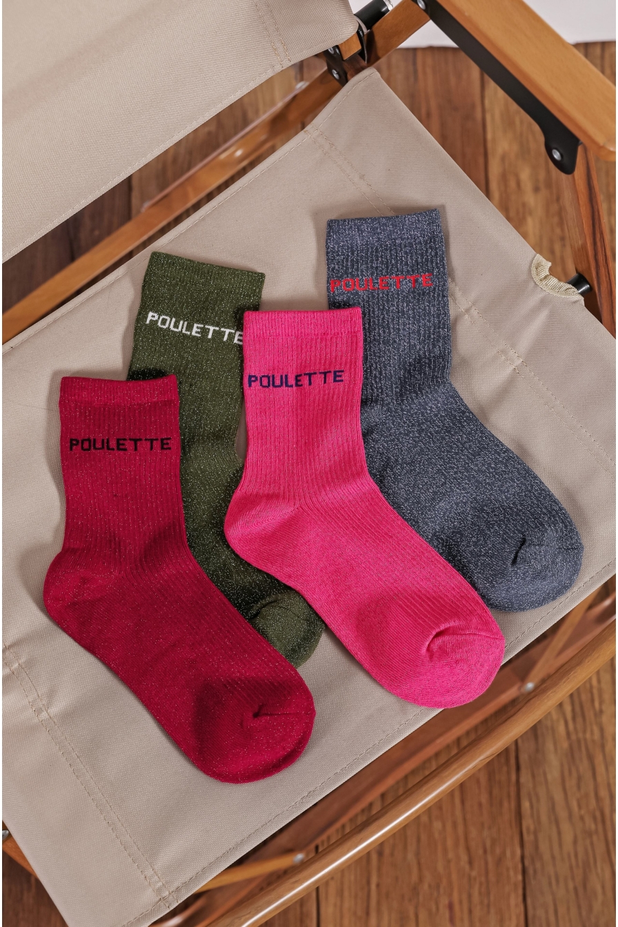 Mixpakket van 4 paar sokken met de tekst Poulette (kippie) in de kleuren roze, rood, grijs en groen. Draagbaar van maat 36 t/m 41....
