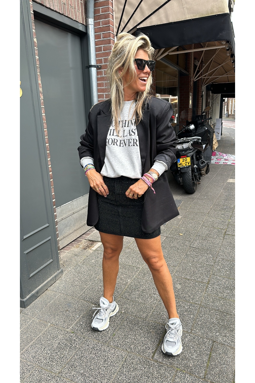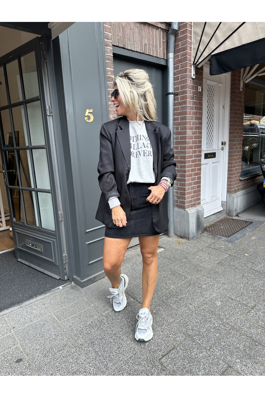 Het Aller Aller mooiste denim rokje ever. Dit Denim rokje moet je gewoon hebben dit seizoen. De voorkant is volledig voorzien van zwarte studs en de achterkant is plane. Model draagt een maat M en rokje valt perfect op maat.