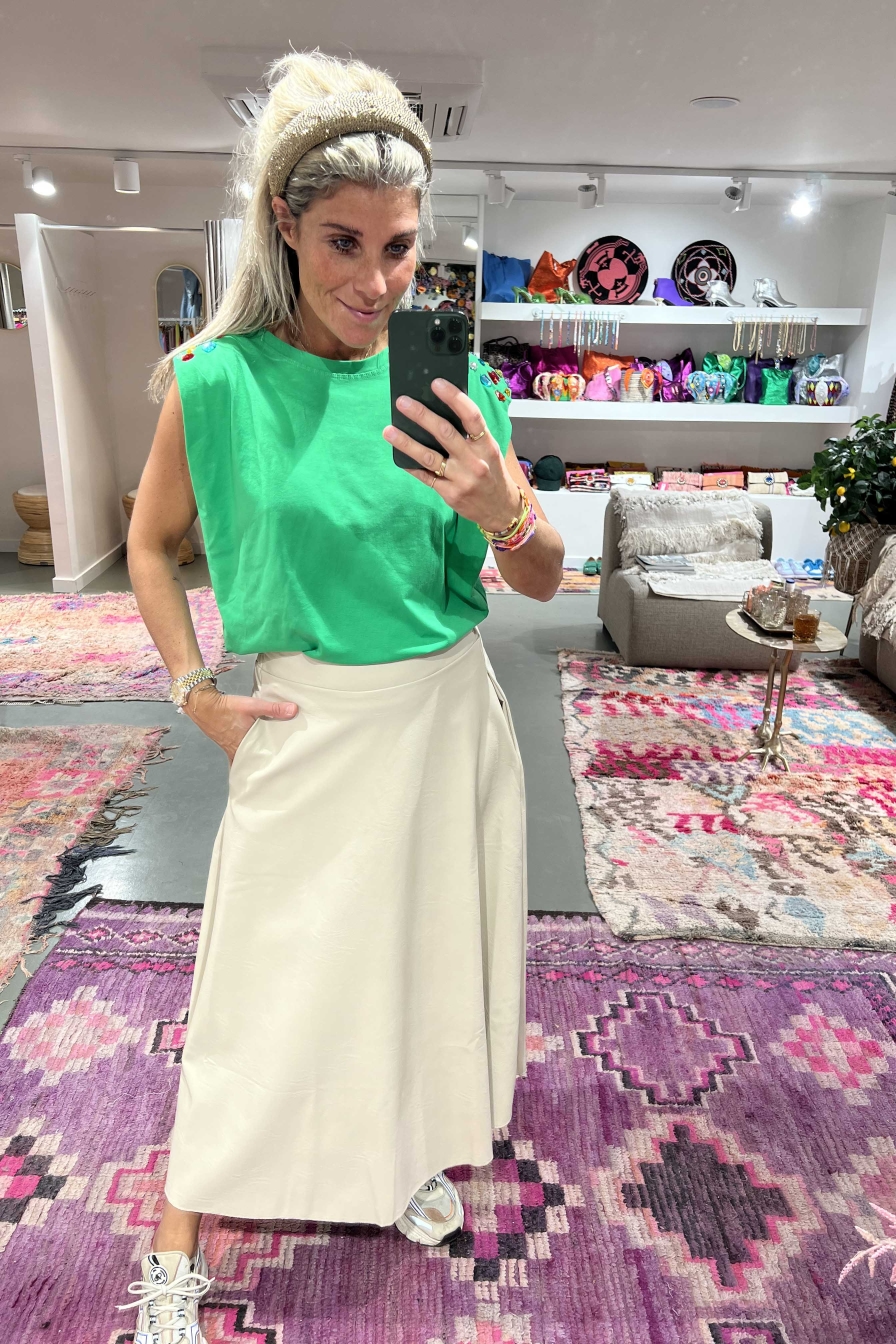 Find your inner rock-star met deze (vegan) leather-look maxi rok! Door de insteekzakken en elastiekband in de taille is deze comfortabel te dragen en te combineren met je favoriete top of blouse!