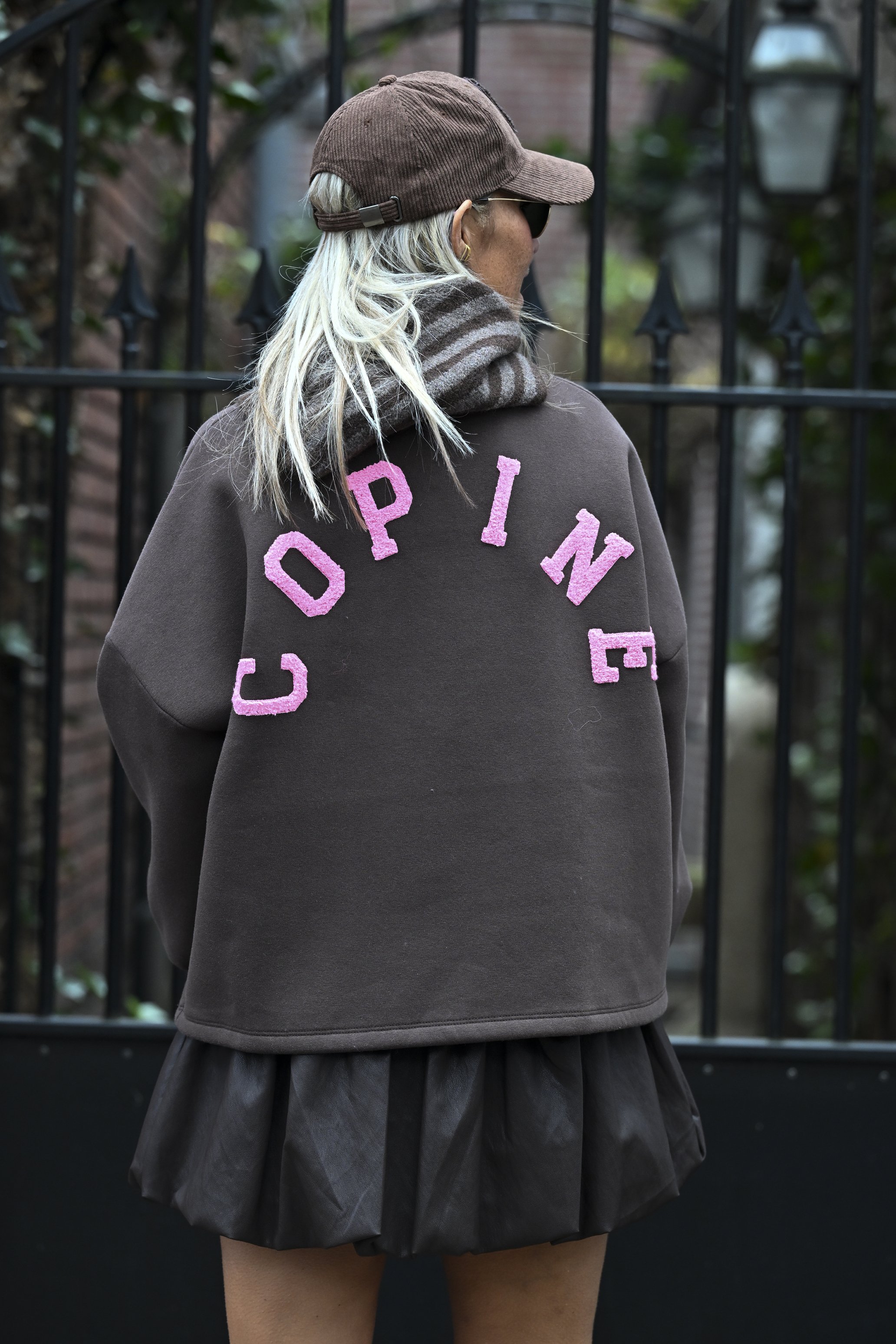 Bruin vegan leren pofrokje met elastiek en trekkoord, comfy en streetstyle-ready. Valt (ruim) boven de knie, on point met maat M op...