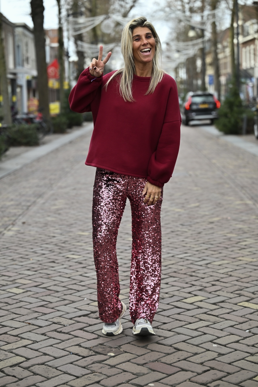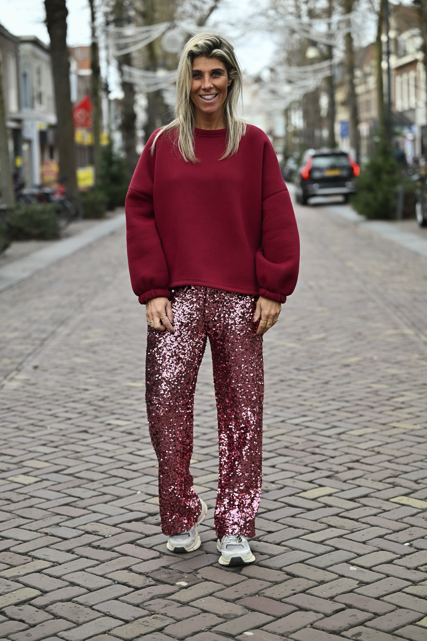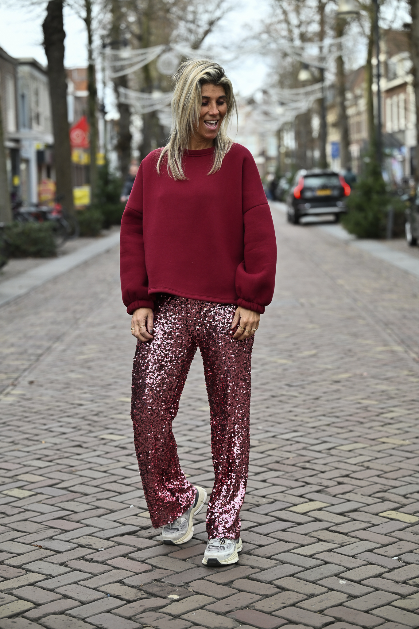De Esmee Rose broek is een echte topper. Heeft een elastische tailleband, valt goed op maat en is gevoerd, waardoor je de pailletten niet tegen je benen voelt. Op de foto draag ik maat S/M. en ik ben 1,76m. Comfort + sparkle = yes !