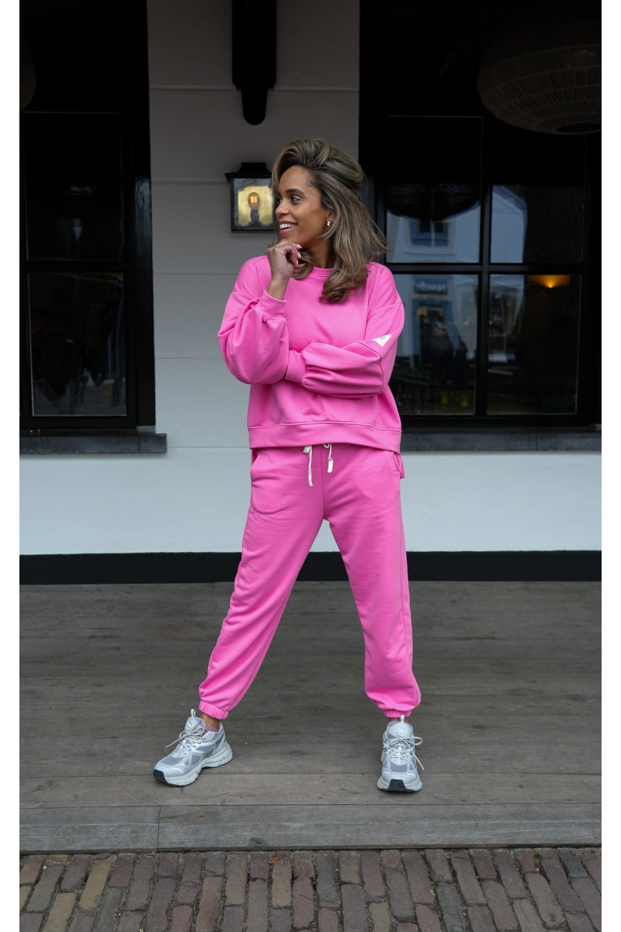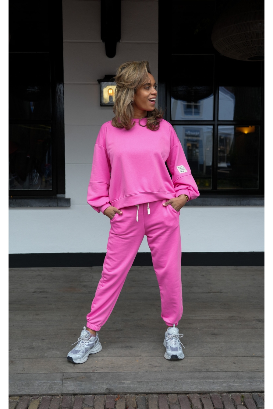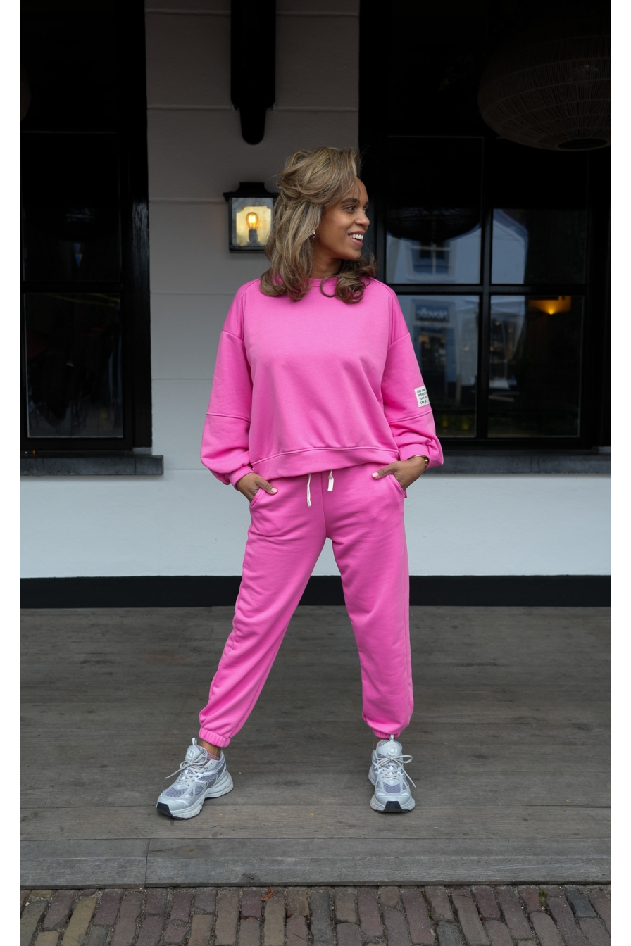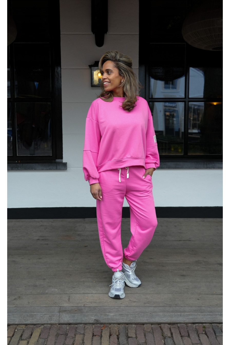 Life isnt perfect but your outfit can be! Dit jogging pak mag absoluut niet ontbreken in je garderobe. Deze set bestaat uit twee delen: een comfy sweater en broek, gemaakt van 80% katoen en 20% poly. Dit stijlvolle onesize-model is draagbaar tot en met maat 42 en biedt ultiem comfort met een trendy twist! Model is 1.76 lang.