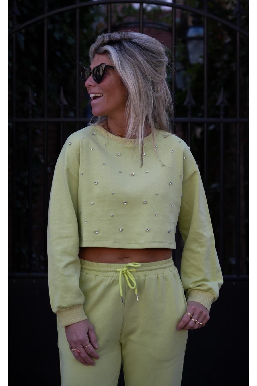 De set Shine laat je stralen! Deze set bestaat uit een broek en een cropped sweater met stevig vastgemaakte sparkling details. De sweater is one-size, terwijl de broek verkrijgbaar is in S en M. Met mijn 1,76m draag ik maat M op de foto.