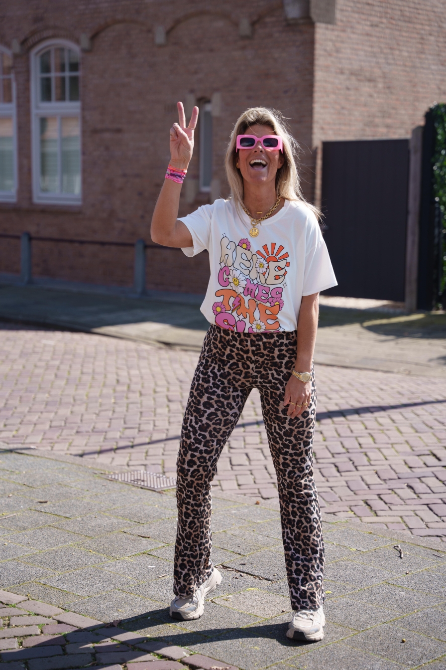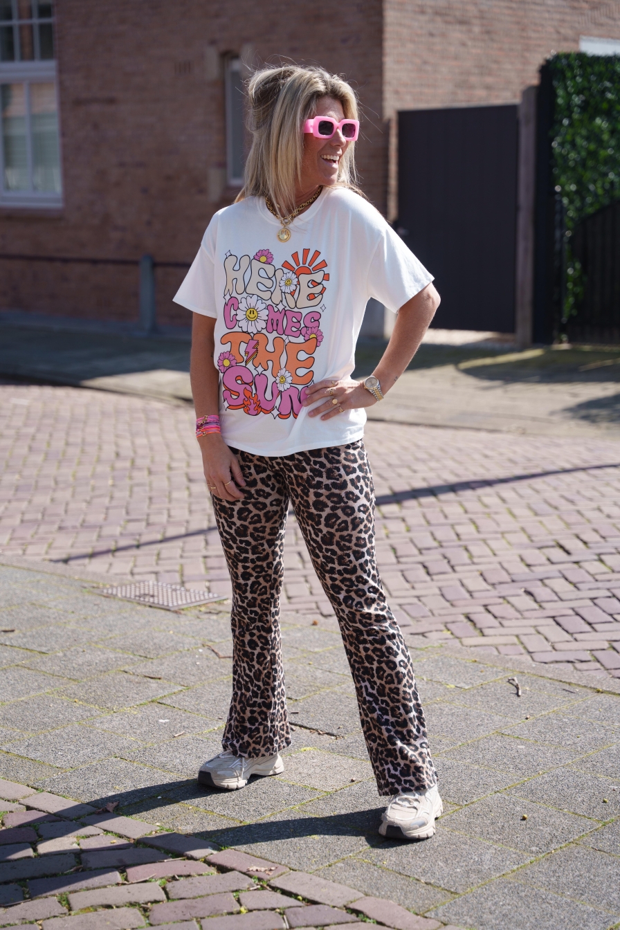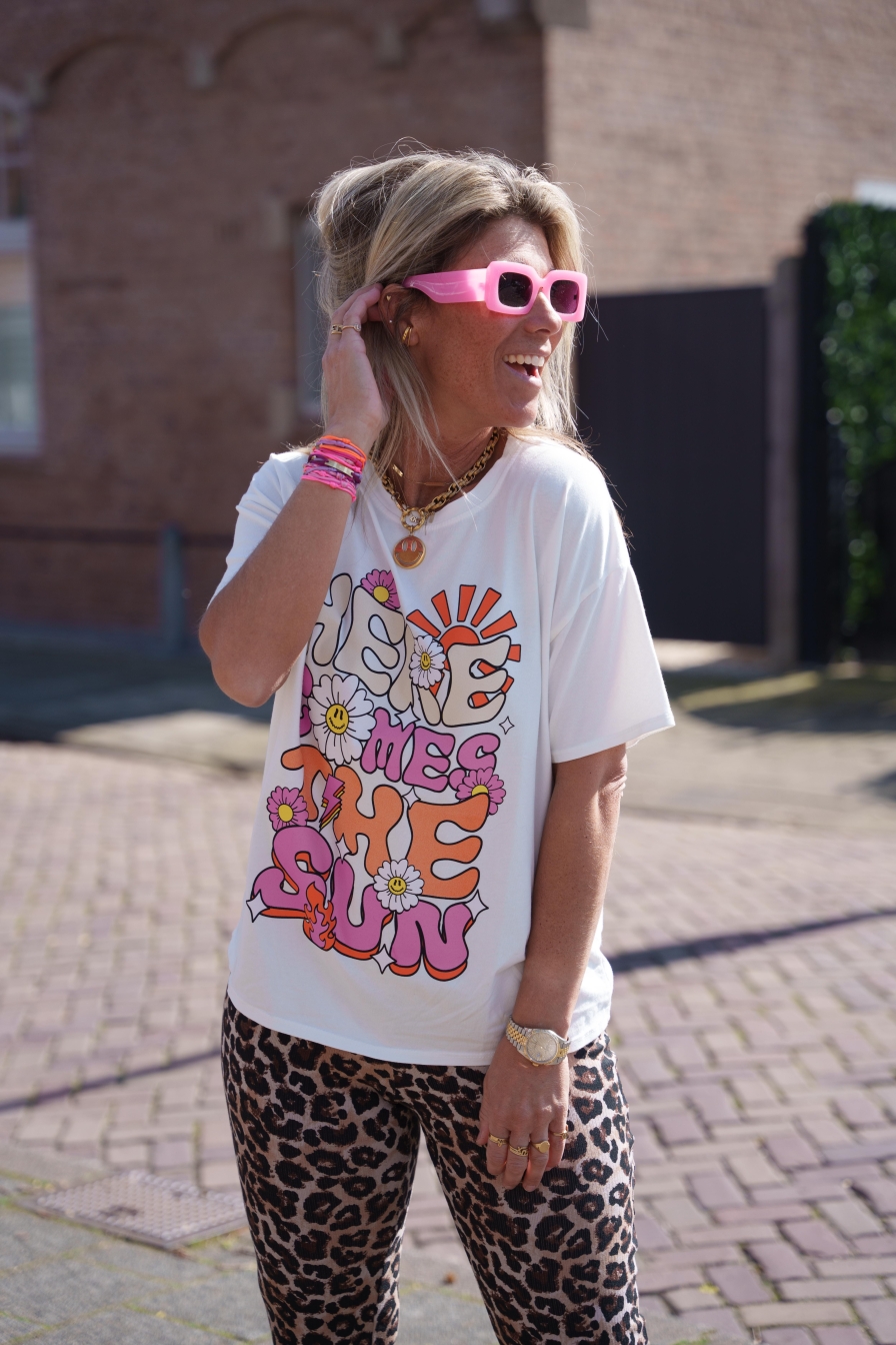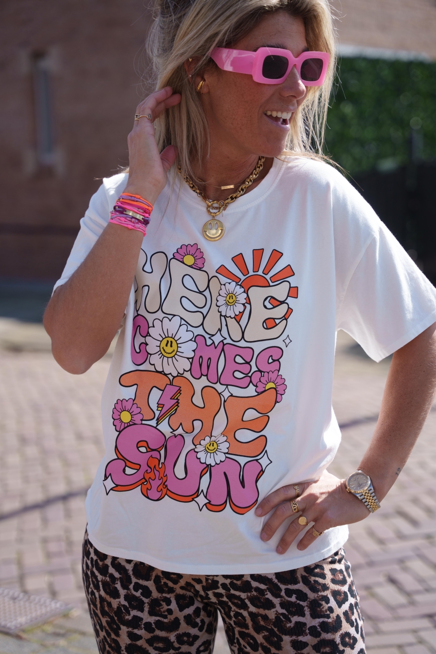 Wit shirt met de vrolijke tekst HERE COMES THE SUN! Gemaakt van 100% katoen, dus heerlijk comfortabel. Met zijn onesize pasvorm past dit shirt comfortabel vanaf maat XS tot en met L.